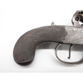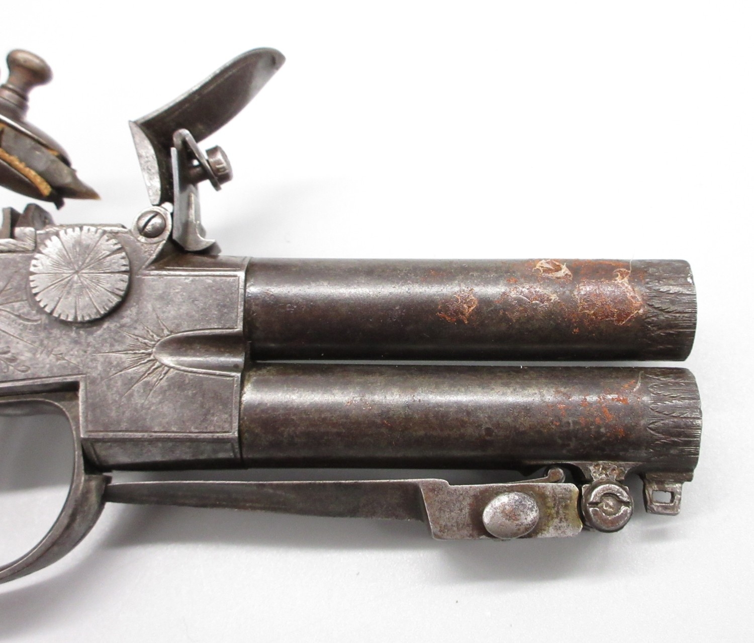 54 bore flintlock tap-action over and under pocket pistol by `T. Whitehouse West Bromwich' 2.75" turn off barrels with star cut muzzles, 2" sprung bayonet with trigger guard release, stamped proof marks and engraved makers details to the lock, top slide safety, 21cm overall.