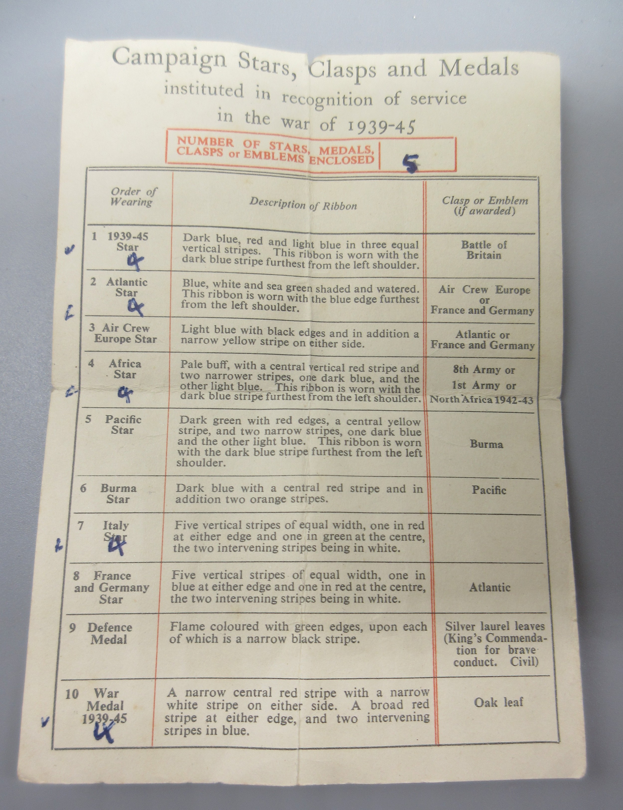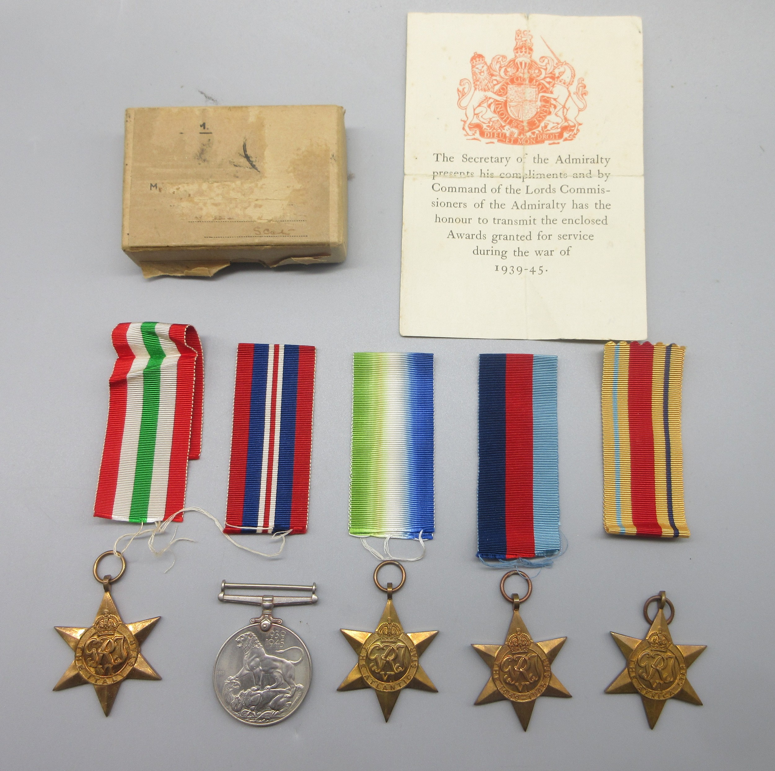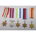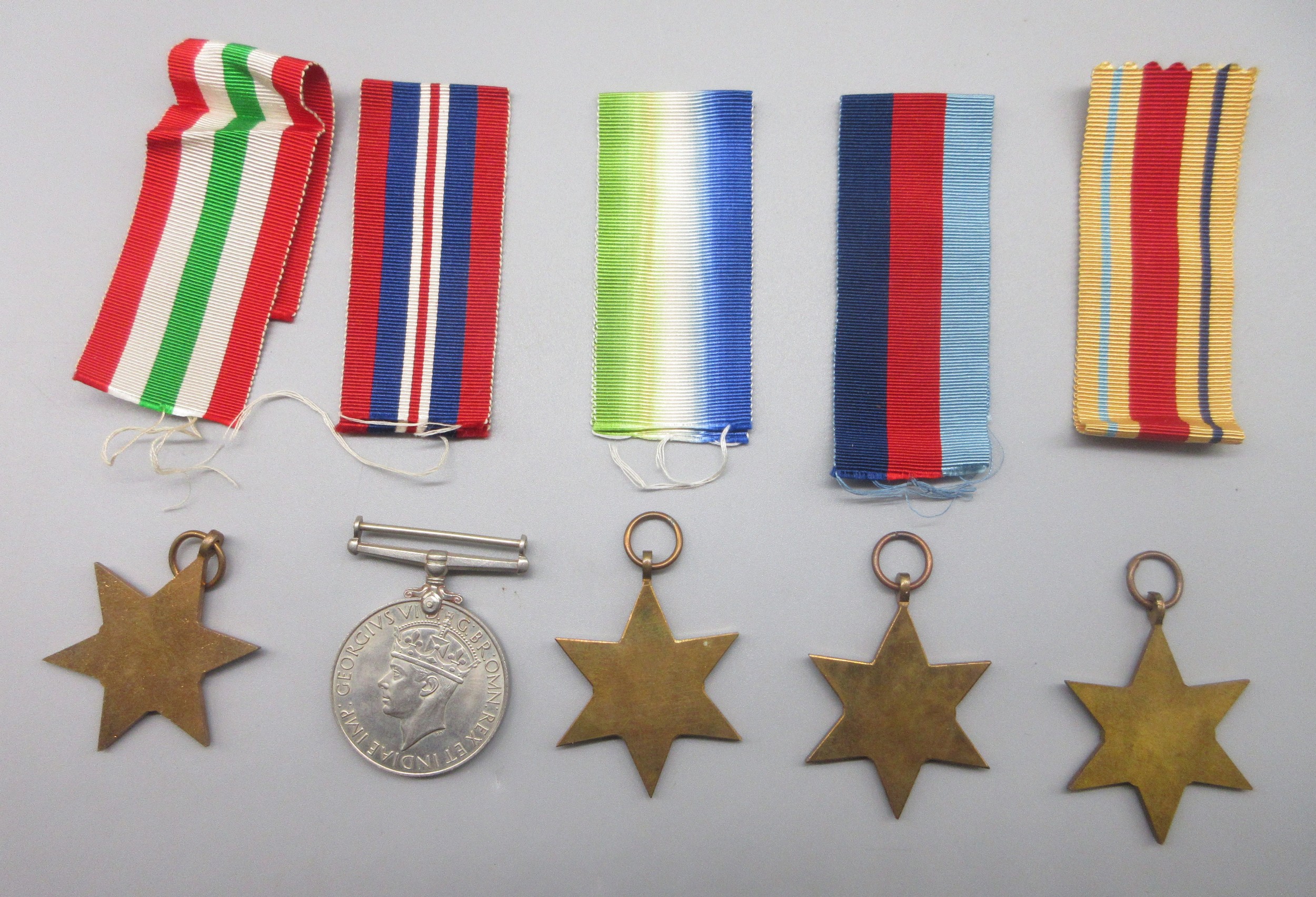 Collection of WW2 medals incl. 1939-45 star, Atlantic star, Africa star, Italy star and 1939-45 war medal, recipient unknown, with post box and award certificate (5)