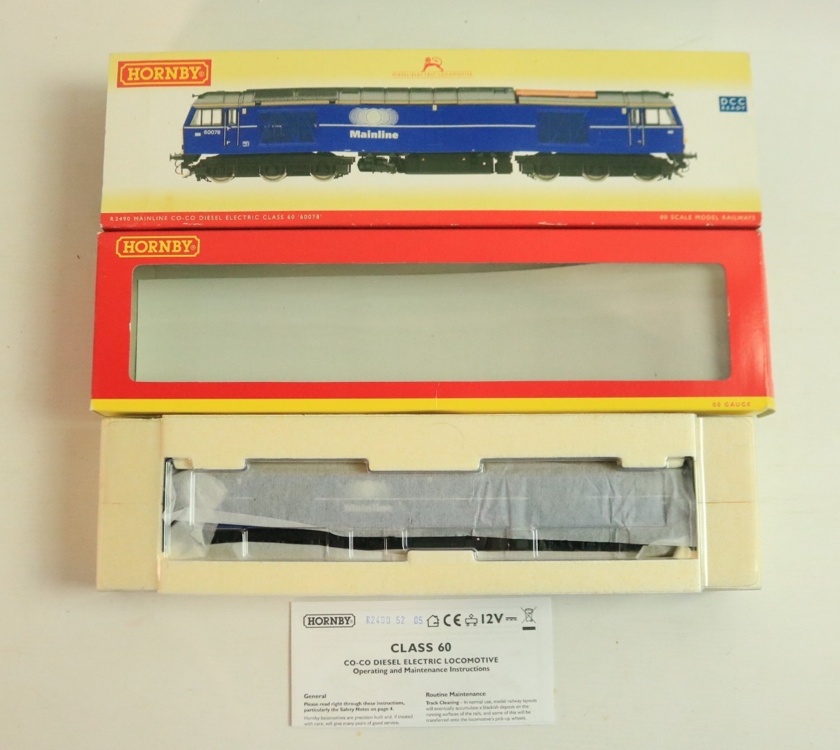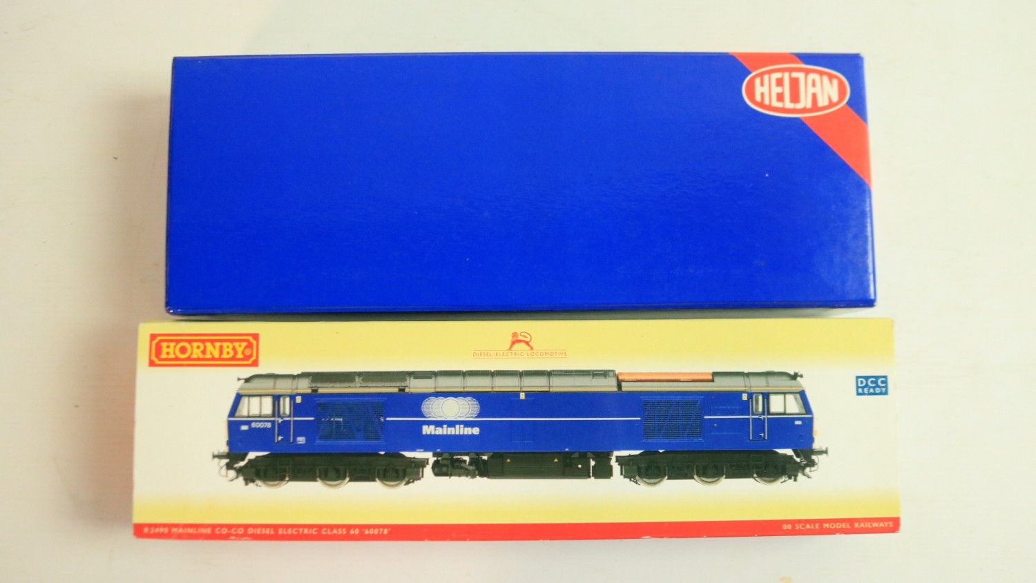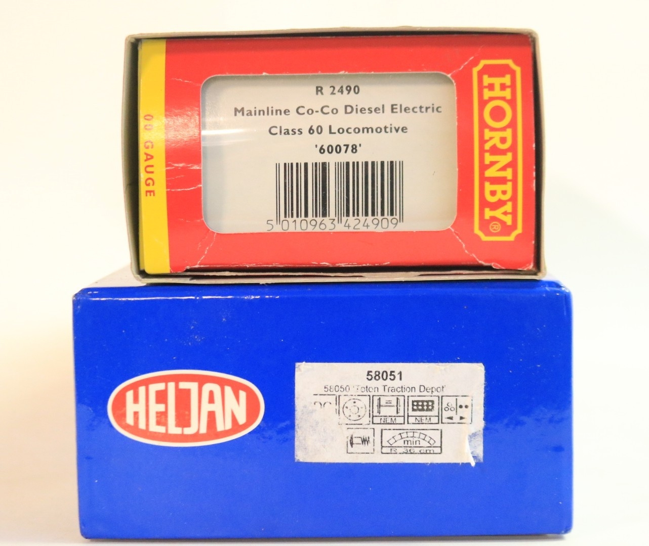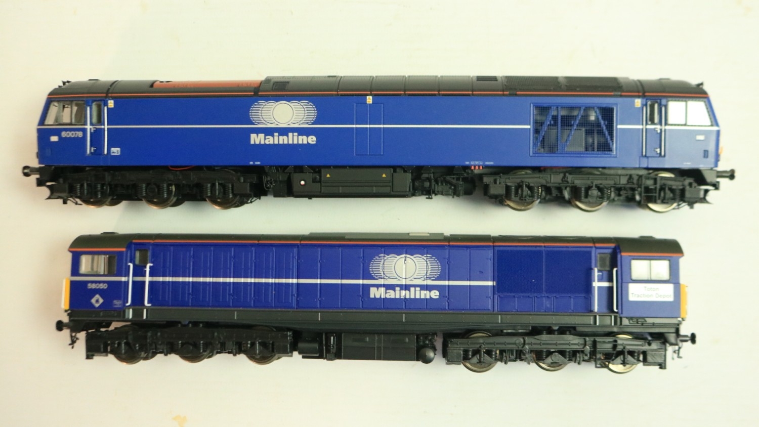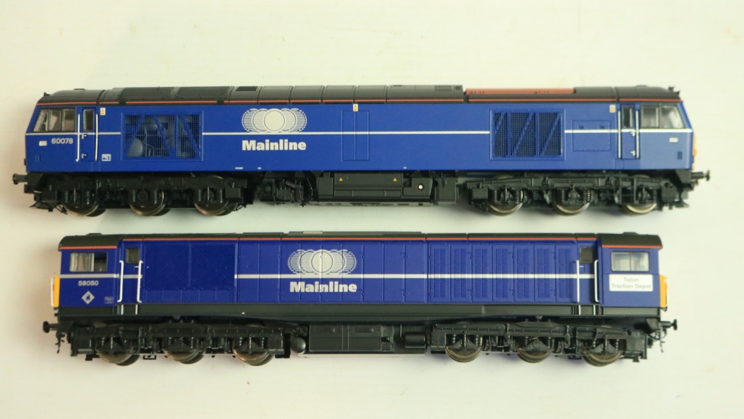 Two OO gauge Mainline liveried diesel electric locomotive models to include Hornby R2490 Class 60 '60078' (model mint with unused/sealed accessory bag) and Heljan 58051 Class 58 'Toton Traction Depot' 58050 (finer accessories fitted, model in near mint overall condition), both with instructions, boxes at least good with storage wear