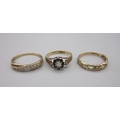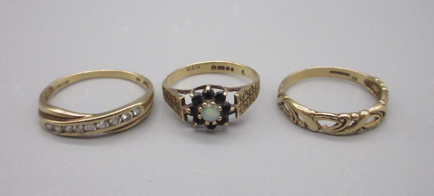 9ct hallmarked opal and 8 stone cluster ring, size L 1/2, 9ct hallmarked 9 stone ring, size R and a 9ct hallmarked ring (4.4g)
