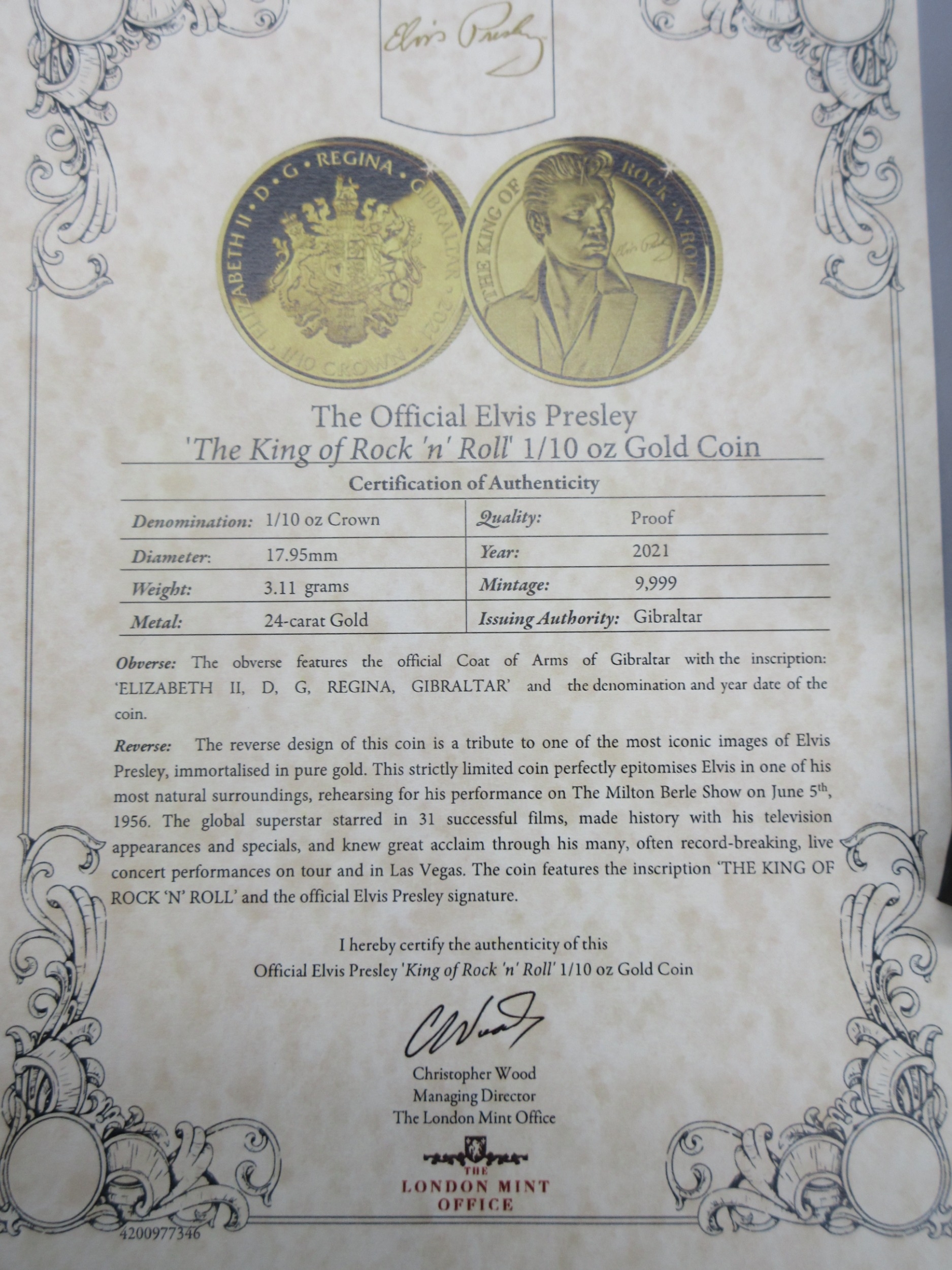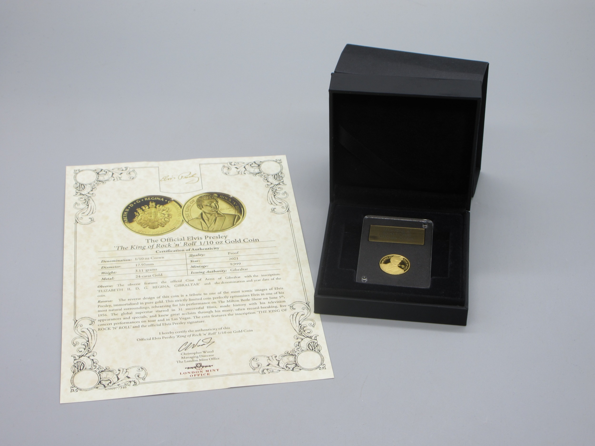 The King of Rock 'n' Roll 1/10oz Crown (24ct) encapsulated in case with COA