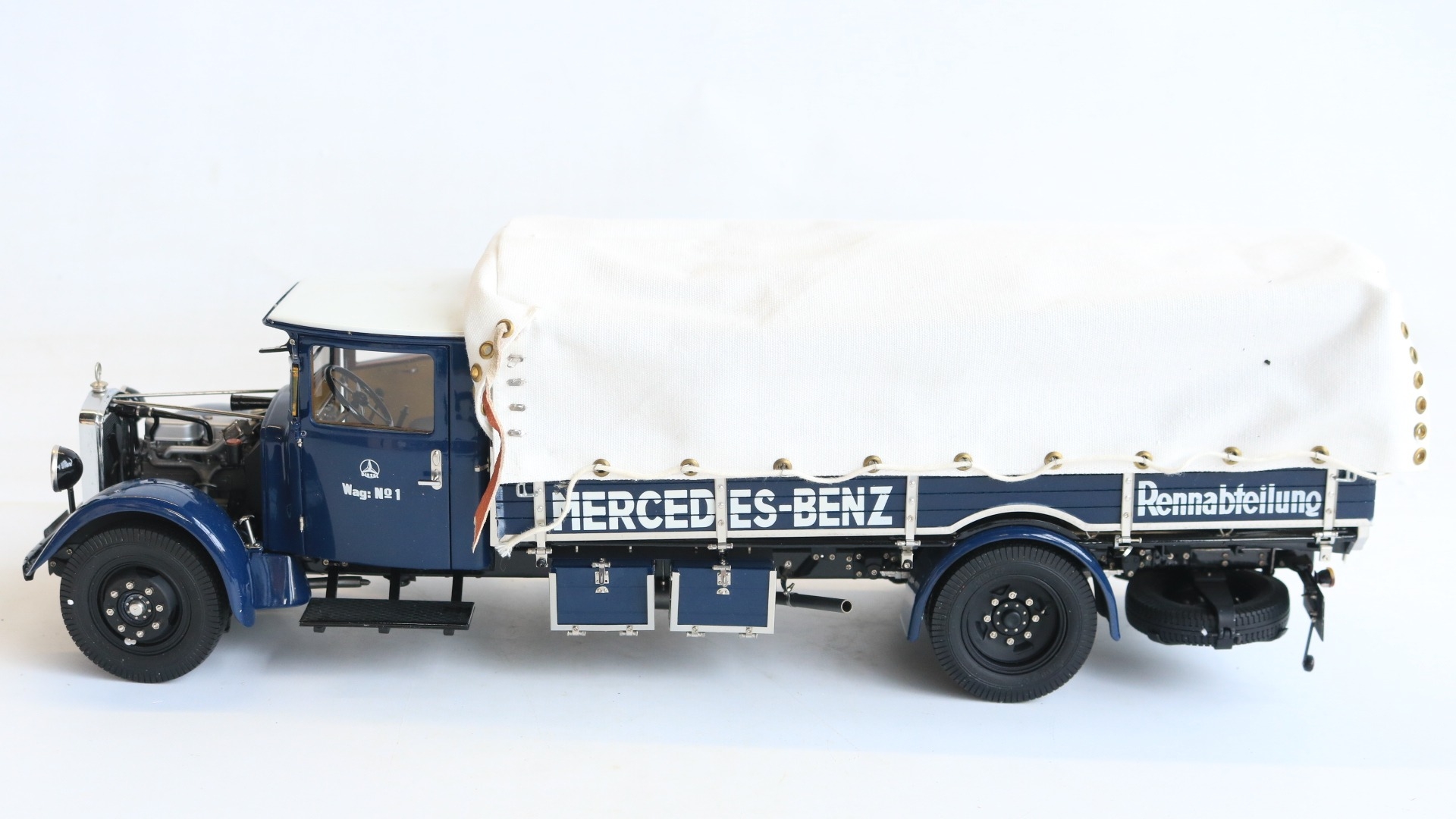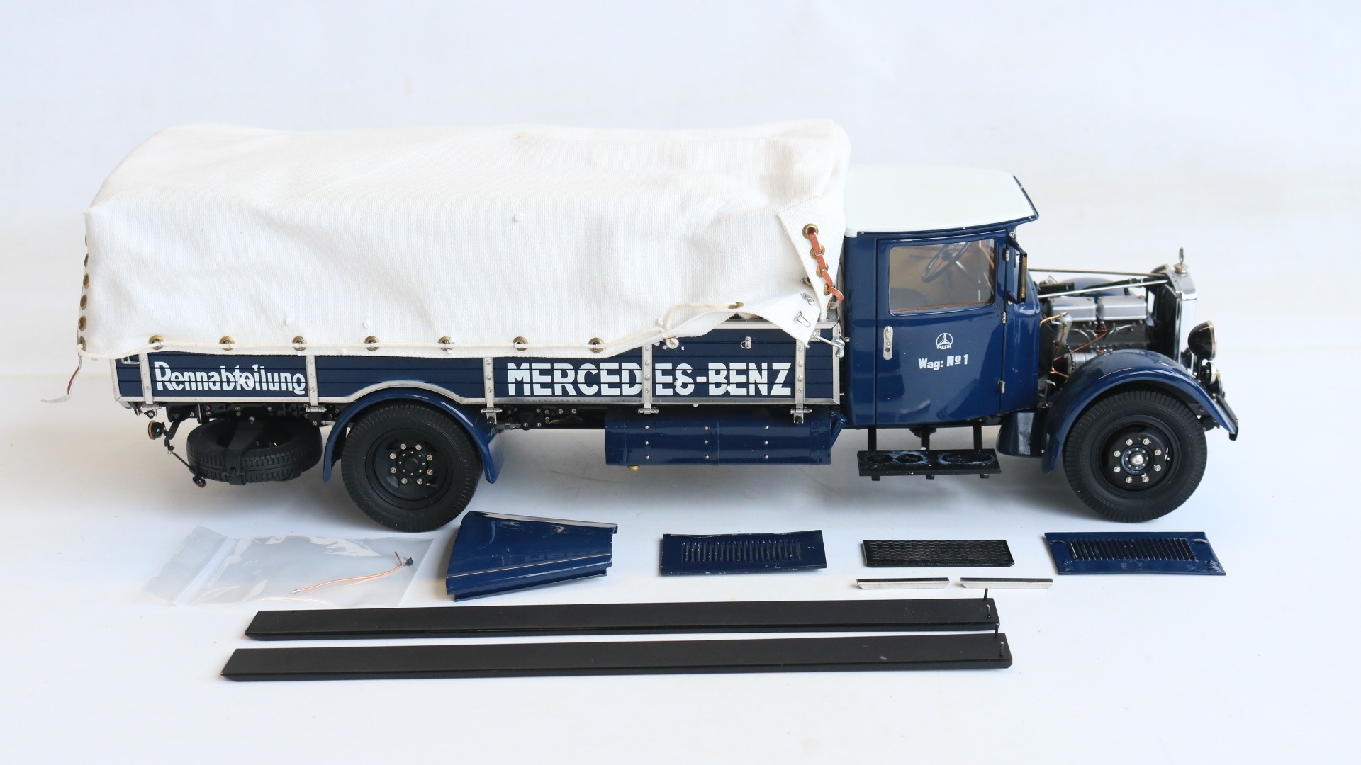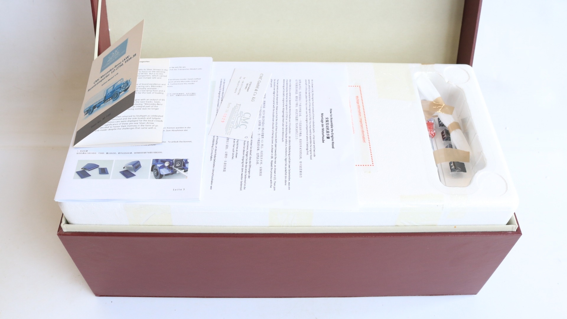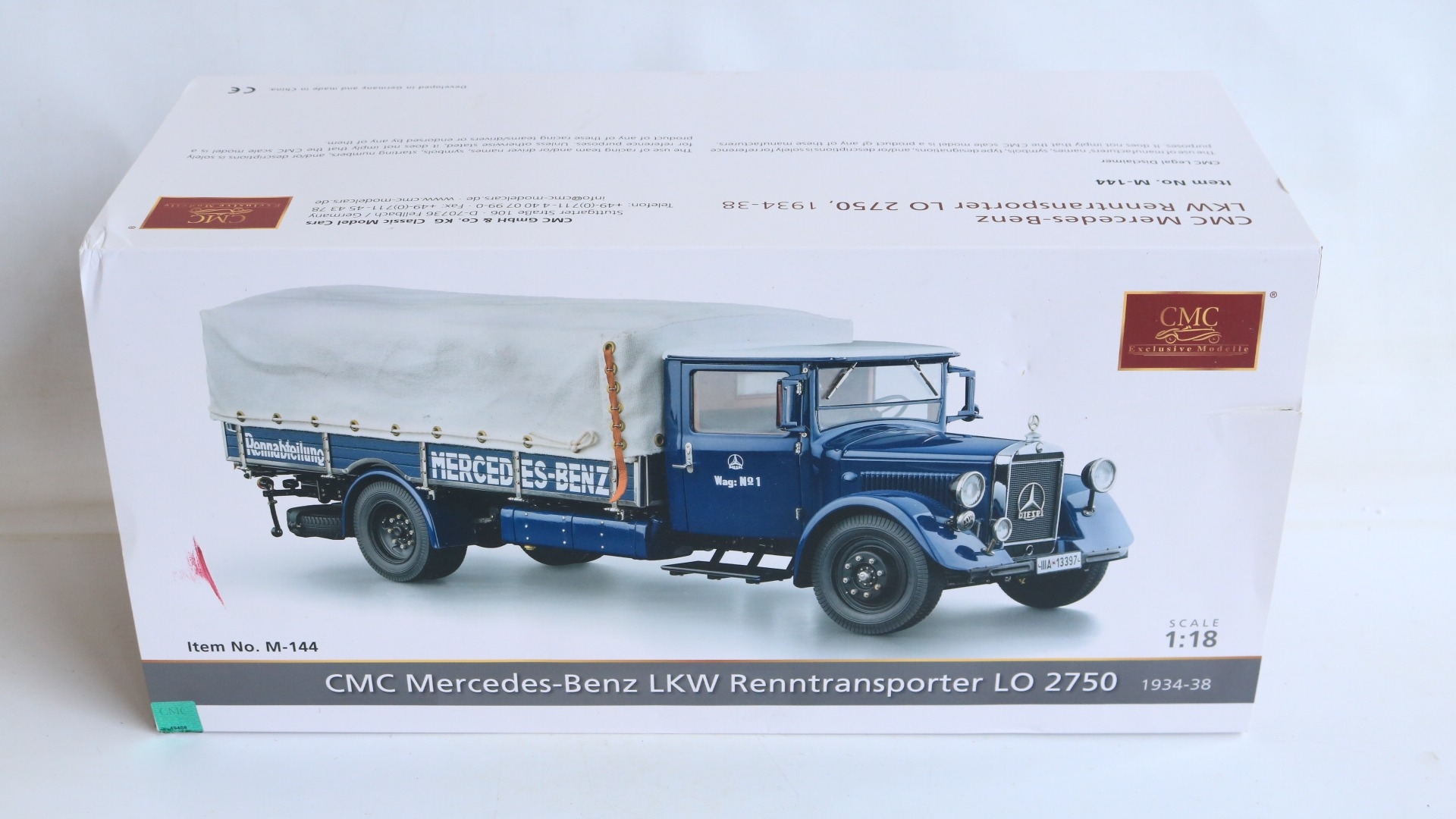 CMC 1/18 scale M-144 Mercedes-Benz Renntransporter LO 2750, 1934-38 highly detailed diecast metal truck model, overall condition is good but please note there is some damage and detached parts, for example right side cab door handle snapped off and missing, some trim parts have partially or fully come away, one windscreen wiper bent, some dents to upper bonnet cover etc., also please note inner box tray securing lugs snapped with top sections still screwed into the model, all loose parts since bagged, inner presentation box very good, outer card sleeve good with some crush damage, marks and tears, complete with paperwork/instructions etc.