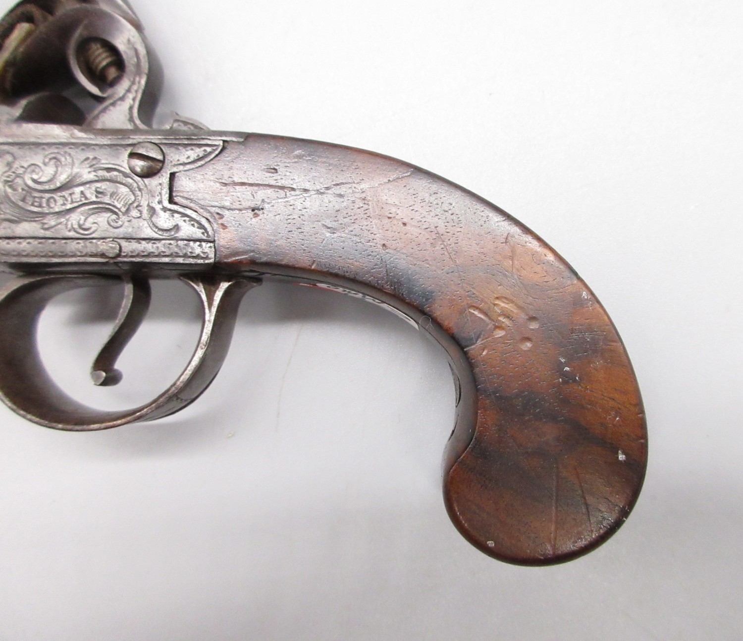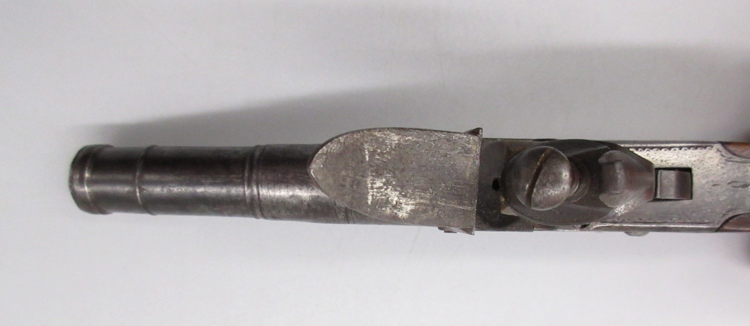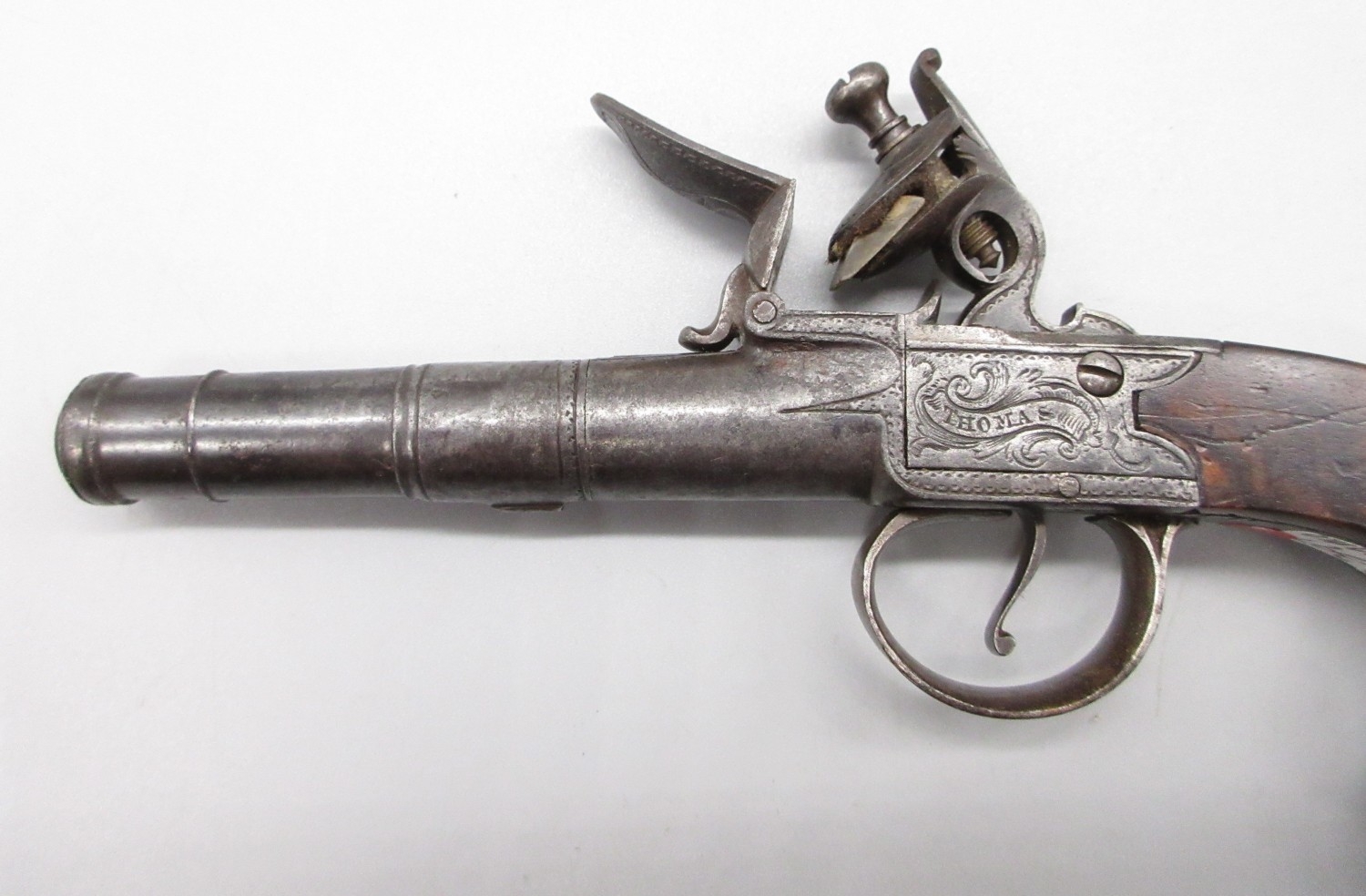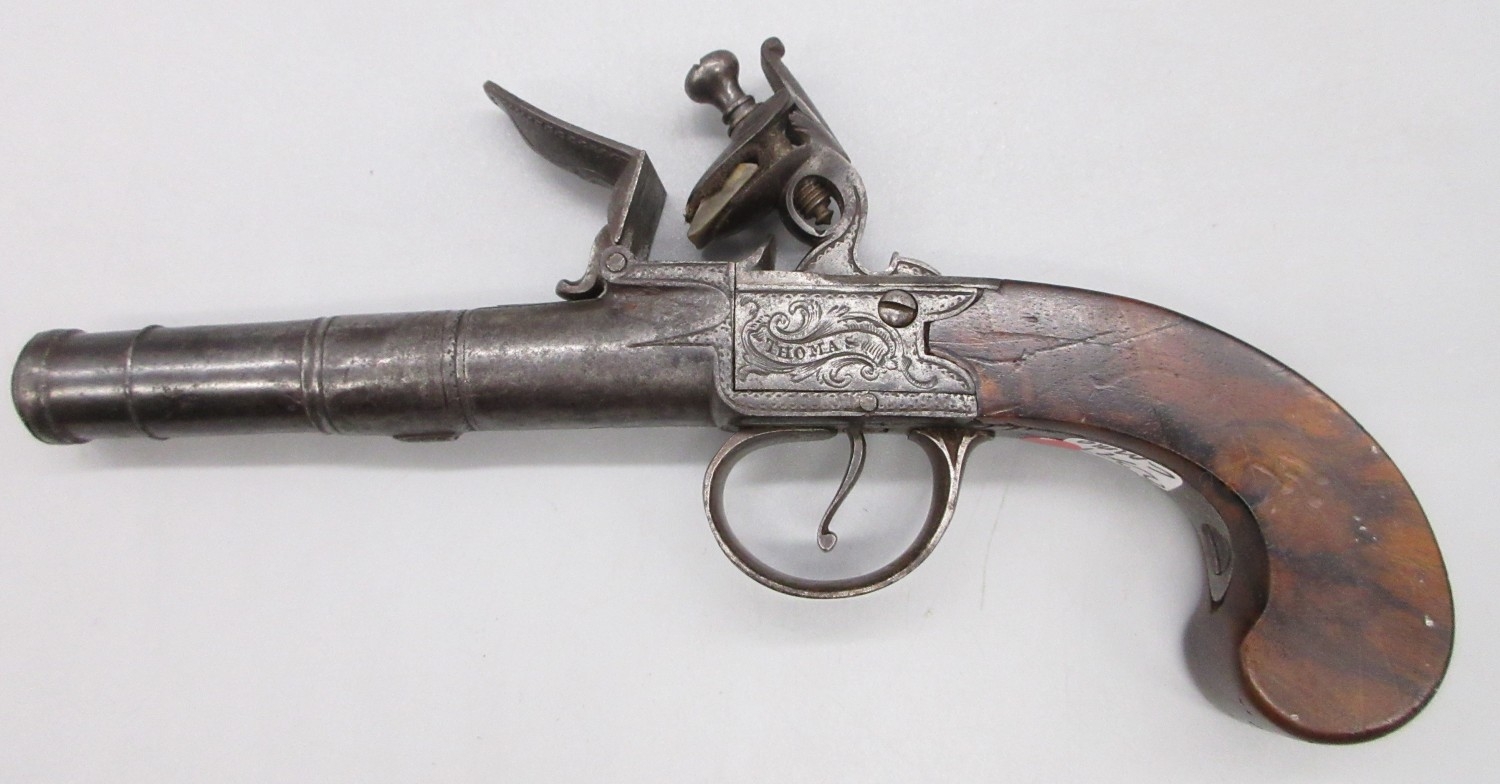 54 bore flintlock cannon barrel pocket pistol by `Thomas', 2.5" turn-off staged cannon barrel, stamped proof marks, named lock and well figured walnut grip, 18.5cm overall.