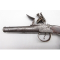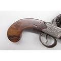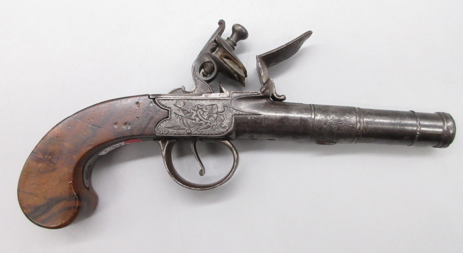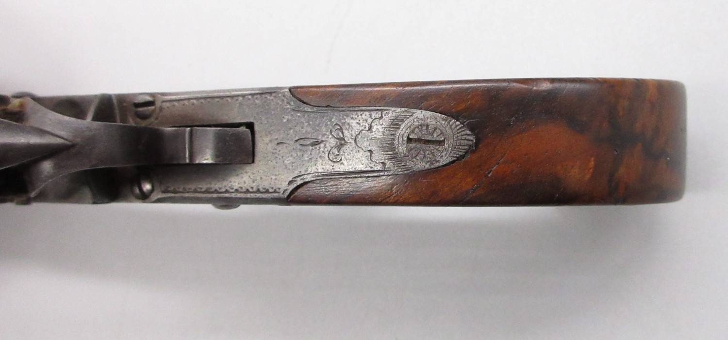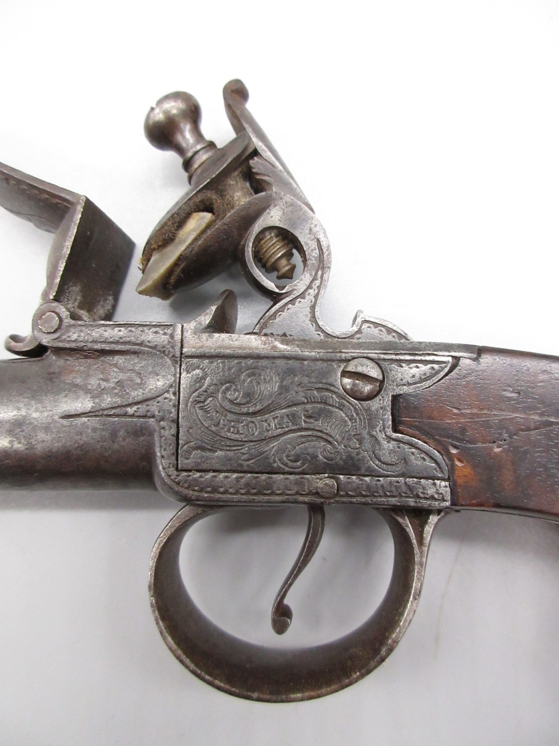 54 bore flintlock cannon barrel pocket pistol by `Thomas', 2.5" turn-off staged cannon barrel, stamped proof marks, named lock and well figured walnut grip, 18.5cm overall.