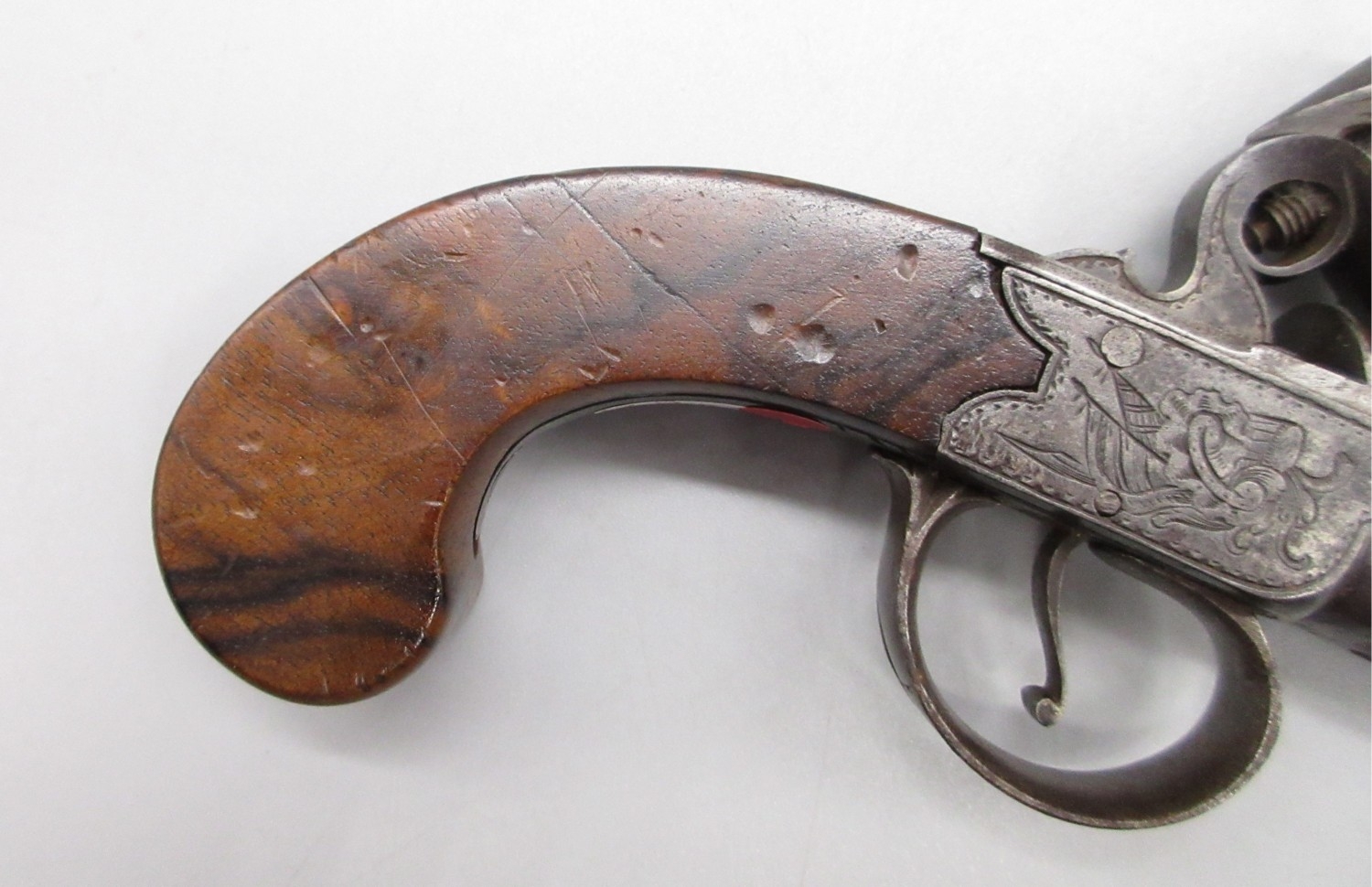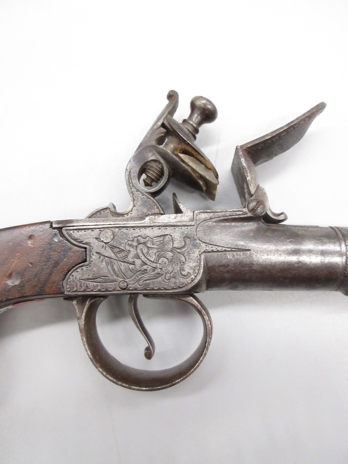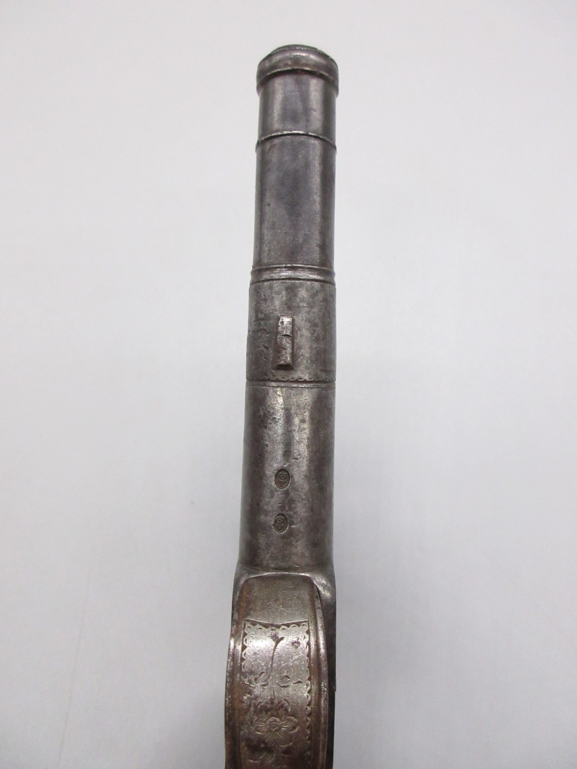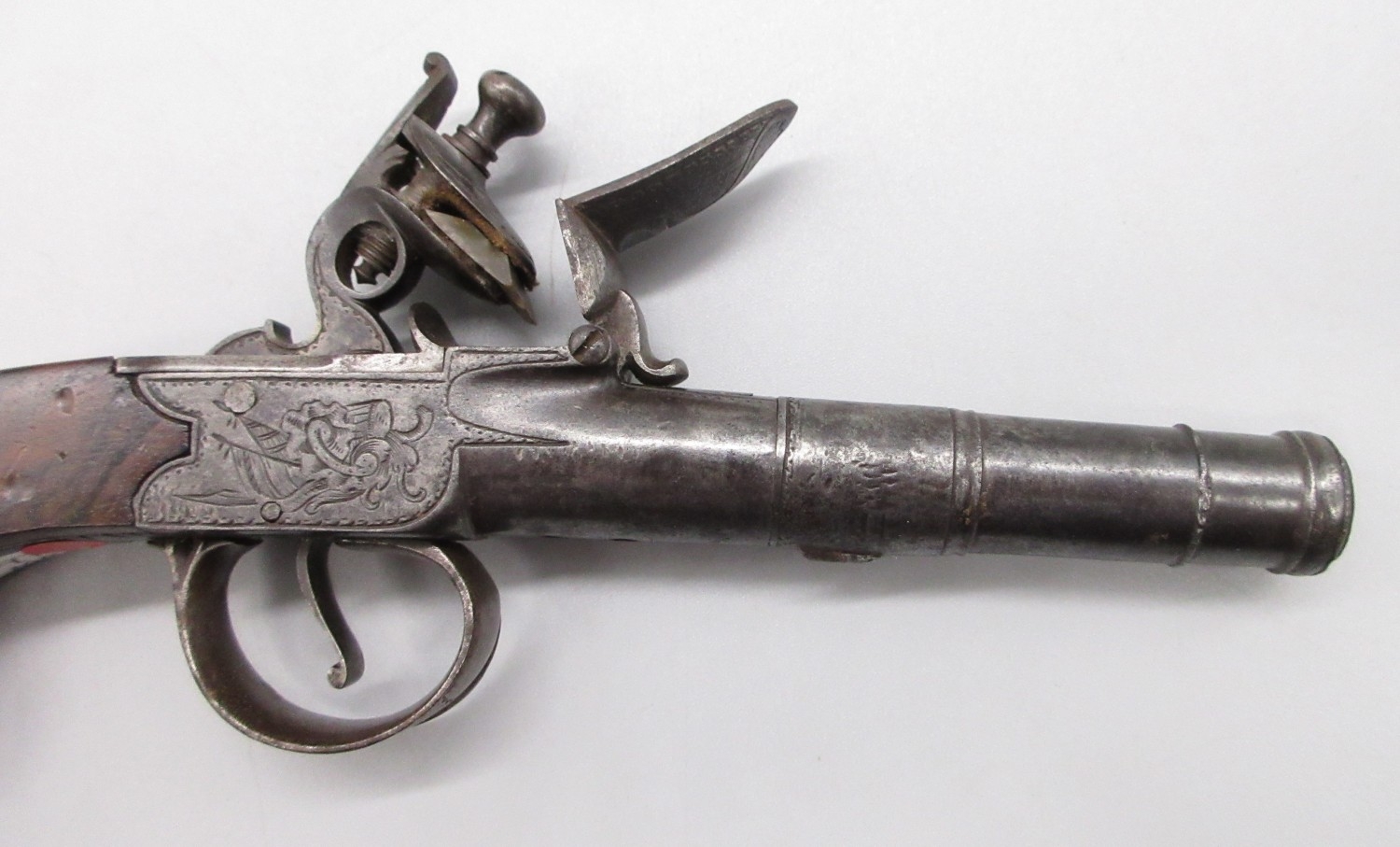 54 bore flintlock cannon barrel pocket pistol by `Thomas', 2.5" turn-off staged cannon barrel, stamped proof marks, named lock and well figured walnut grip, 18.5cm overall.