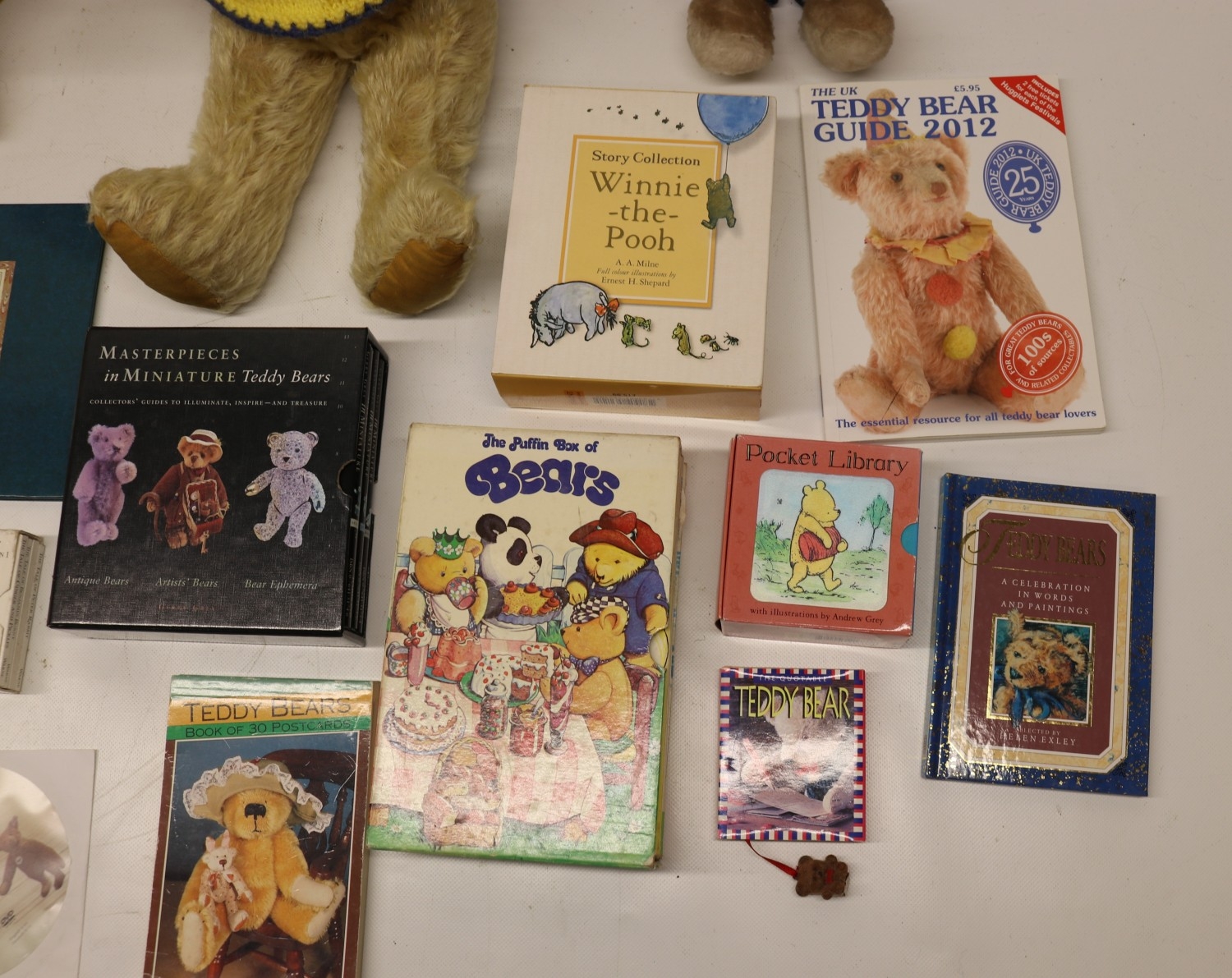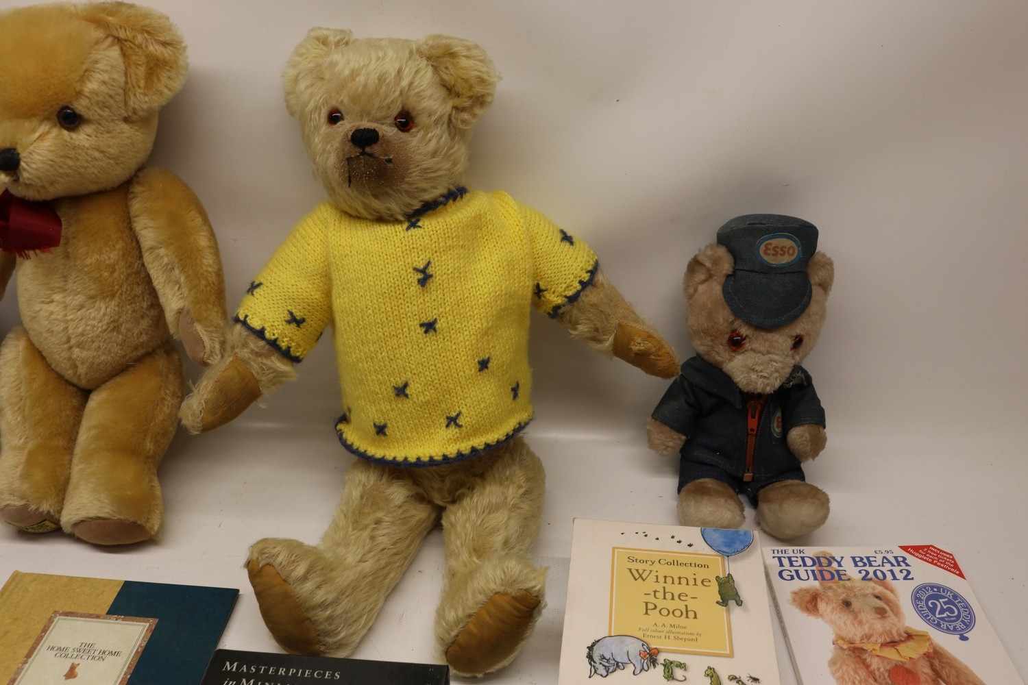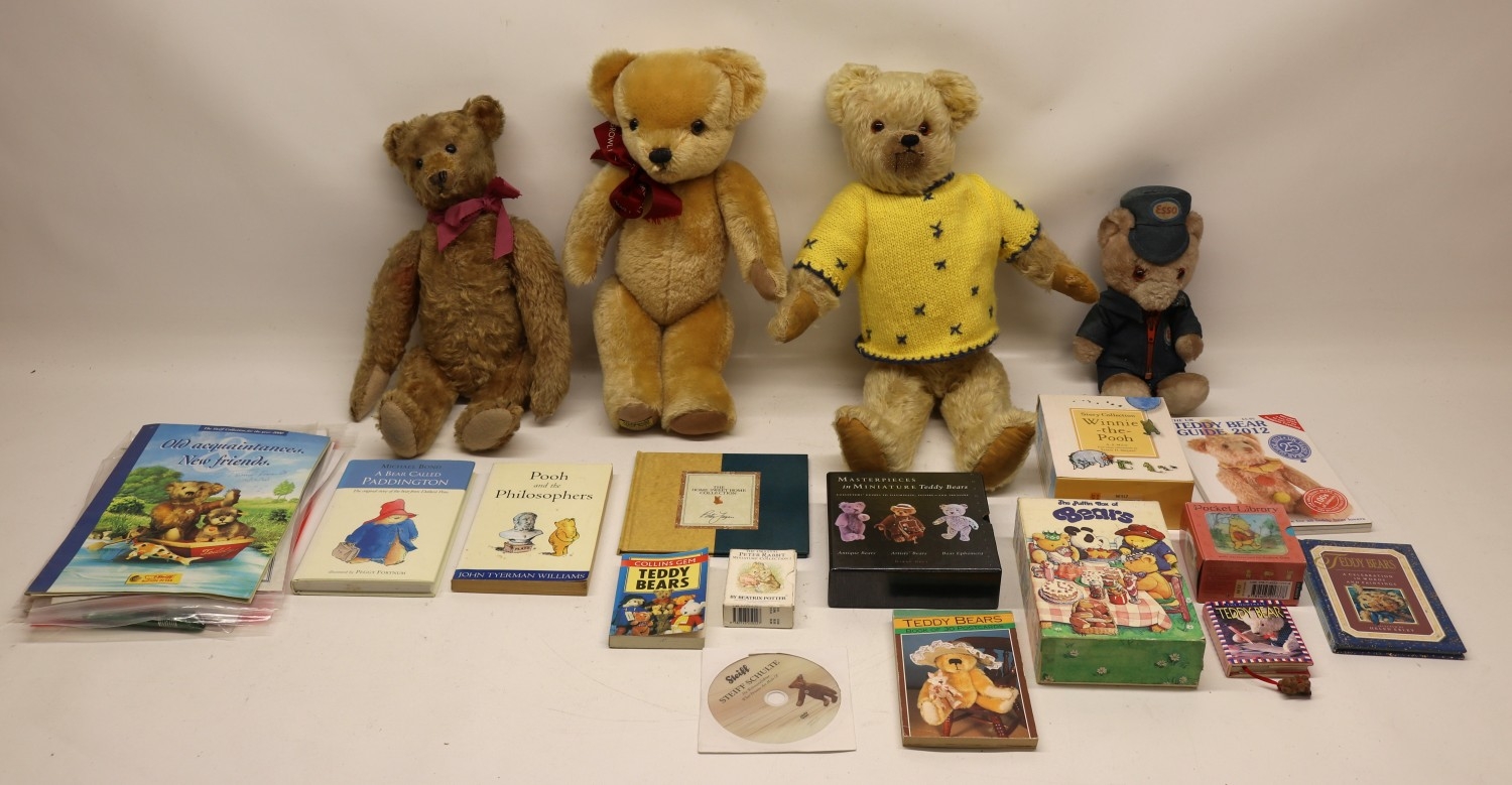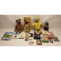 Four vintage teddy bears, incl. one blond mohair merrythought bear and various bear and bear collecting ephemera, incl. 'Winnie-the-Pooh' story collection