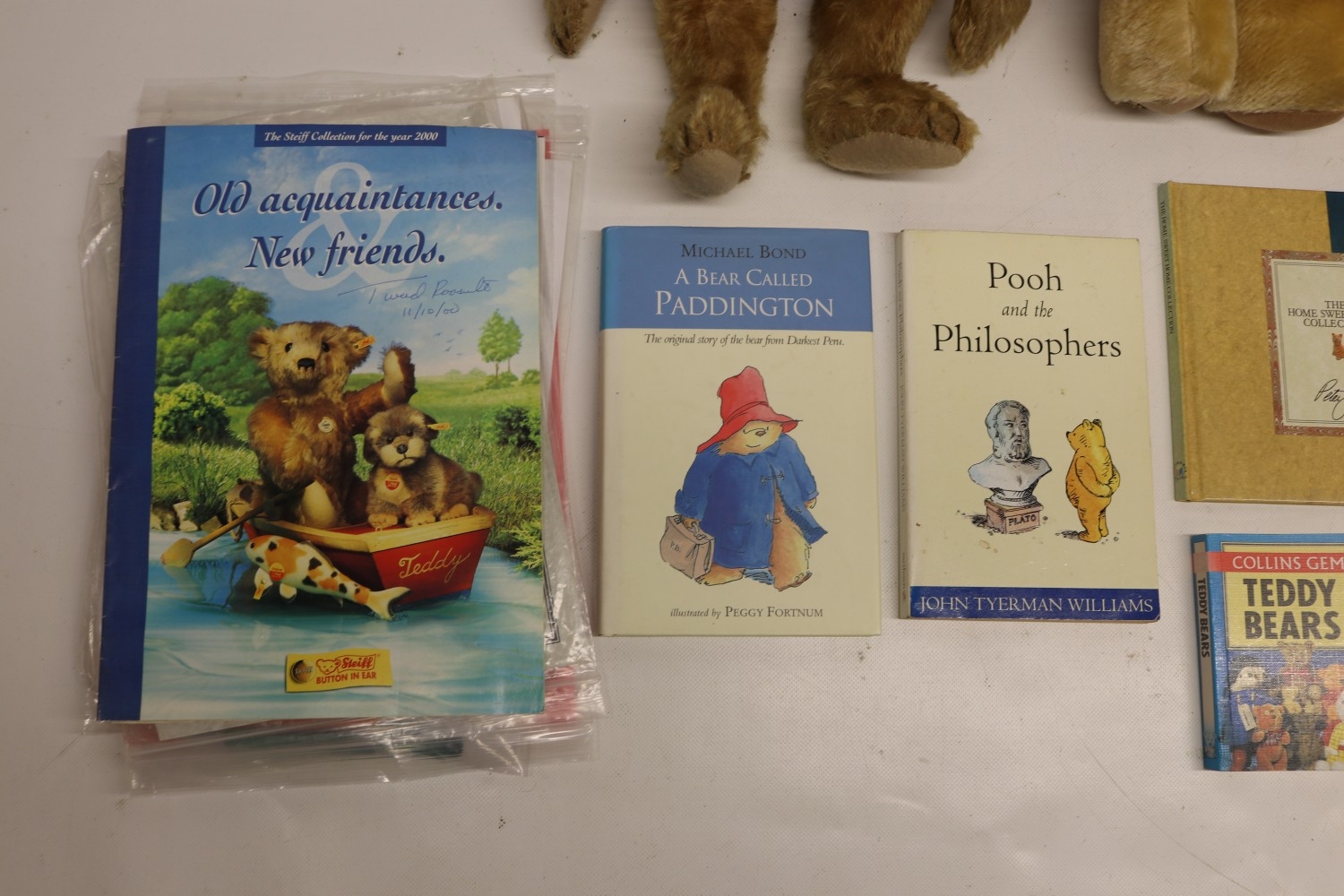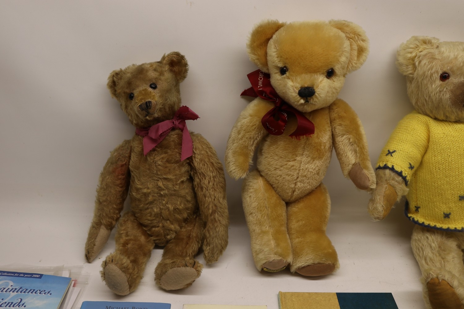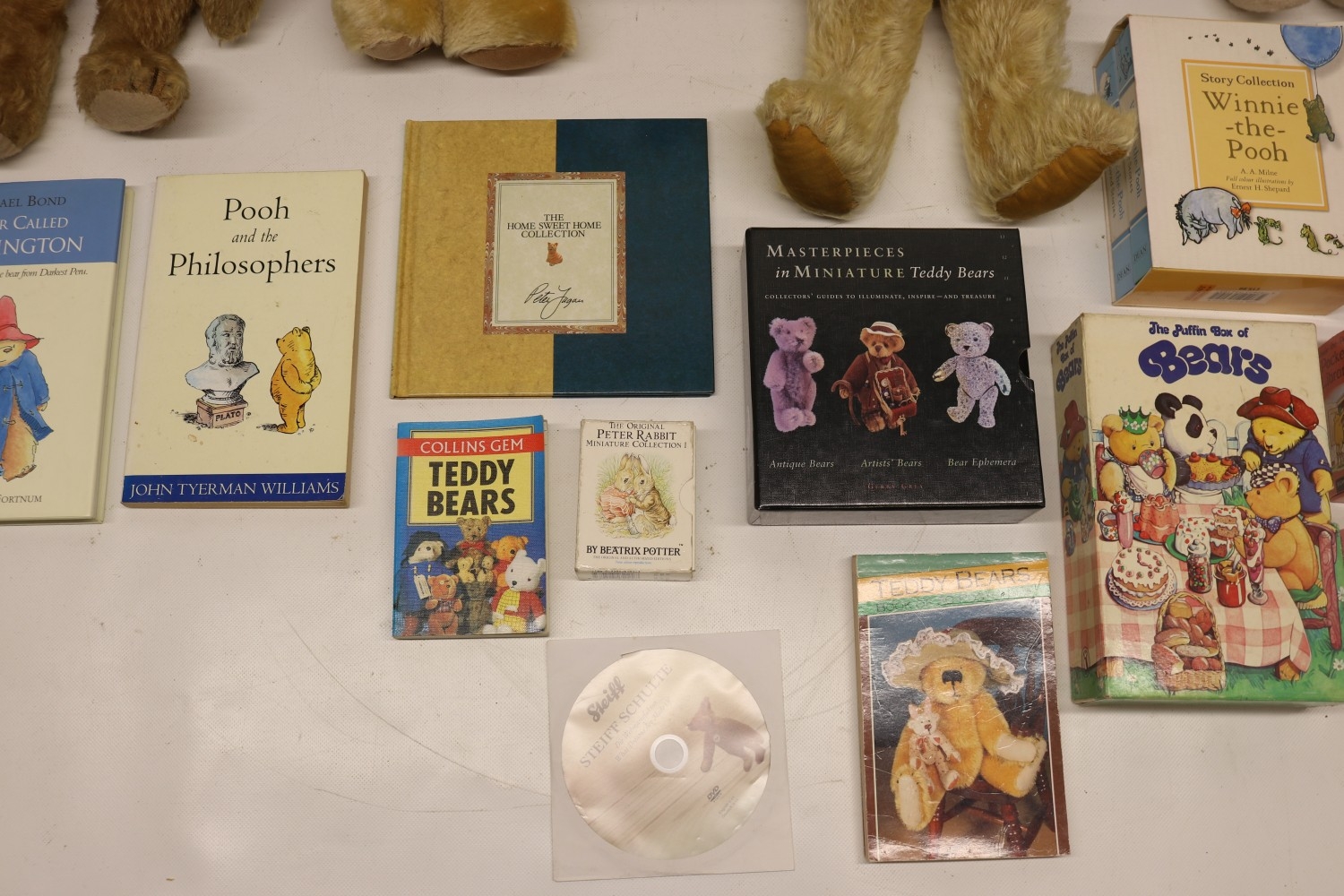 Four vintage teddy bears, incl. one blond mohair merrythought bear and various bear and bear collecting ephemera, incl. 'Winnie-the-Pooh' story collection