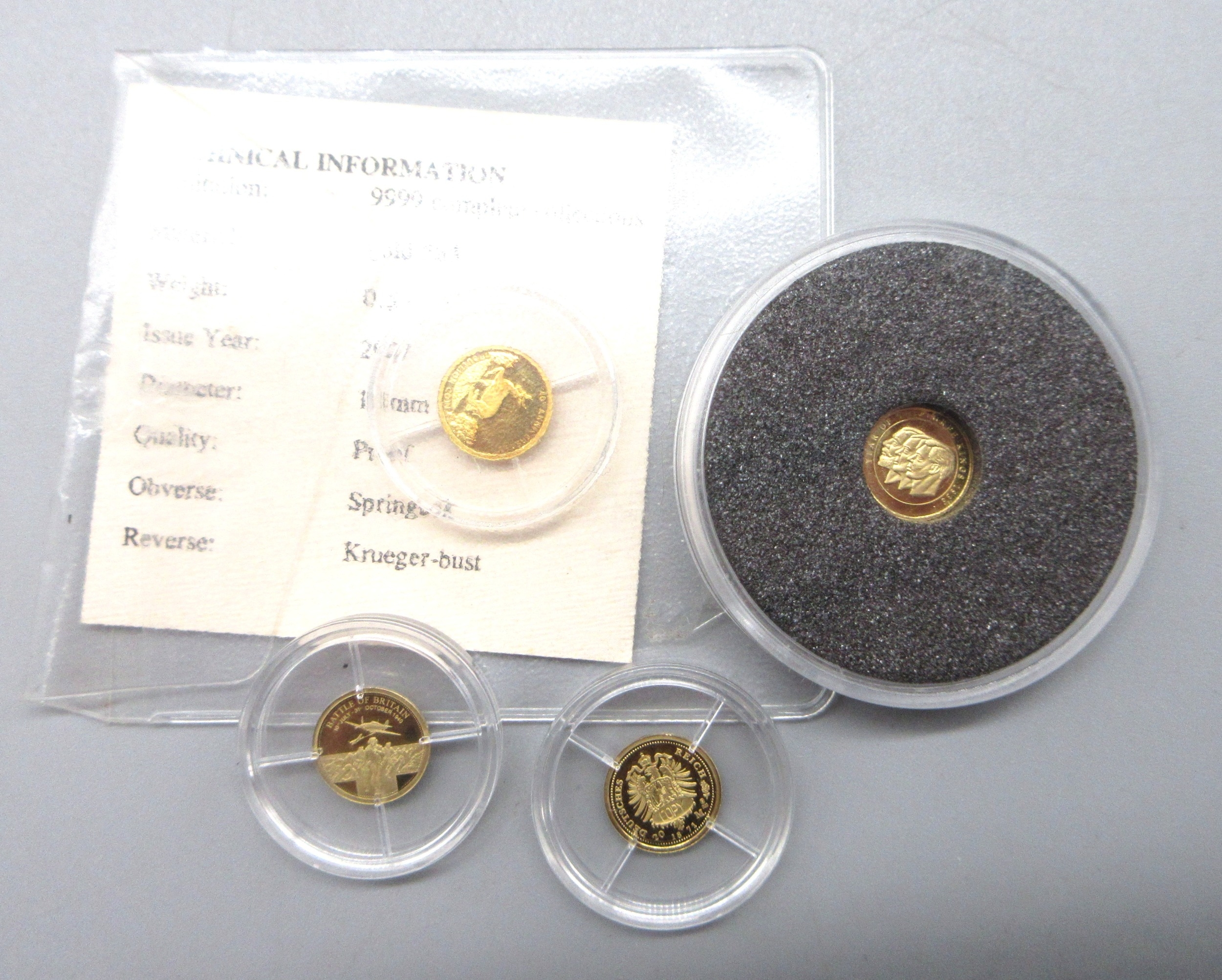 Collection of small gold coins to inc. South Africa 40th Anniversary 1st Bullion Springbok .585 0.5g coin, Year of the Three Coins .585 0.5g coin, Deutsche Reich 20M 1871 Copy .333 0.5g coin & History of Britain Battle of Britain .585 0.5g coin (4)