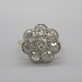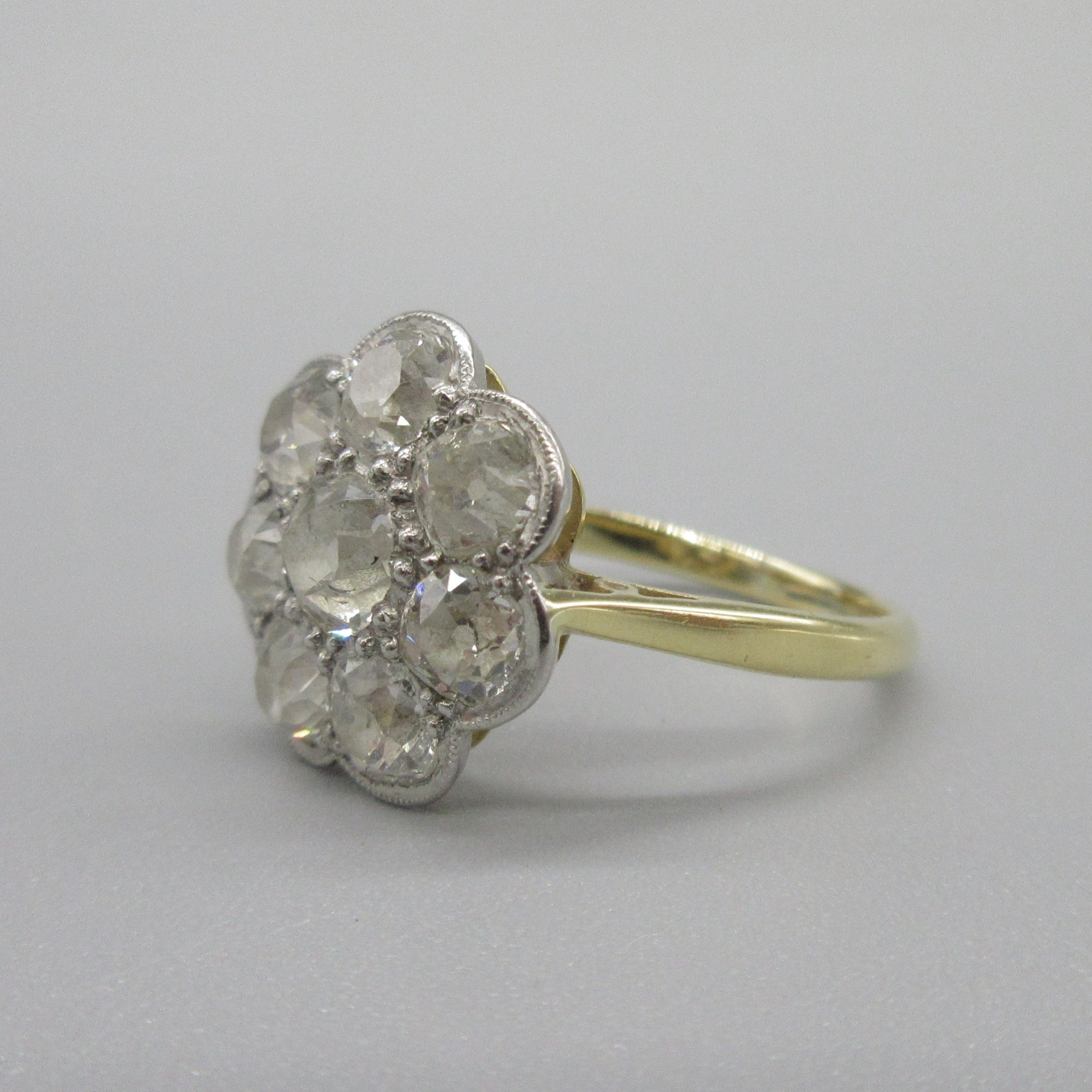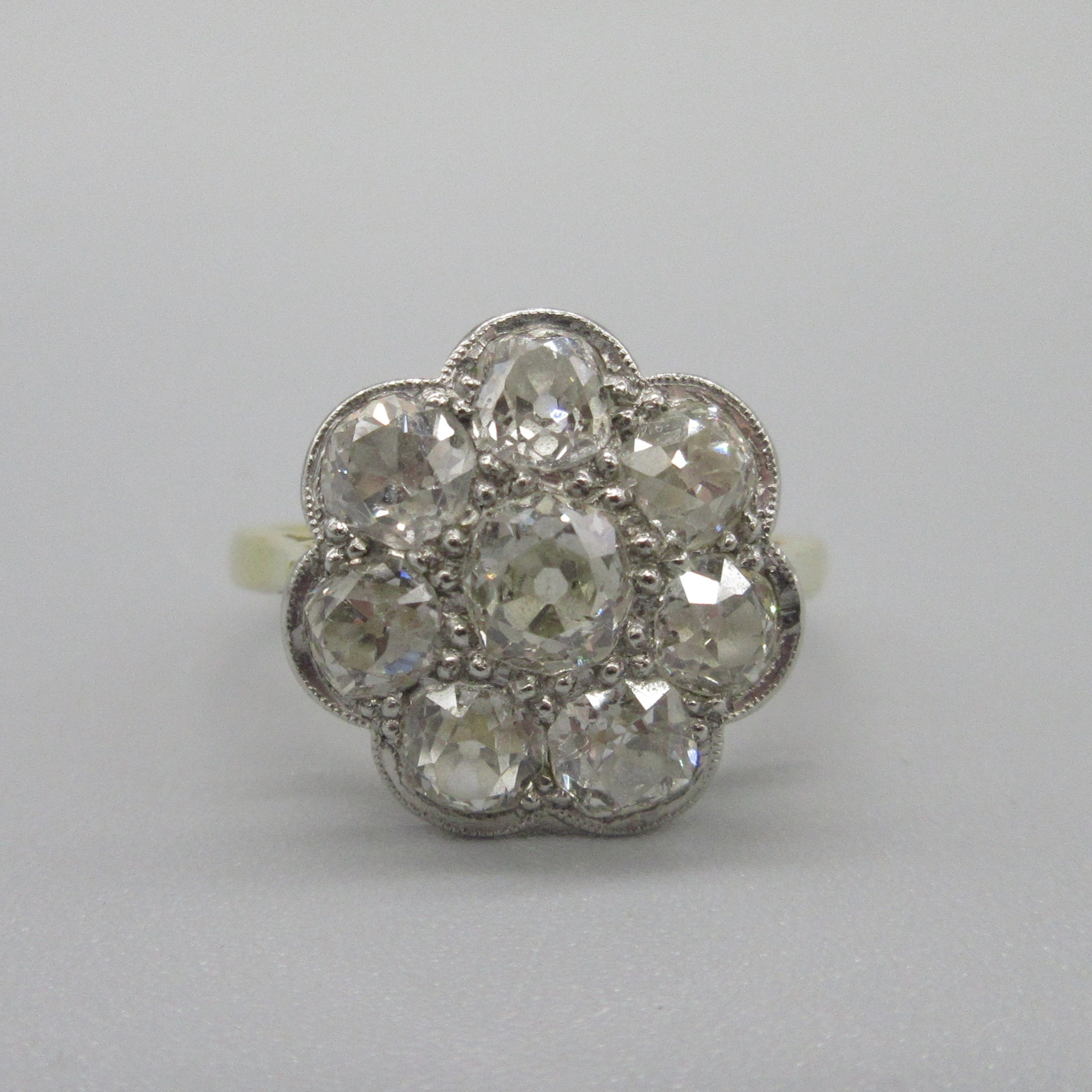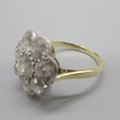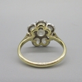 Art Deco style 18ct yellow gold diamond flower ring, round brilliant cut diamonds in white gold setting, central diamond approximately .3 carat, size M, 3.6g