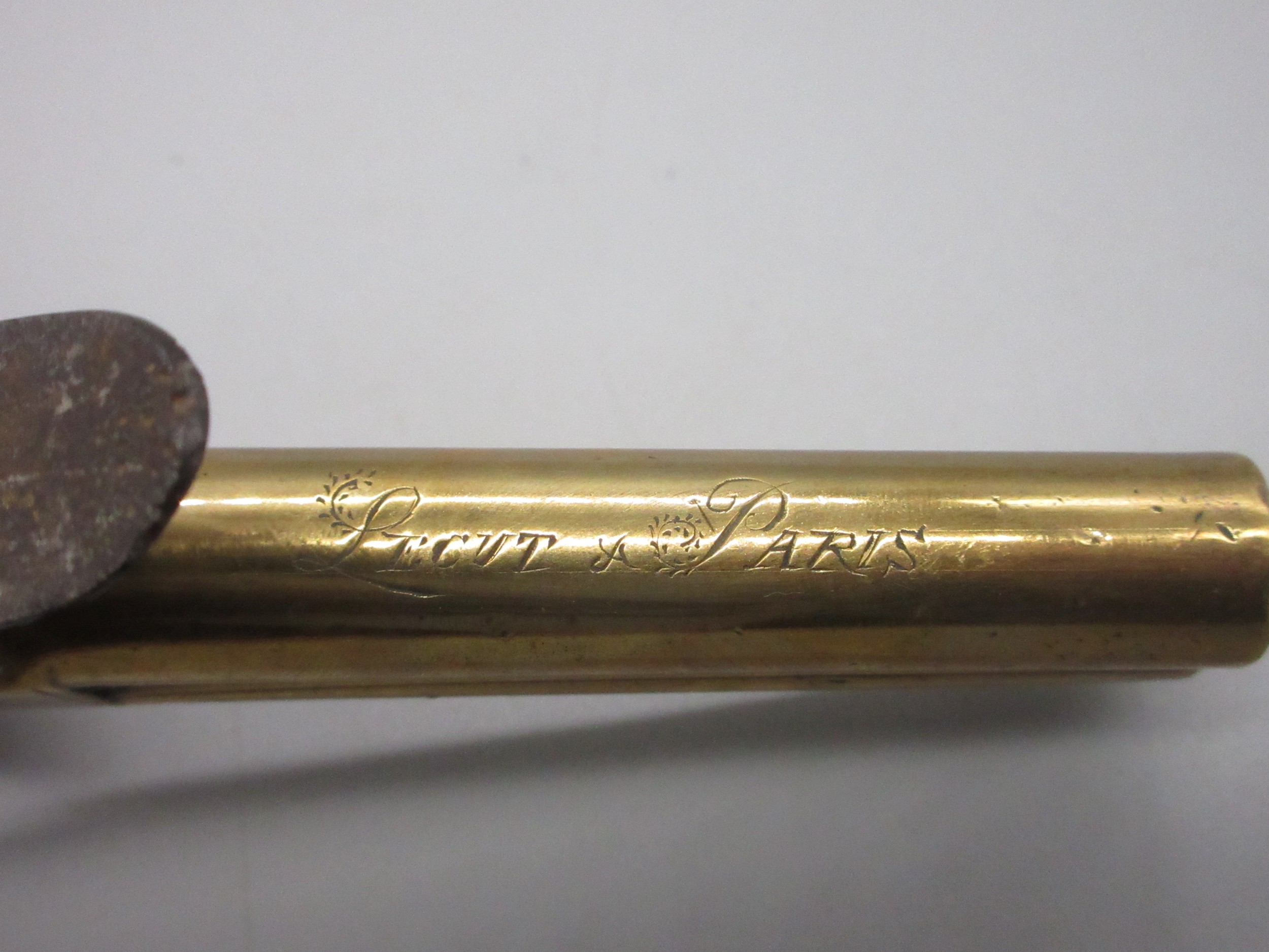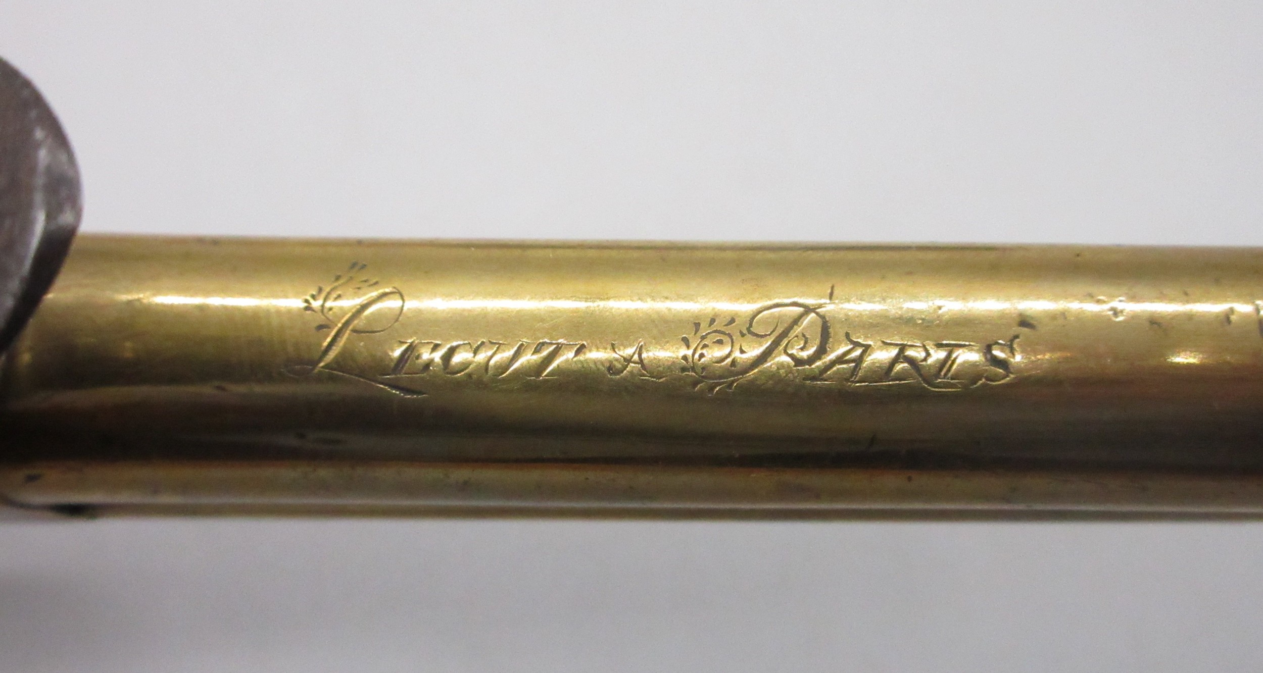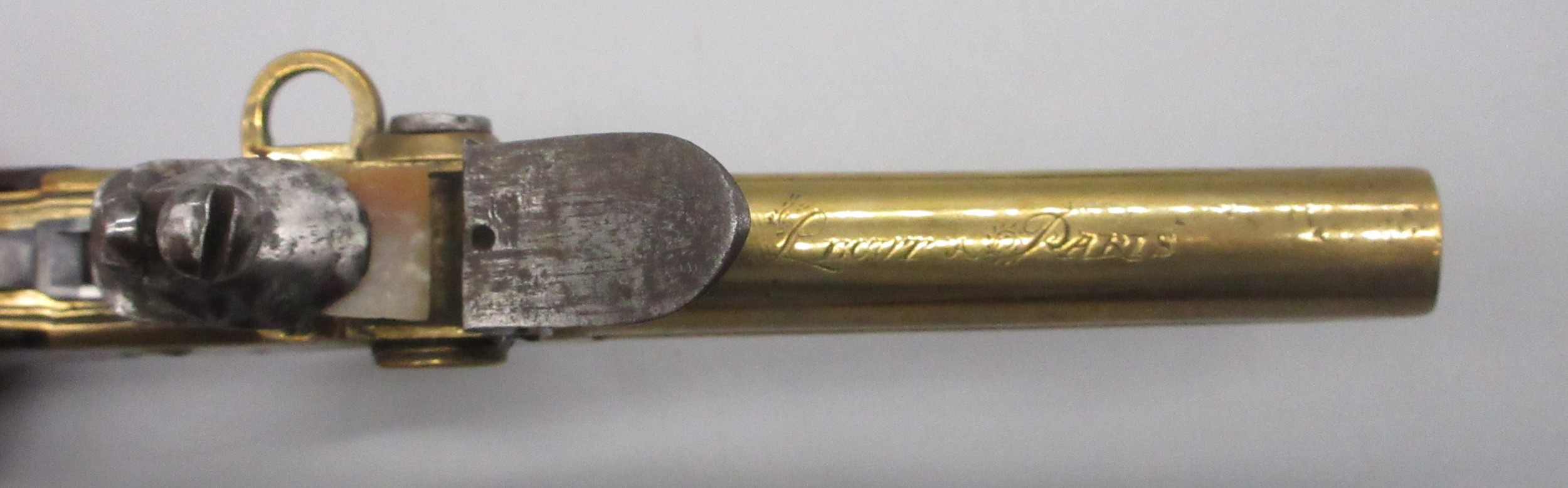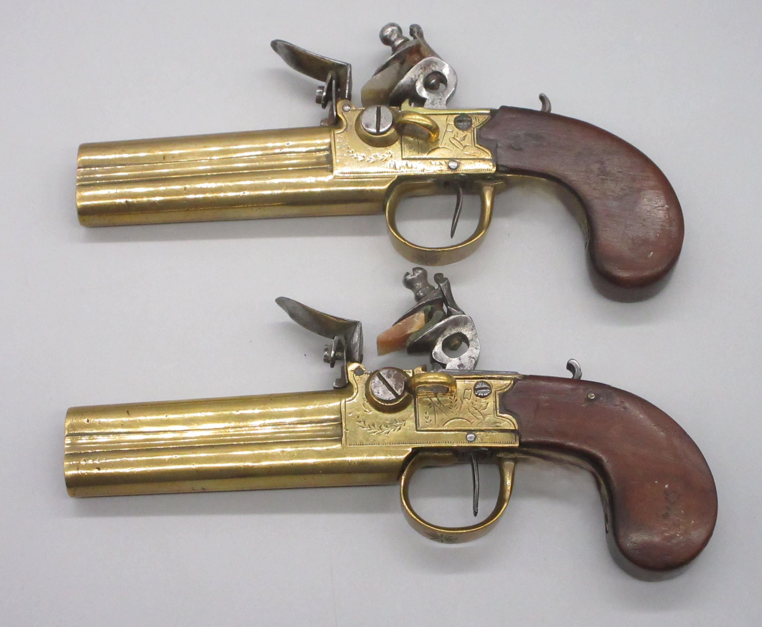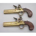 Pair of 80 bore brass flintlock tap-action over and under pocket pistols, 3.5" brass barrels engraved 'Lecut A Paris', top slide safety's and engraved brass locks, 20cm overall