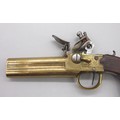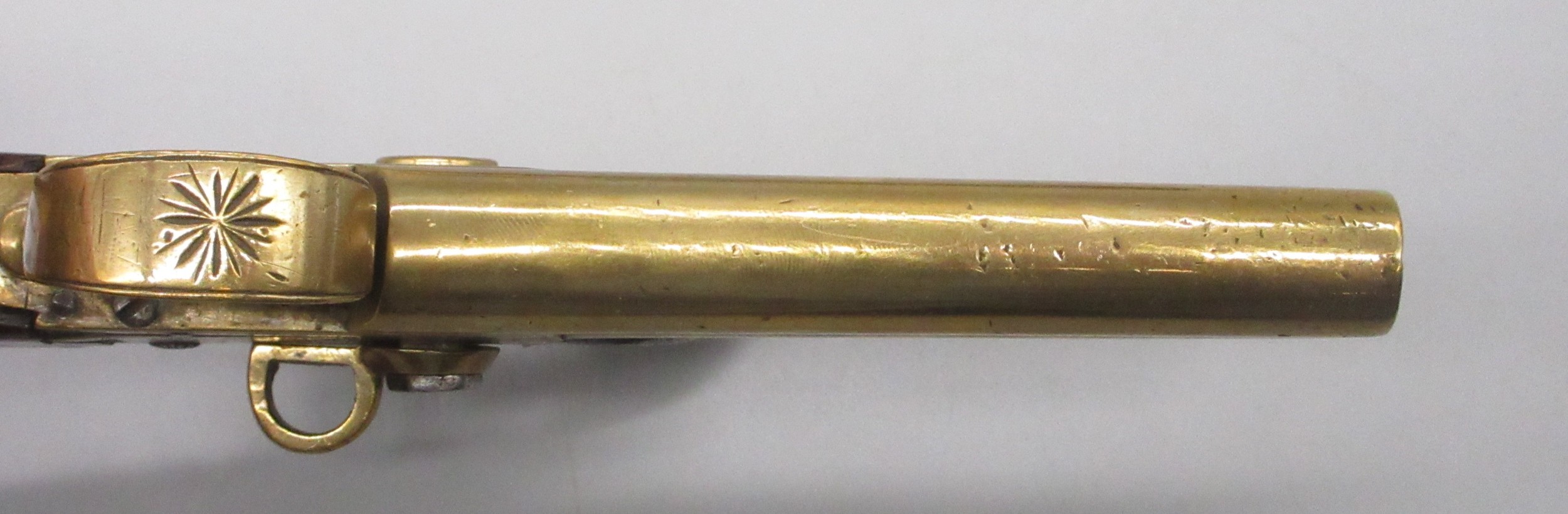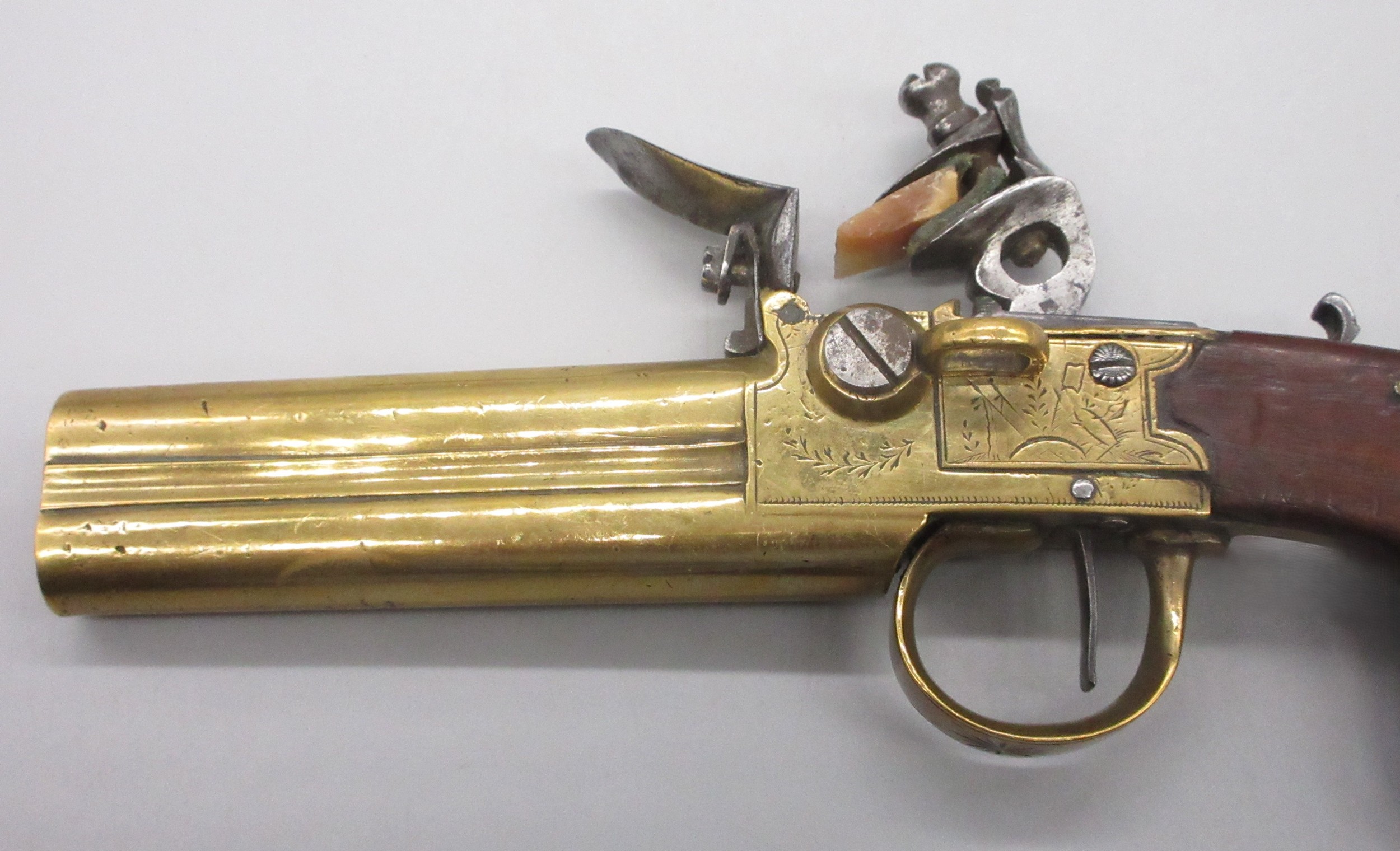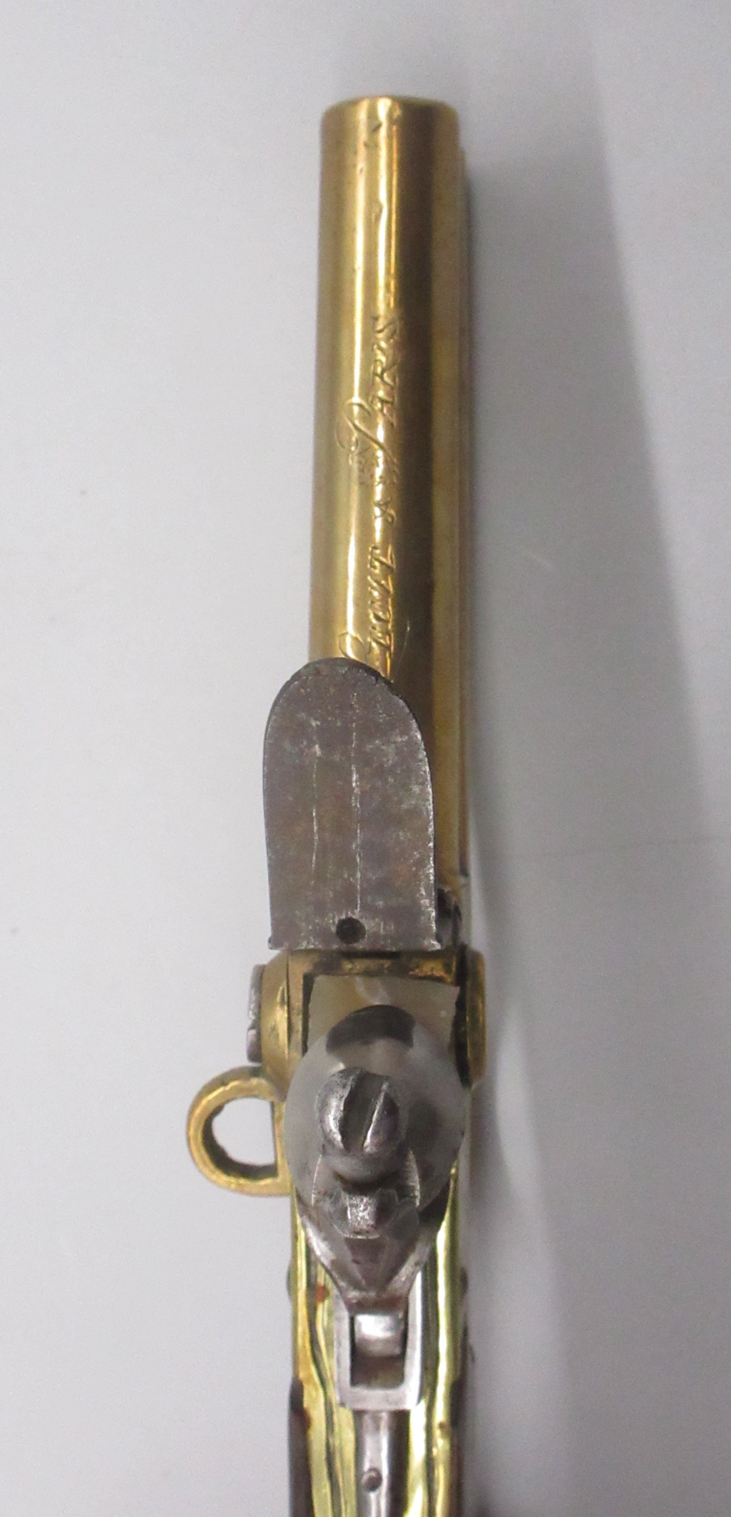 Pair of 80 bore brass flintlock tap-action over and under pocket pistols, 3.5" brass barrels engraved 'Lecut A Paris', top slide safety's and engraved brass locks, 20cm overall