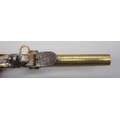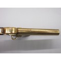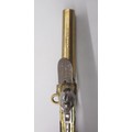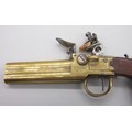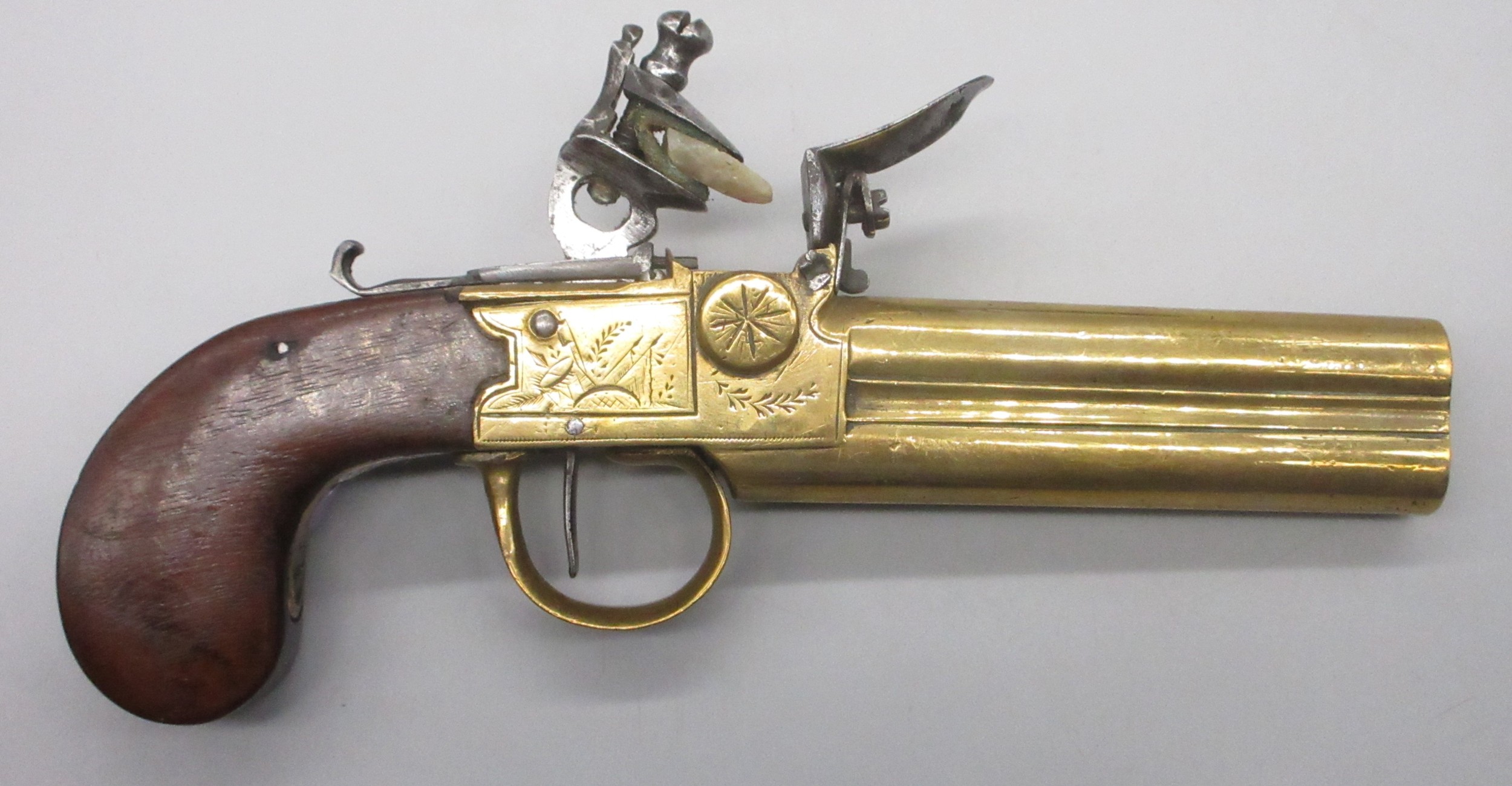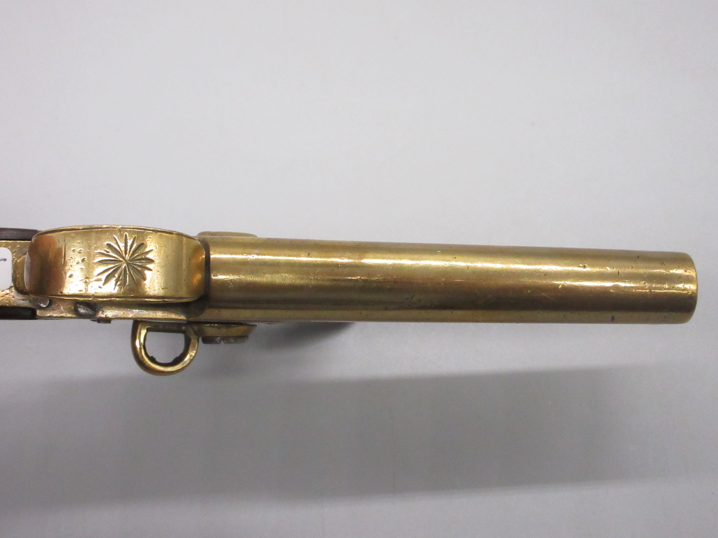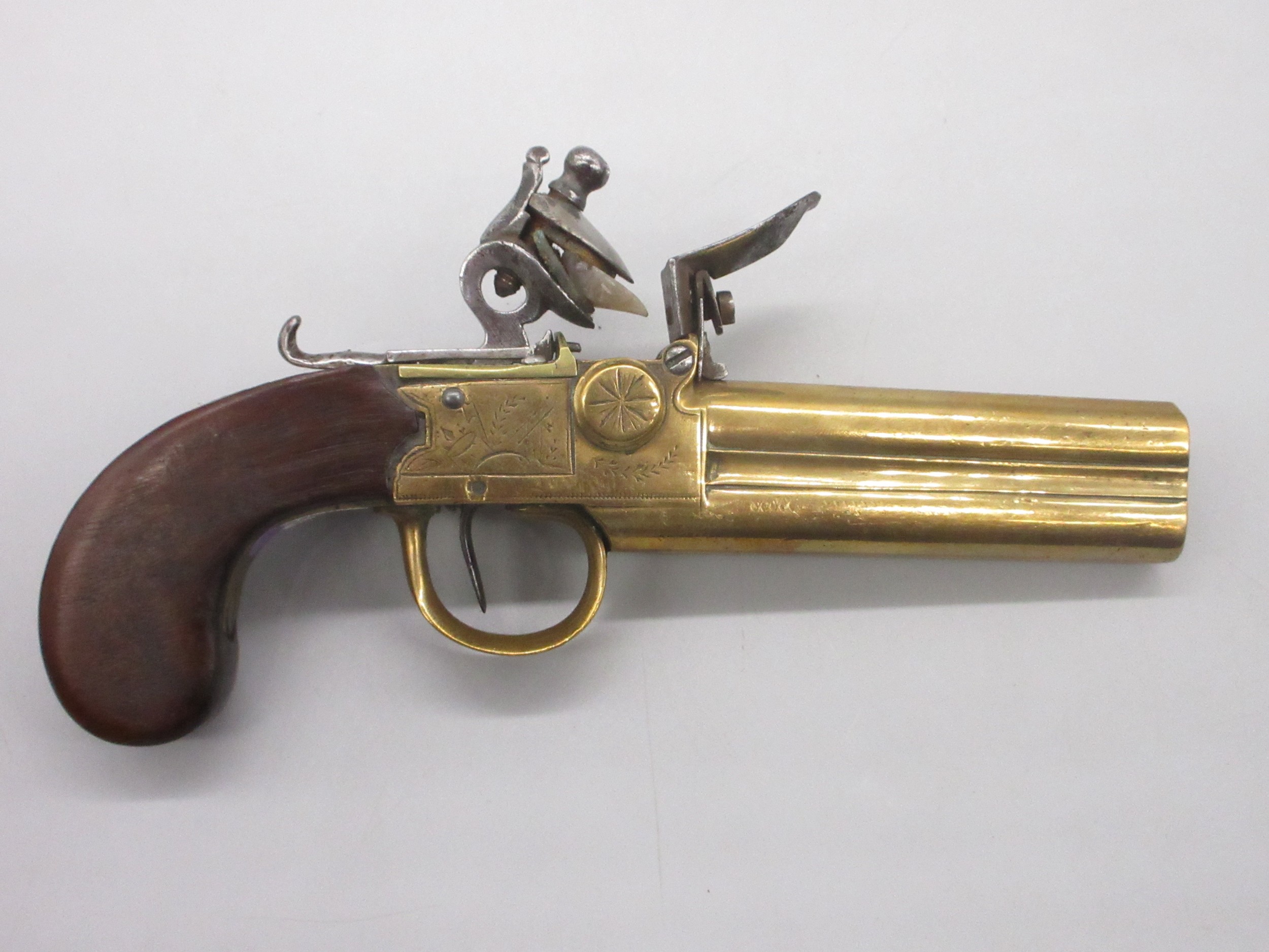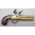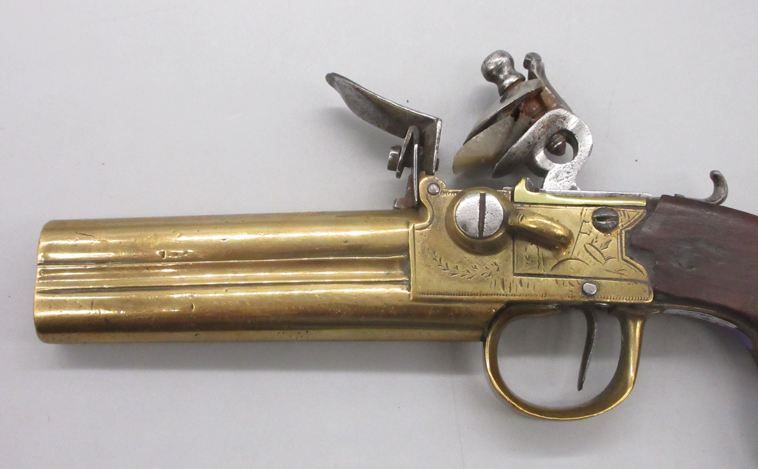 Pair of 80 bore brass flintlock tap-action over and under pocket pistols, 3.5" brass barrels engraved 'Lecut A Paris', top slide safety's and engraved brass locks, 20cm overall