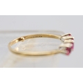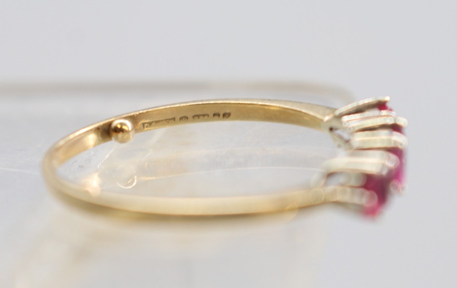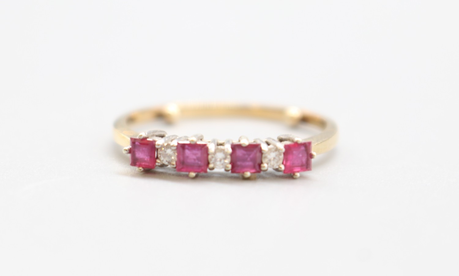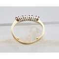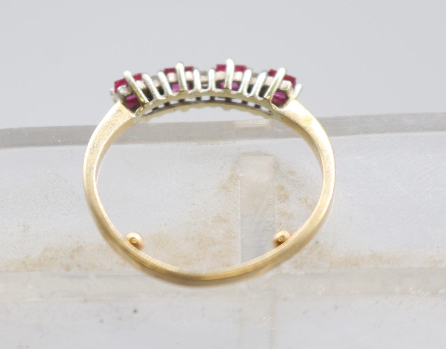 9ct hallmarked five-stone ring featuring alternating rubies and diamonds, hallmarks worn, size R (2.1g)