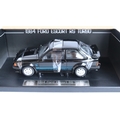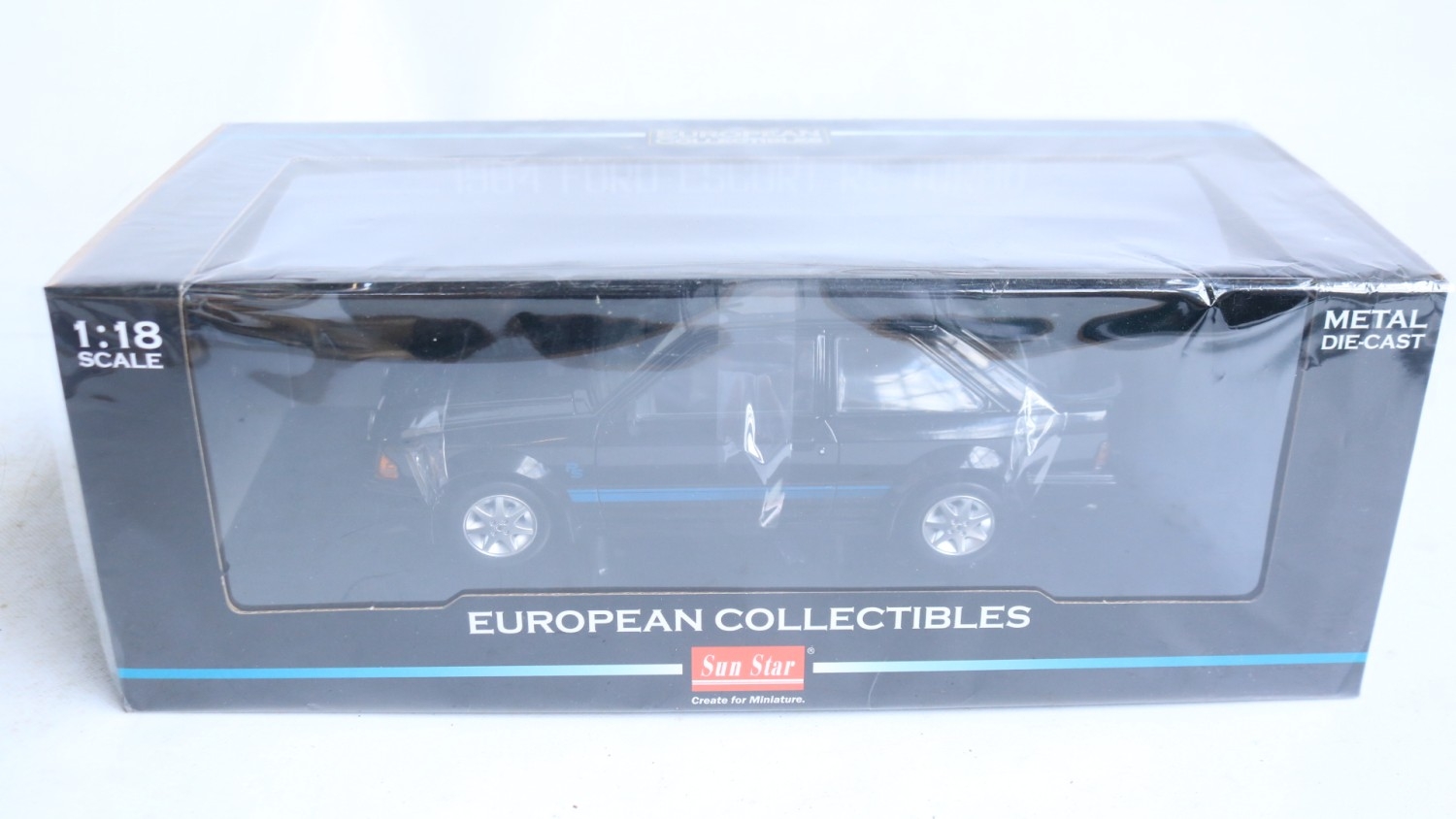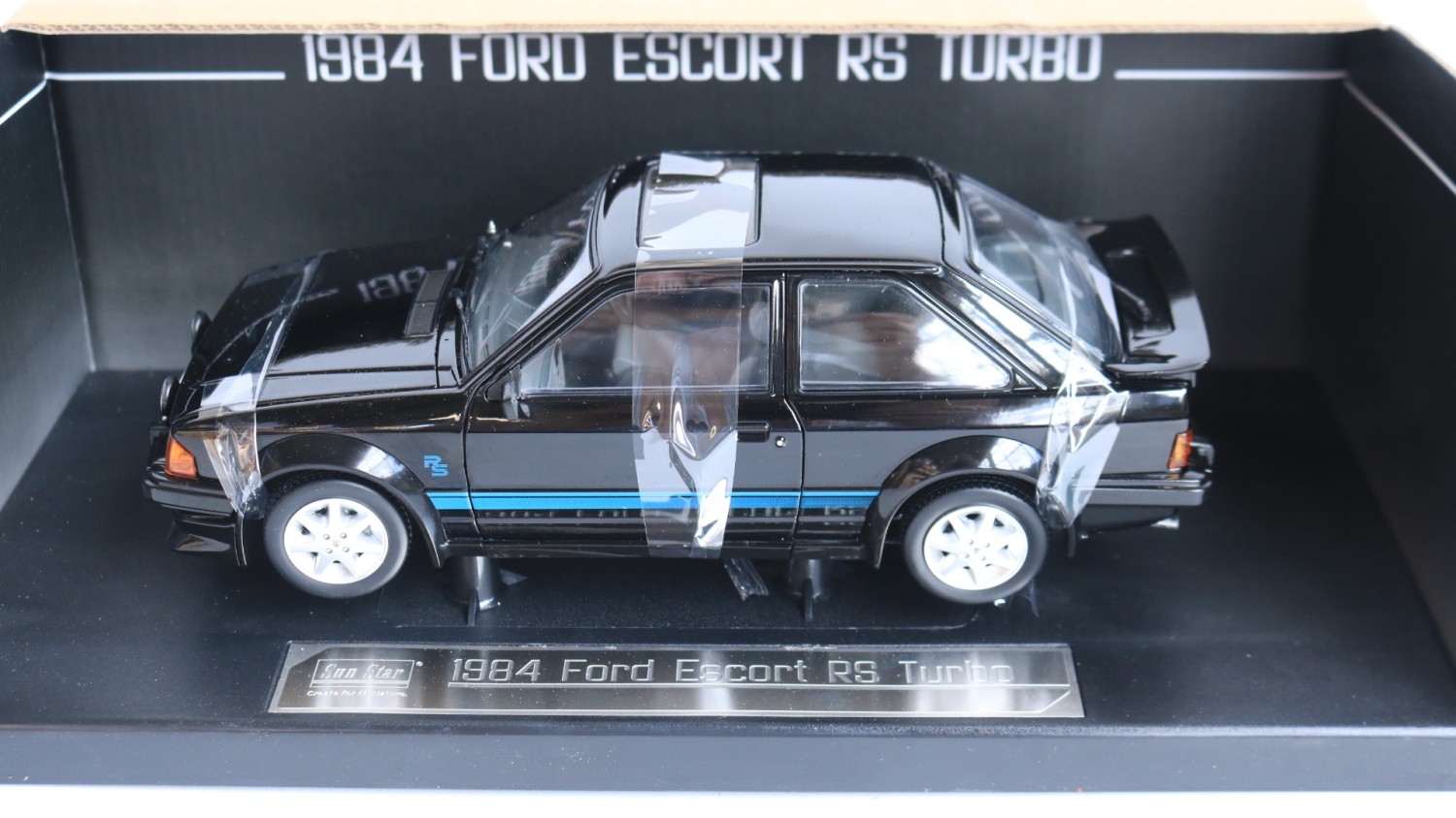 Sun Star 1/18 scale diecast 1984 Ford Escort RS Turbo (item no 4964R) in black, model in mint condition and still factory tied to inner box tray, box excellent and complete with outer clear plastic protective sleeve
