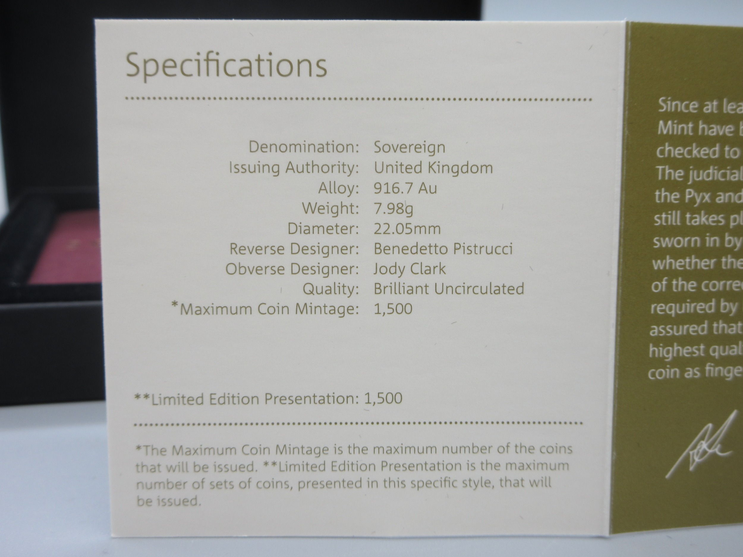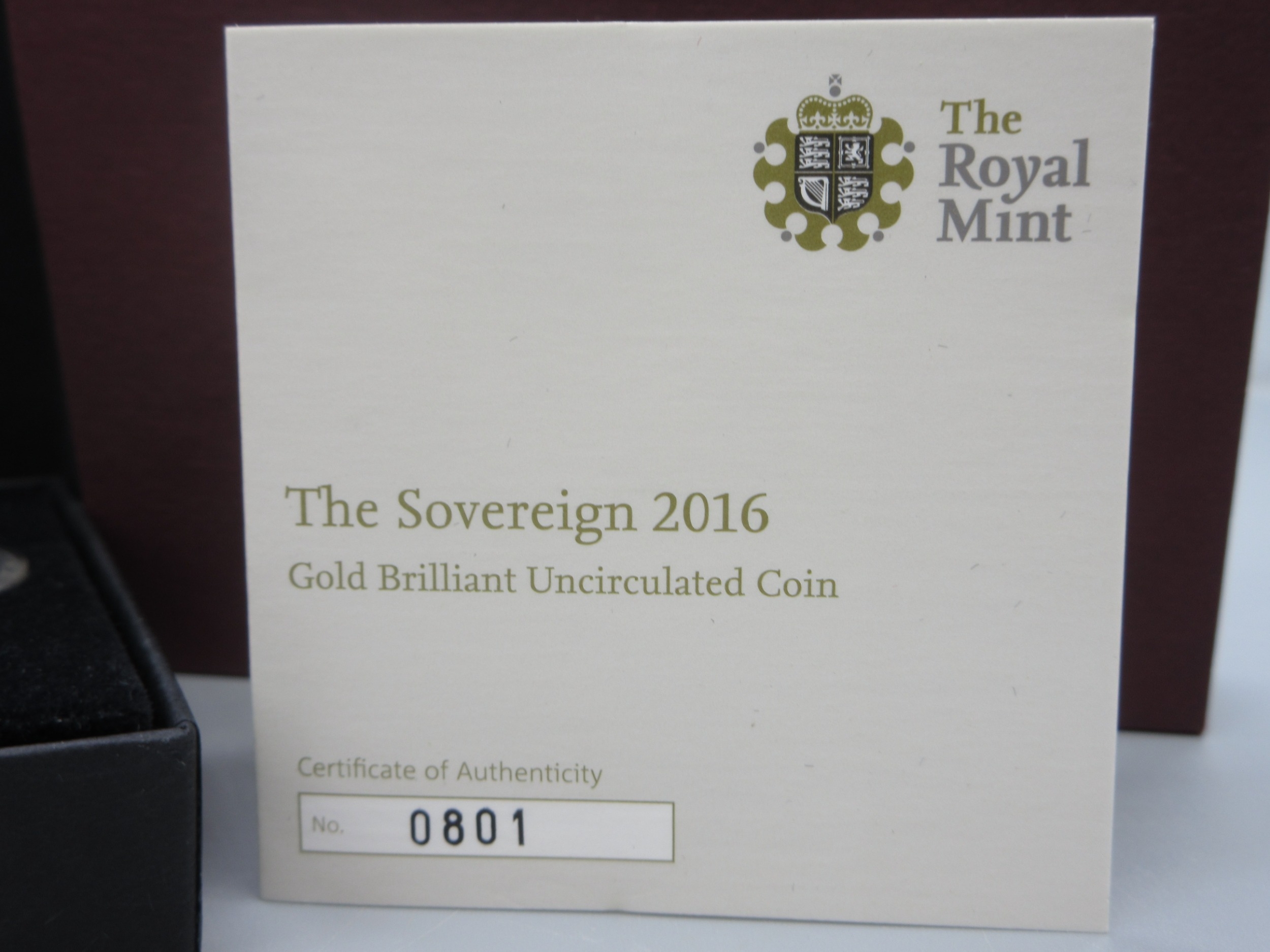 The Royal Mint - The Sovereign 2016 Gold Brilliant Uncirculated Coin, encapsulated in case with COA, No.0801/1500