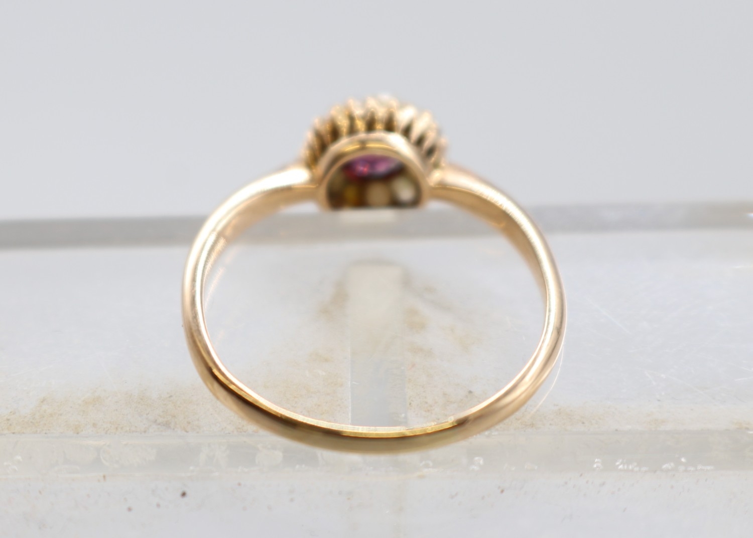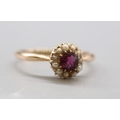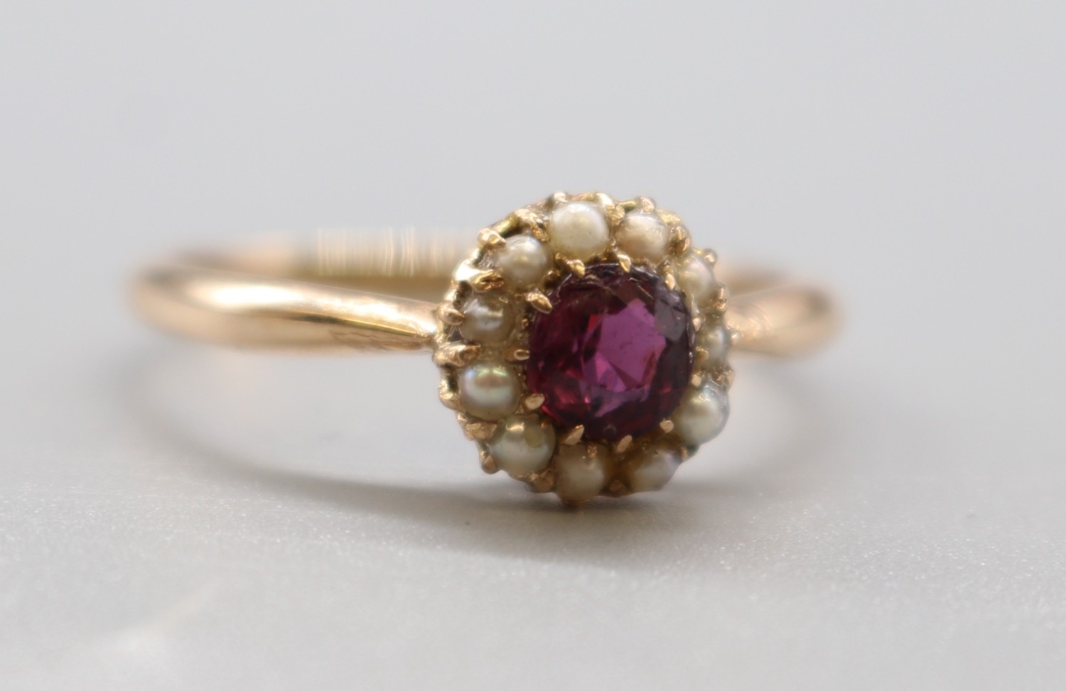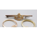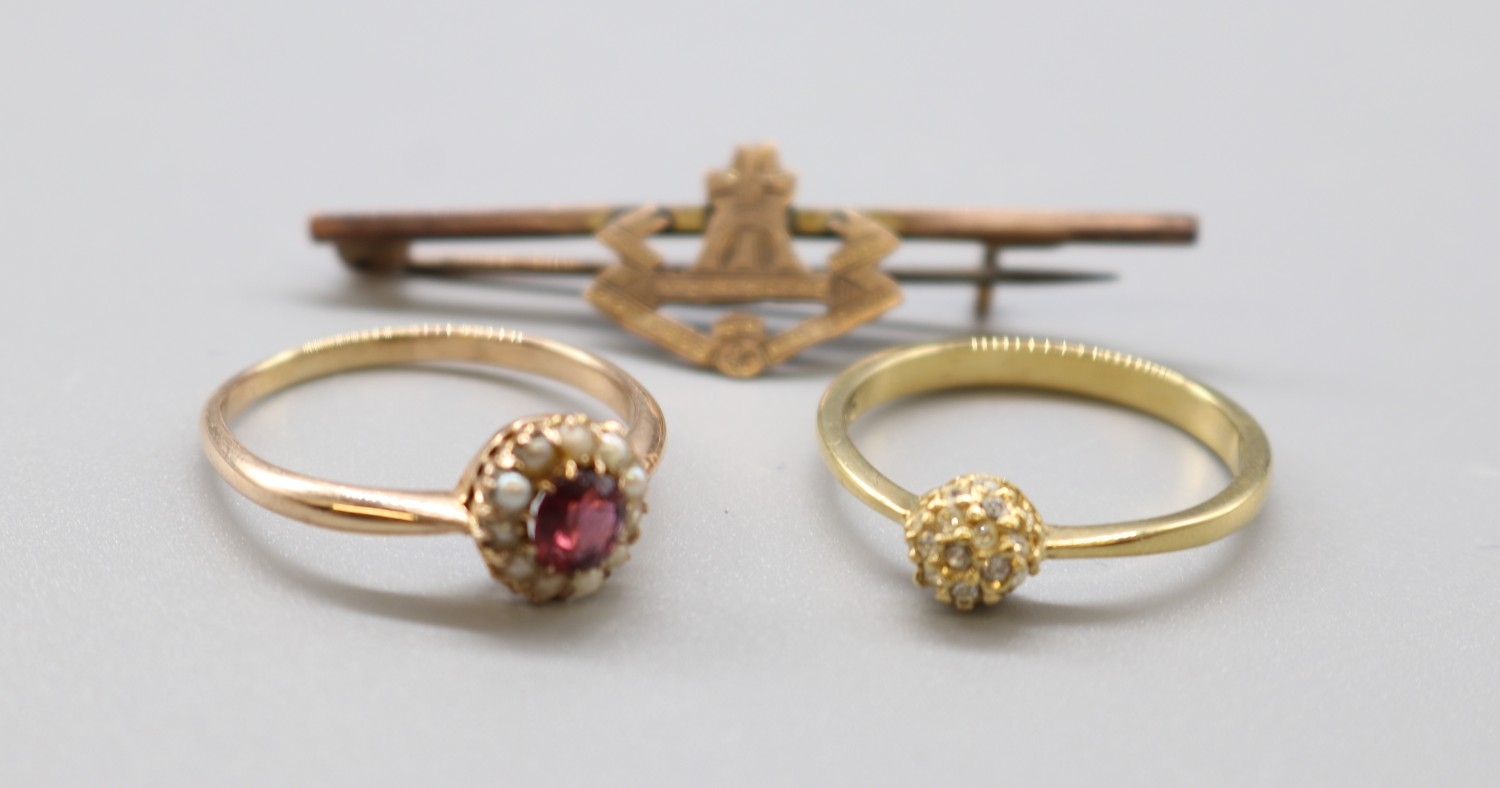 19th Century garnet and sea pearl yellow metal ring, size R 1/2 (2.5g) Yorkshire The Princes of Wales Own Regimental 9ct stamped brooch and another ring set with stones and a 9 stamp, size S (1.9g)