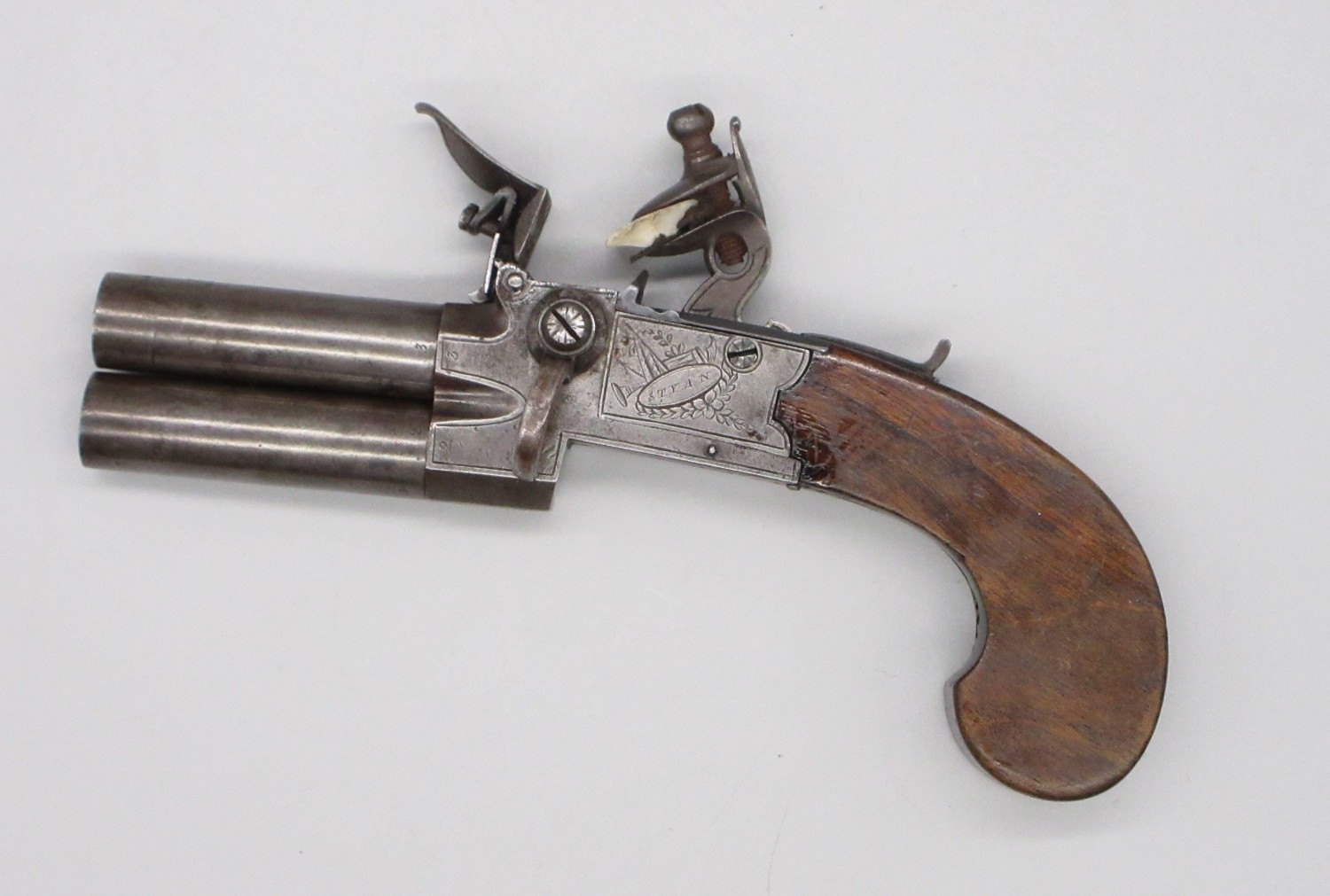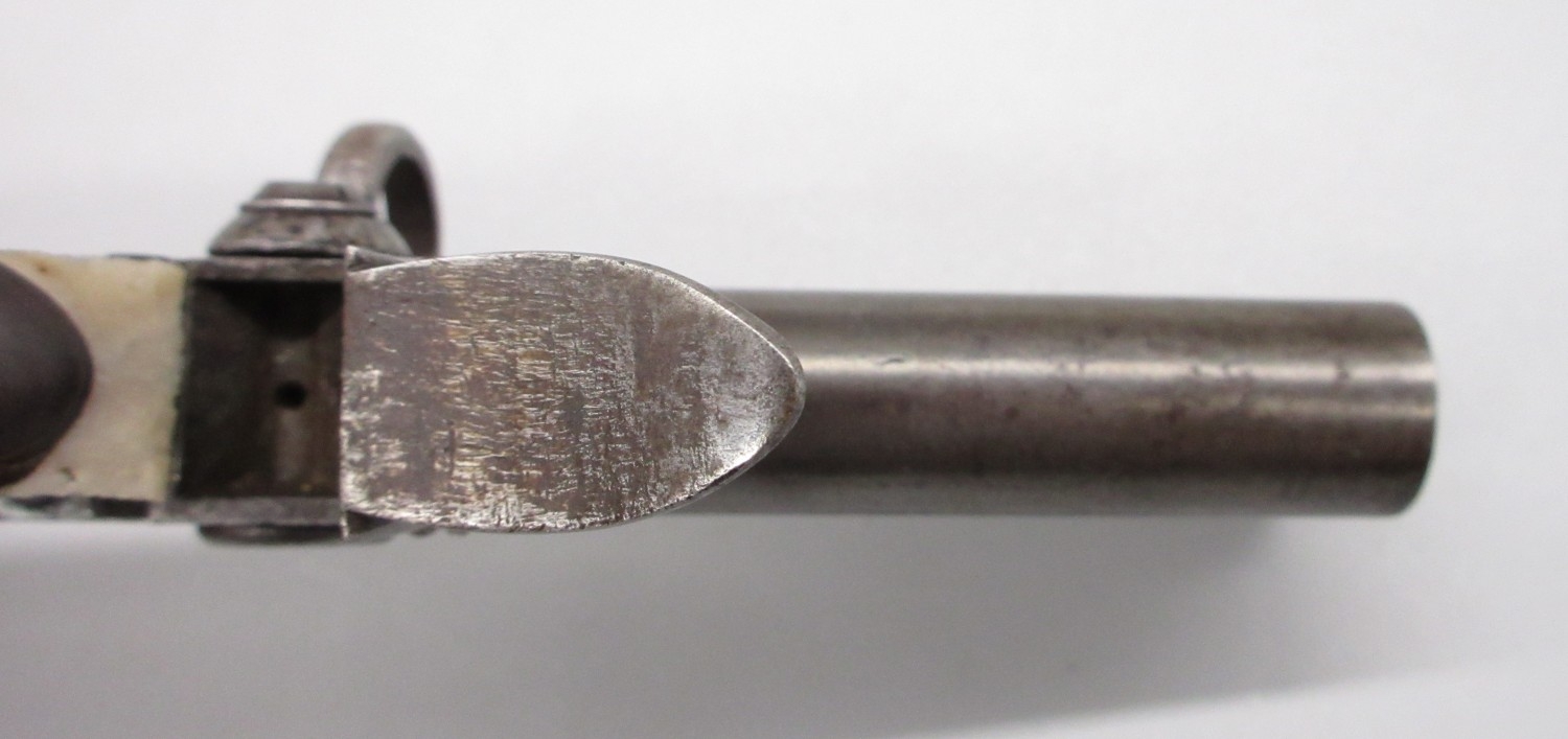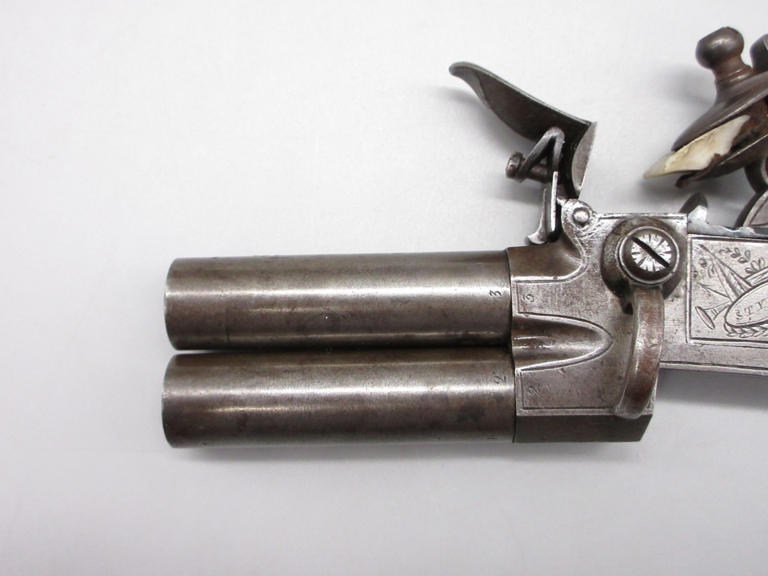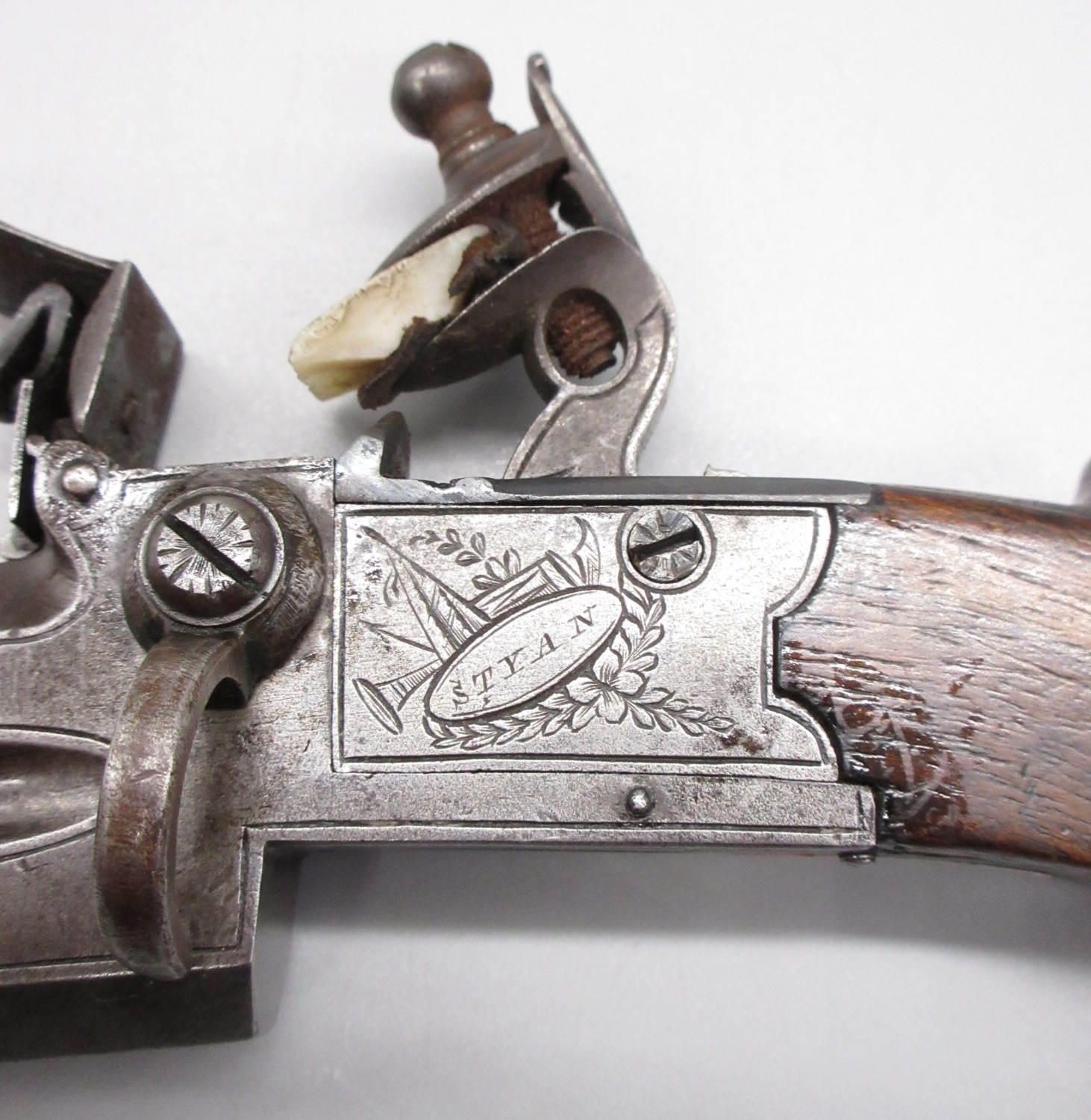 50 bore tap-action flintlock over and under pocket pistol by `Styan', 2.5" turn-off barrels stamped `2,3', star cut muzzles, stamped proof marks, folding trigger and top slide safety, makers name to the lock, 19cm overall