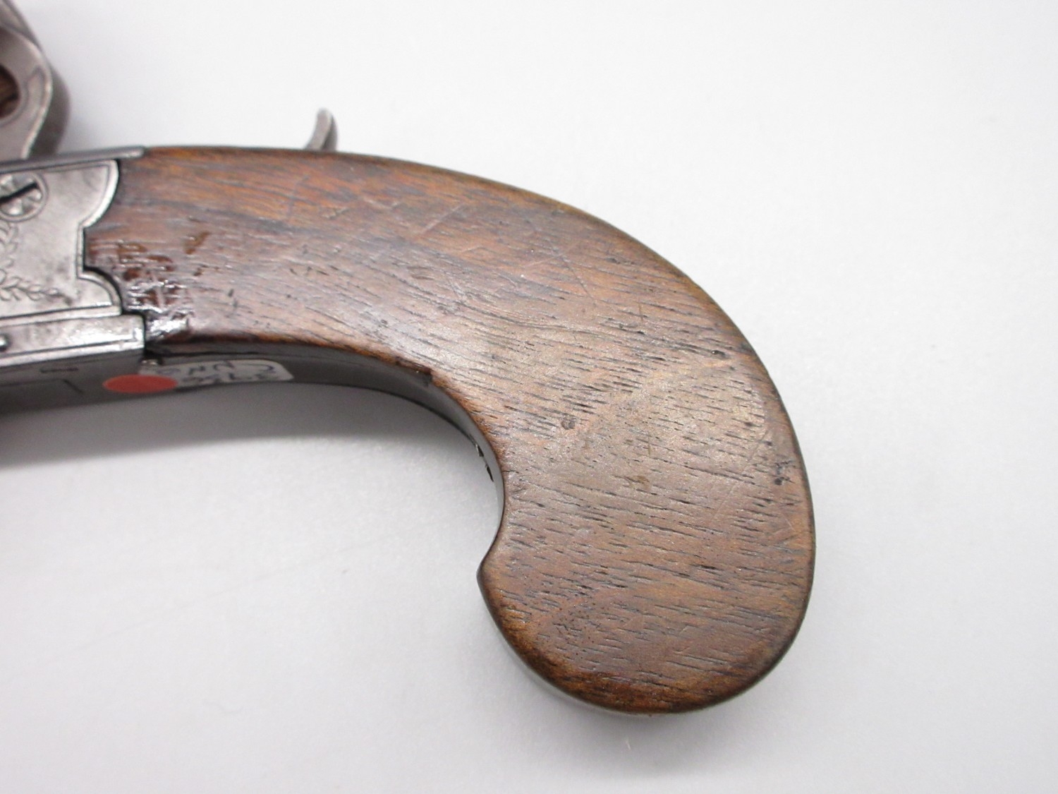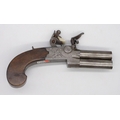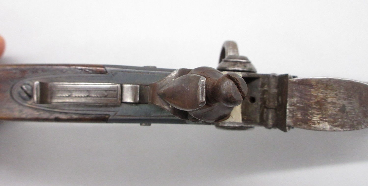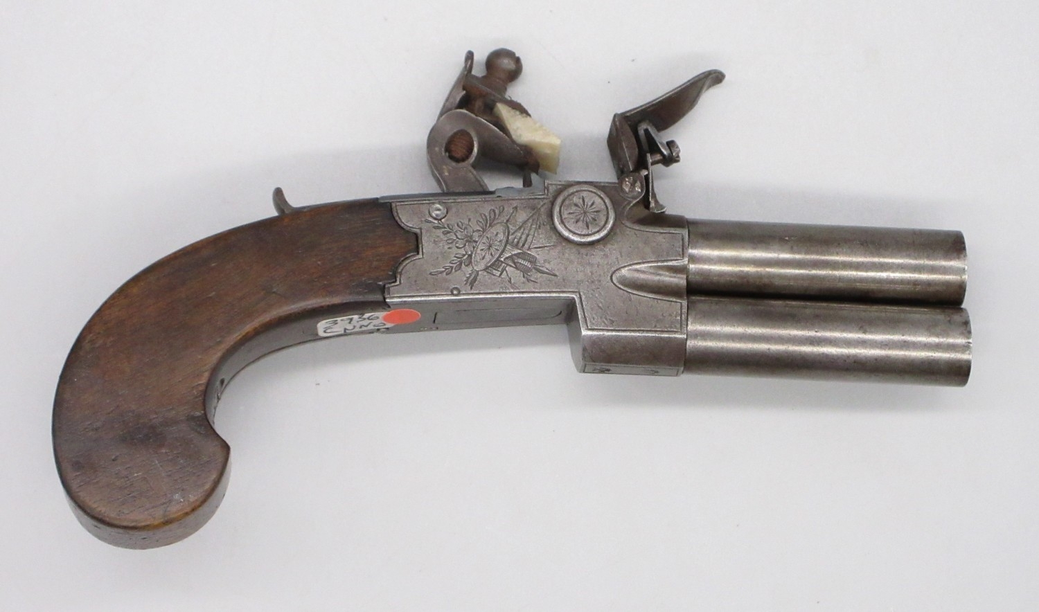 50 bore tap-action flintlock over and under pocket pistol by `Styan', 2.5" turn-off barrels stamped `2,3', star cut muzzles, stamped proof marks, folding trigger and top slide safety, makers name to the lock, 19cm overall