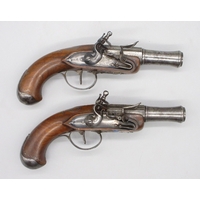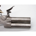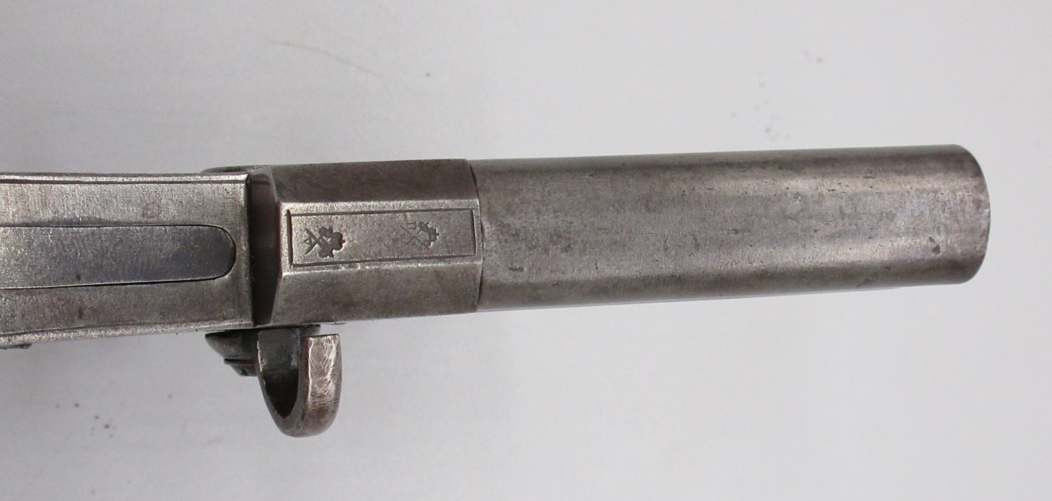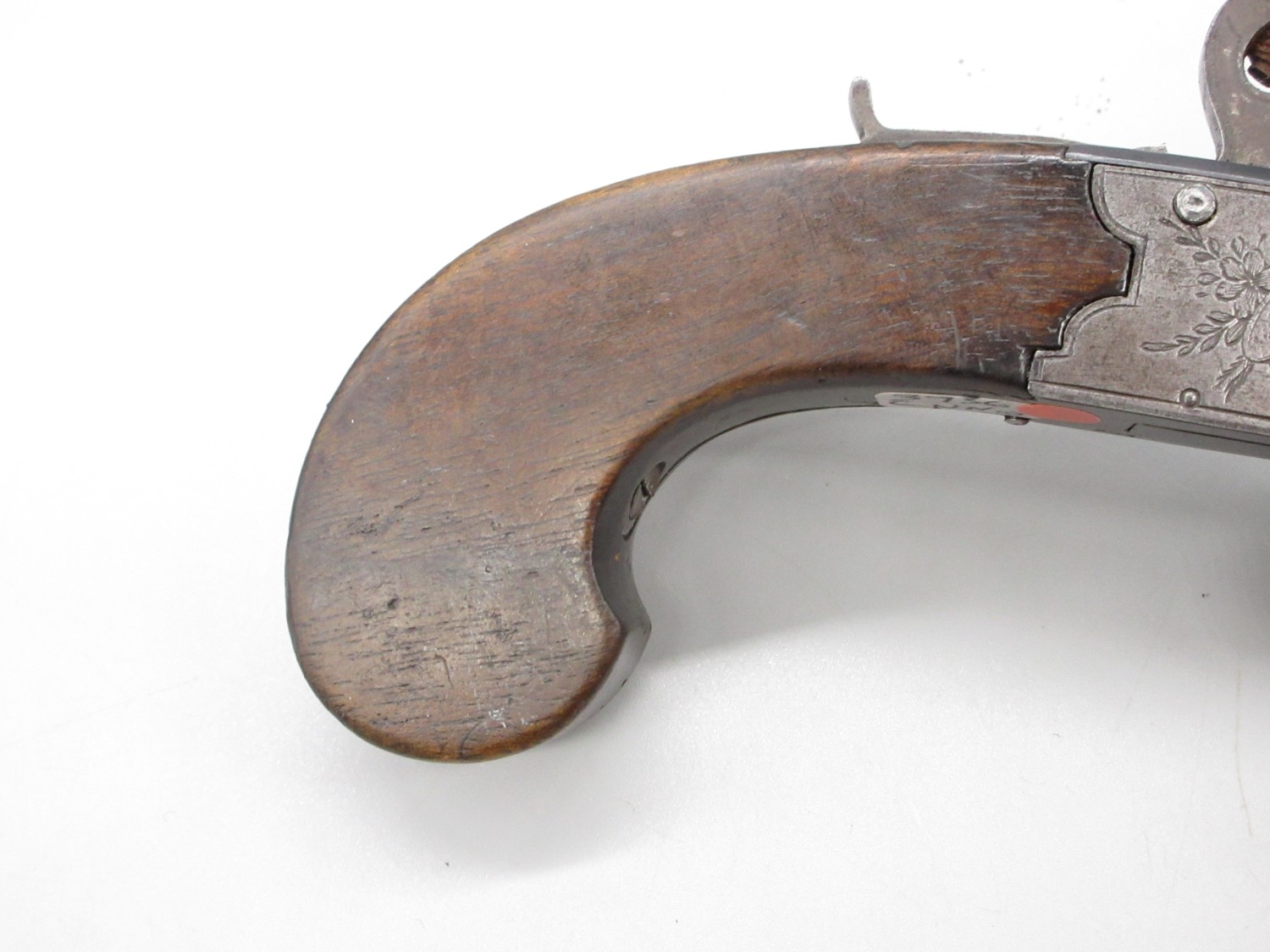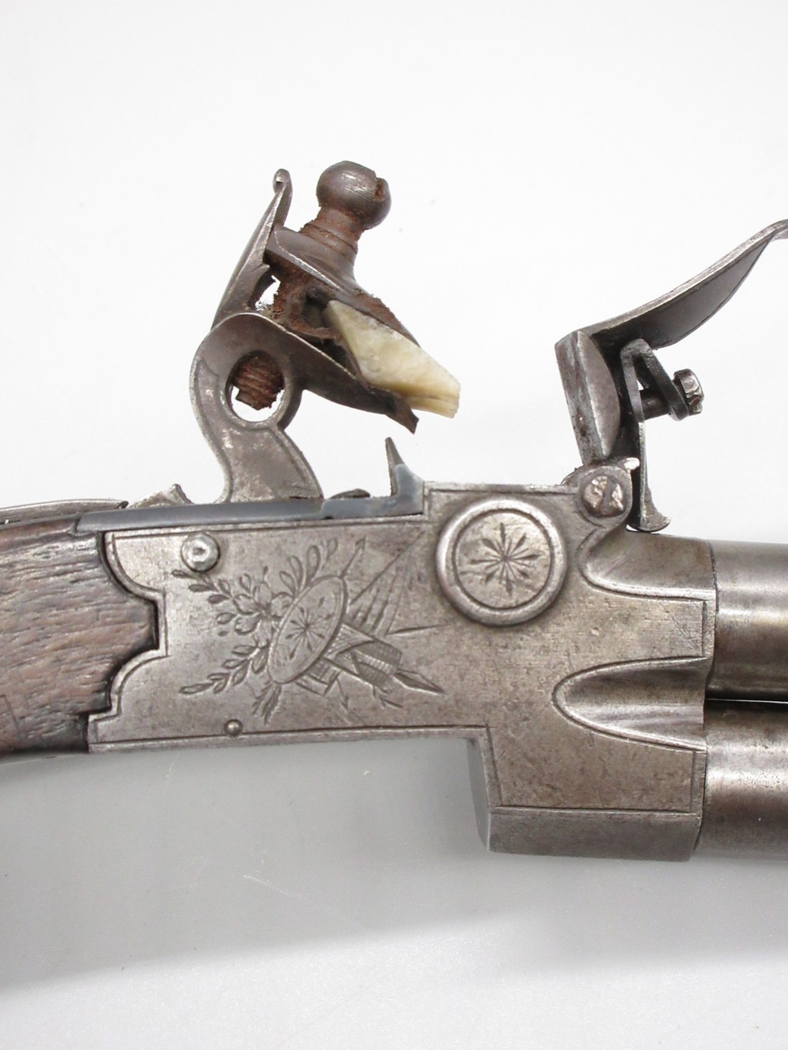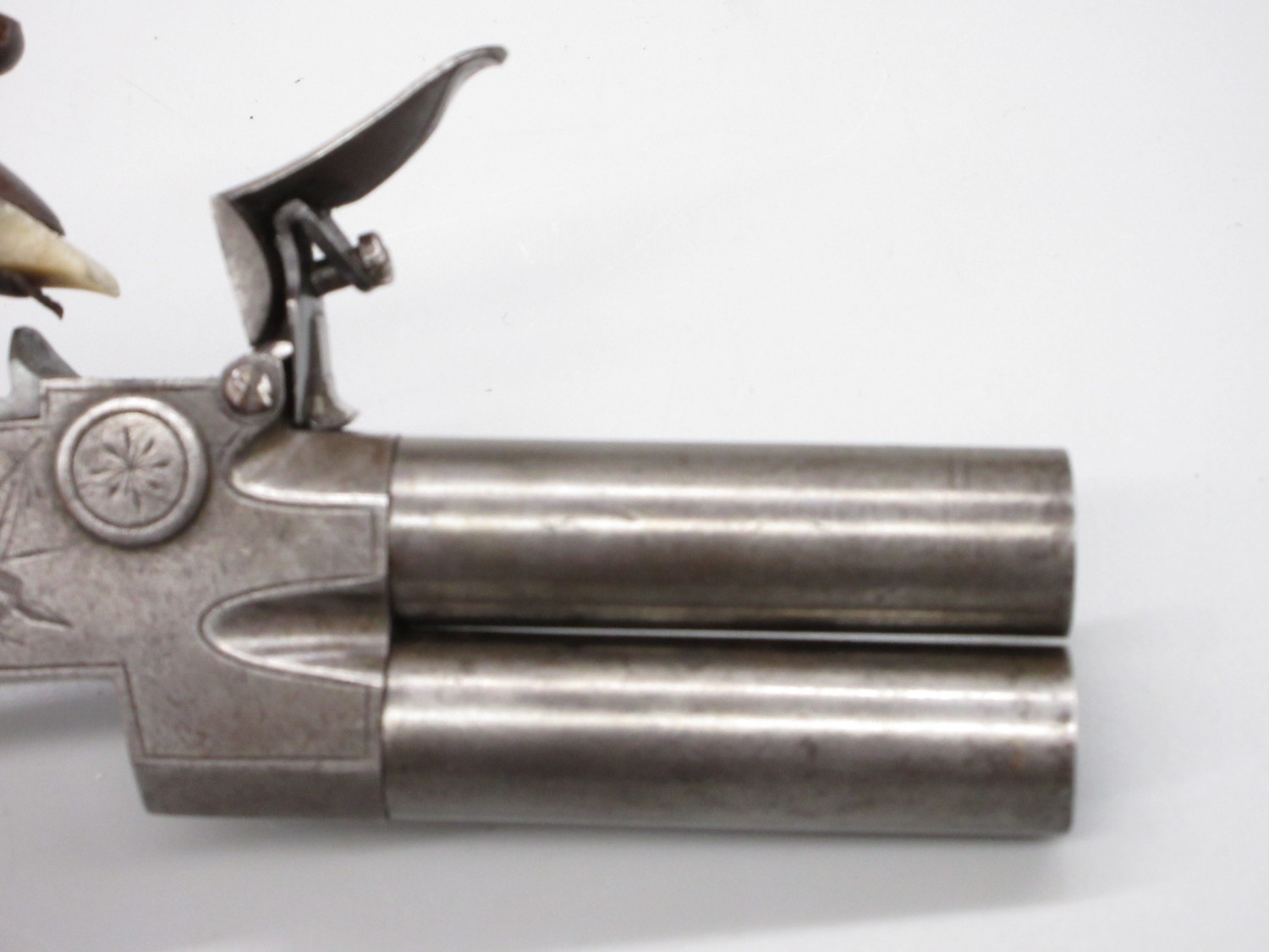 50 bore tap-action flintlock over and under pocket pistol by `Styan', 2.5" turn-off barrels stamped `2,3', star cut muzzles, stamped proof marks, folding trigger and top slide safety, makers name to the lock, 19cm overall