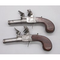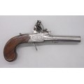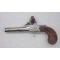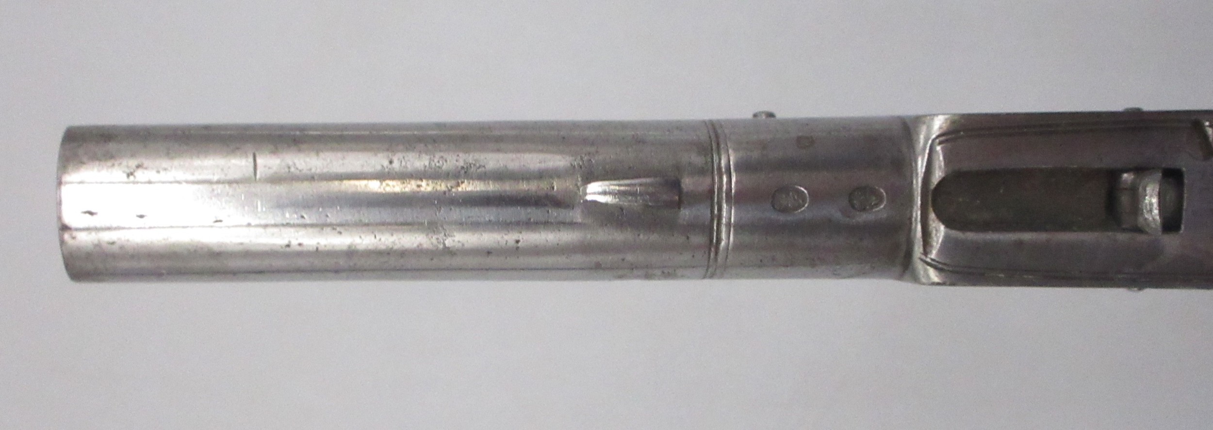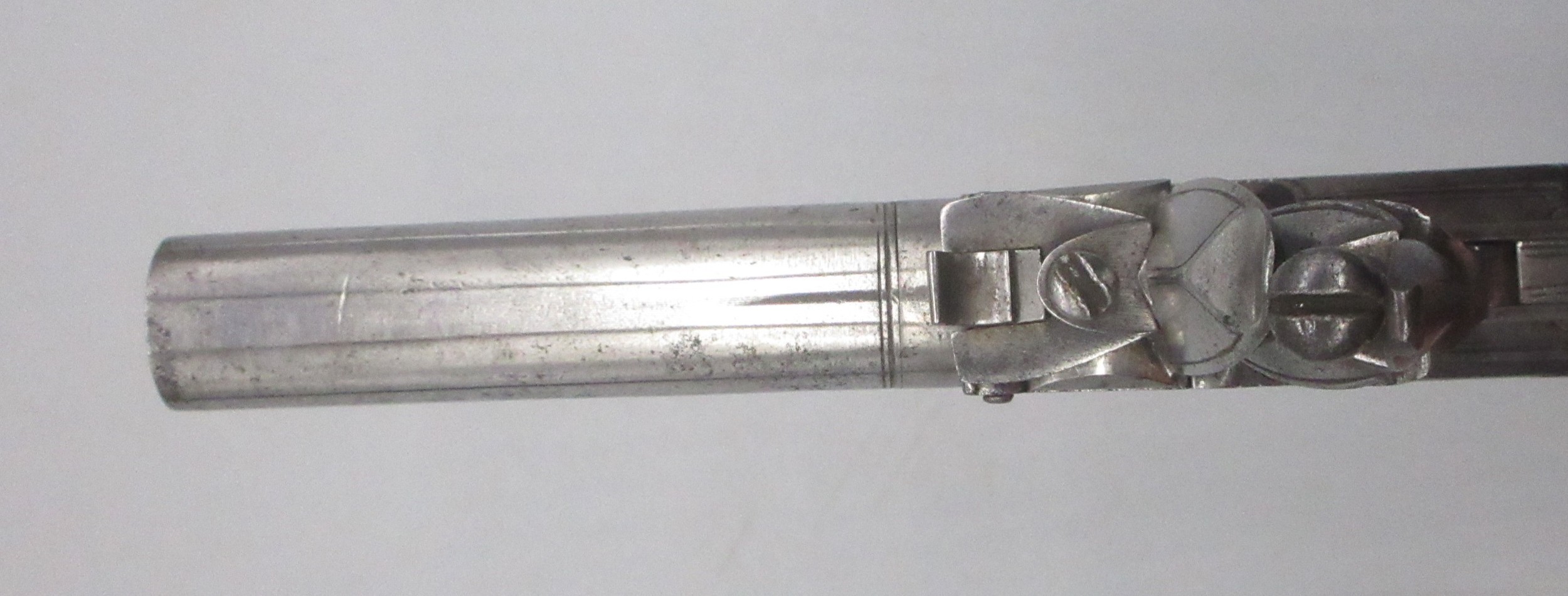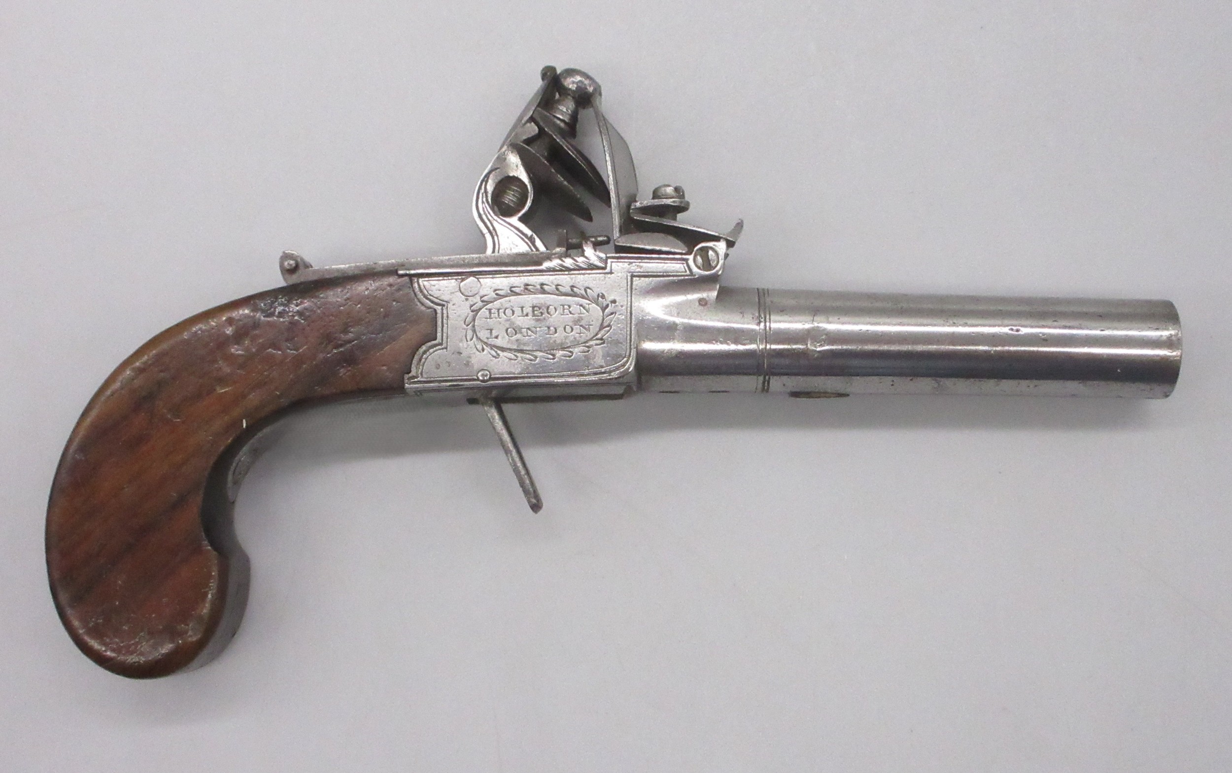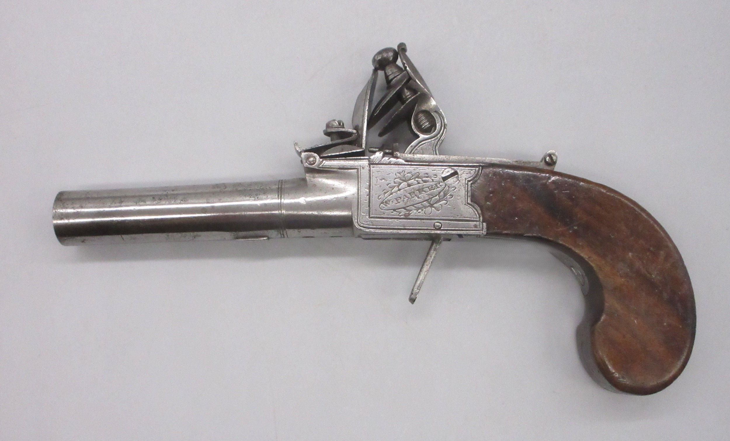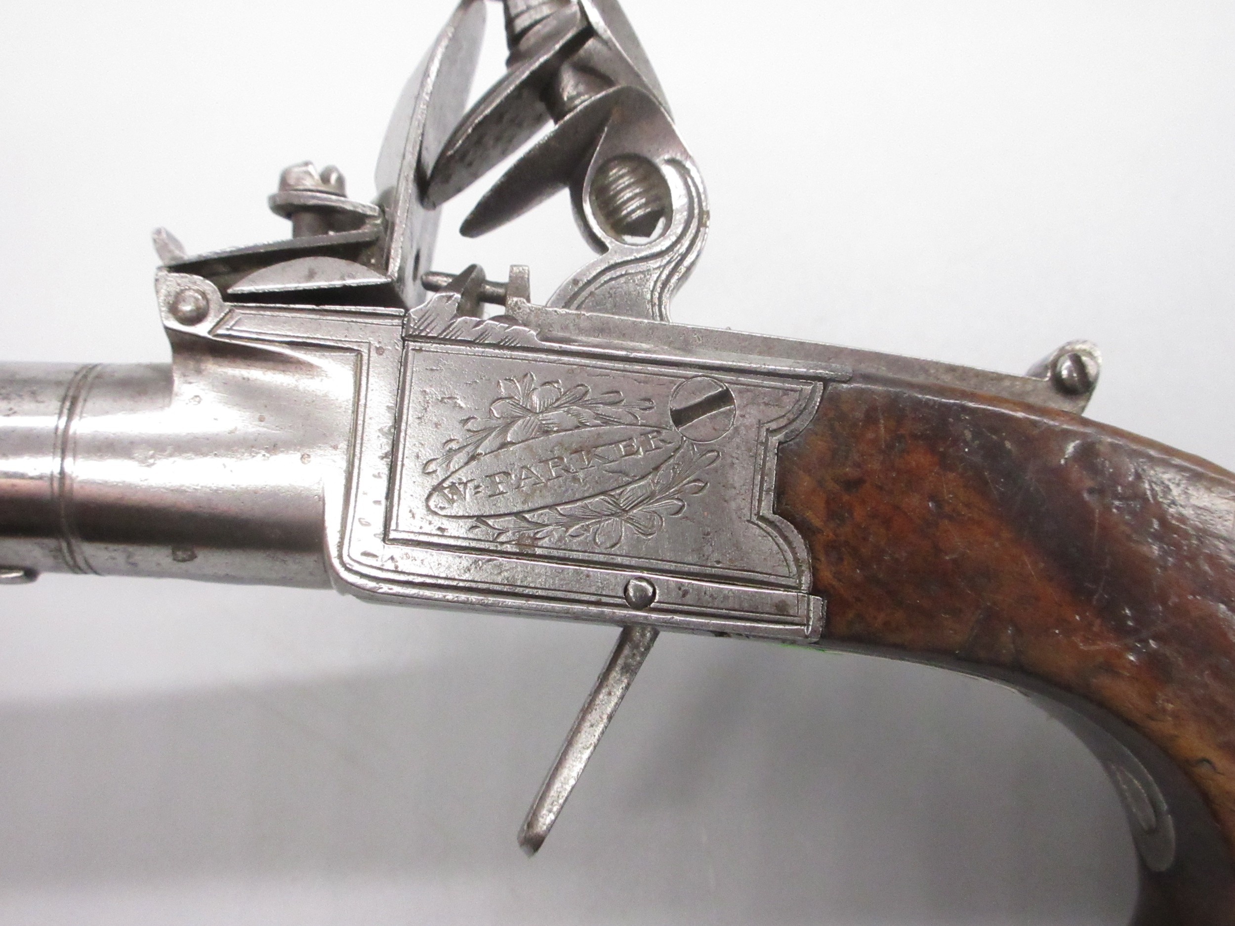 54 bore flintlock pocket pistol by 'W.Parker, Holborn London', 2.5" turn-off barrel, stamped proof marks, folding trigger, top slide safety, engraved and named locks, 17.5cm overall