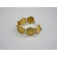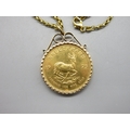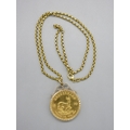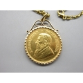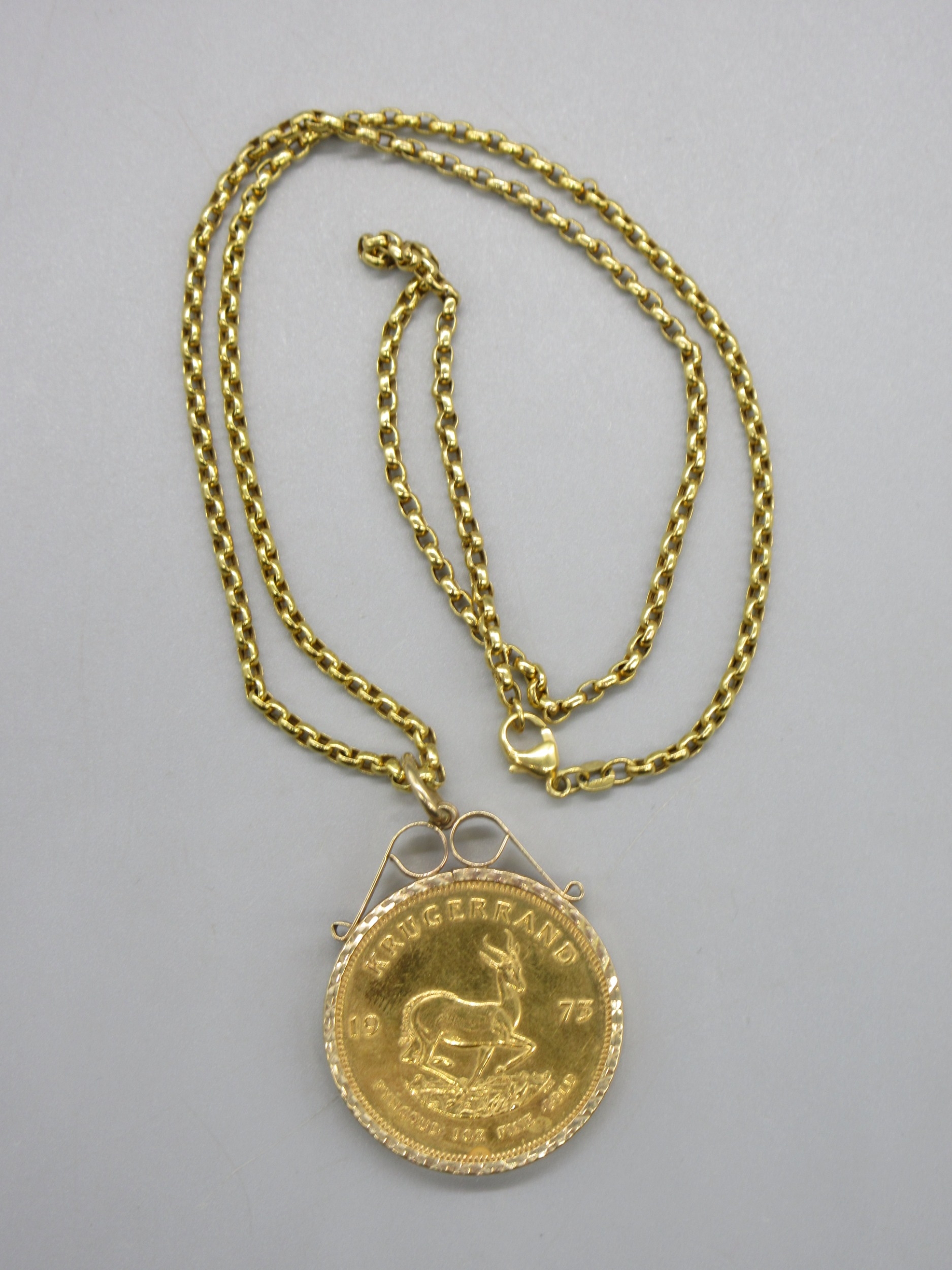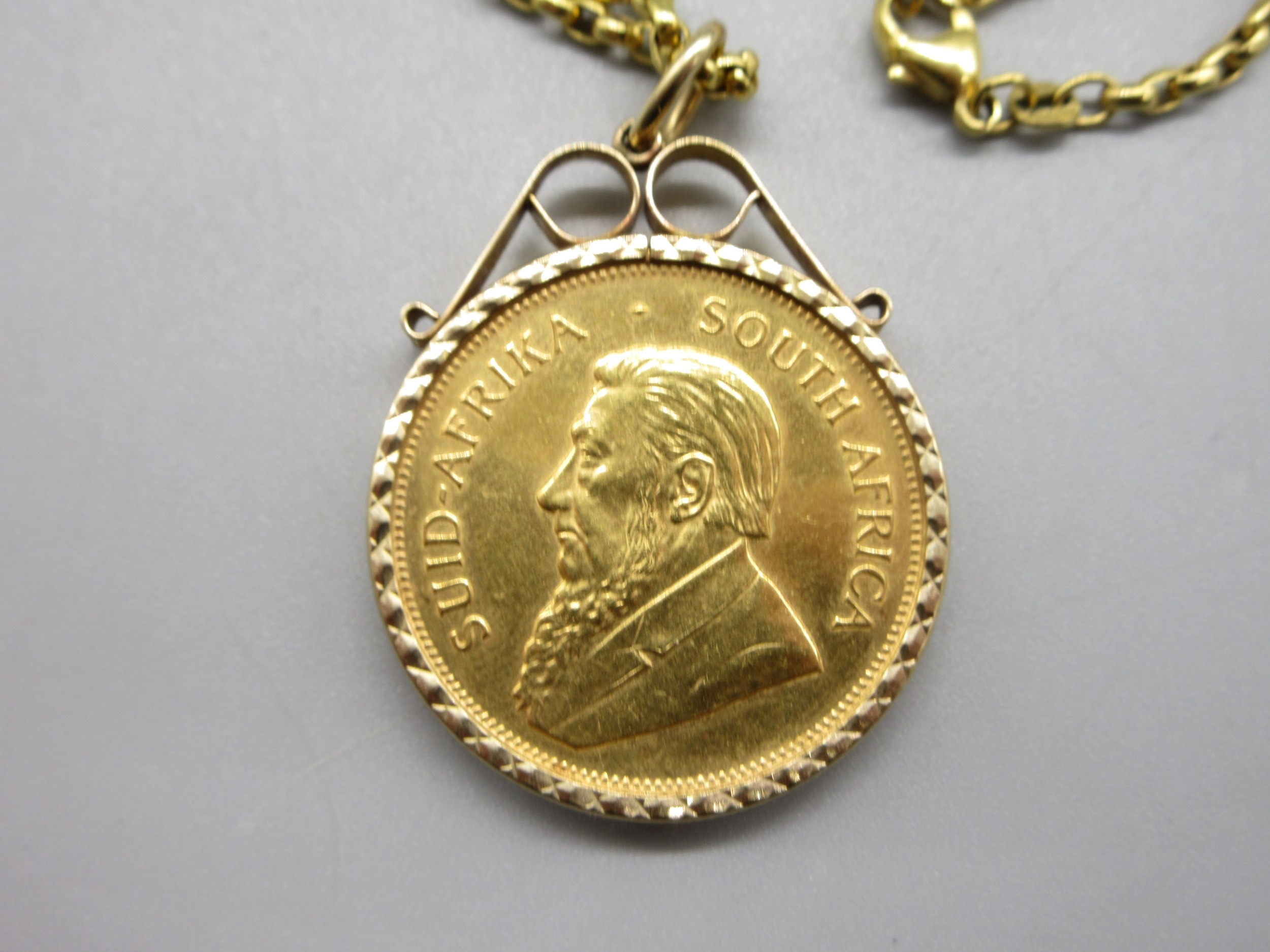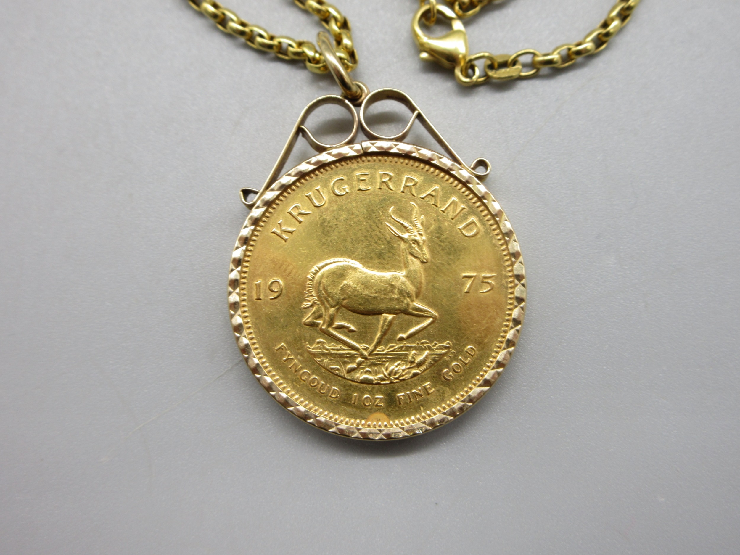 1975 1oz Krugerrand in 9ct hallmarked mount with .375 hallmarked to clasp chain (44.7g)