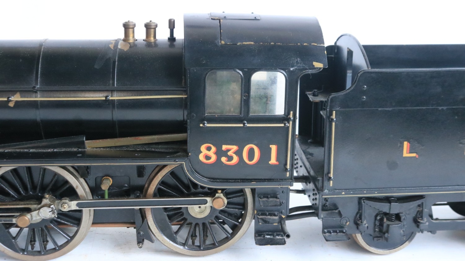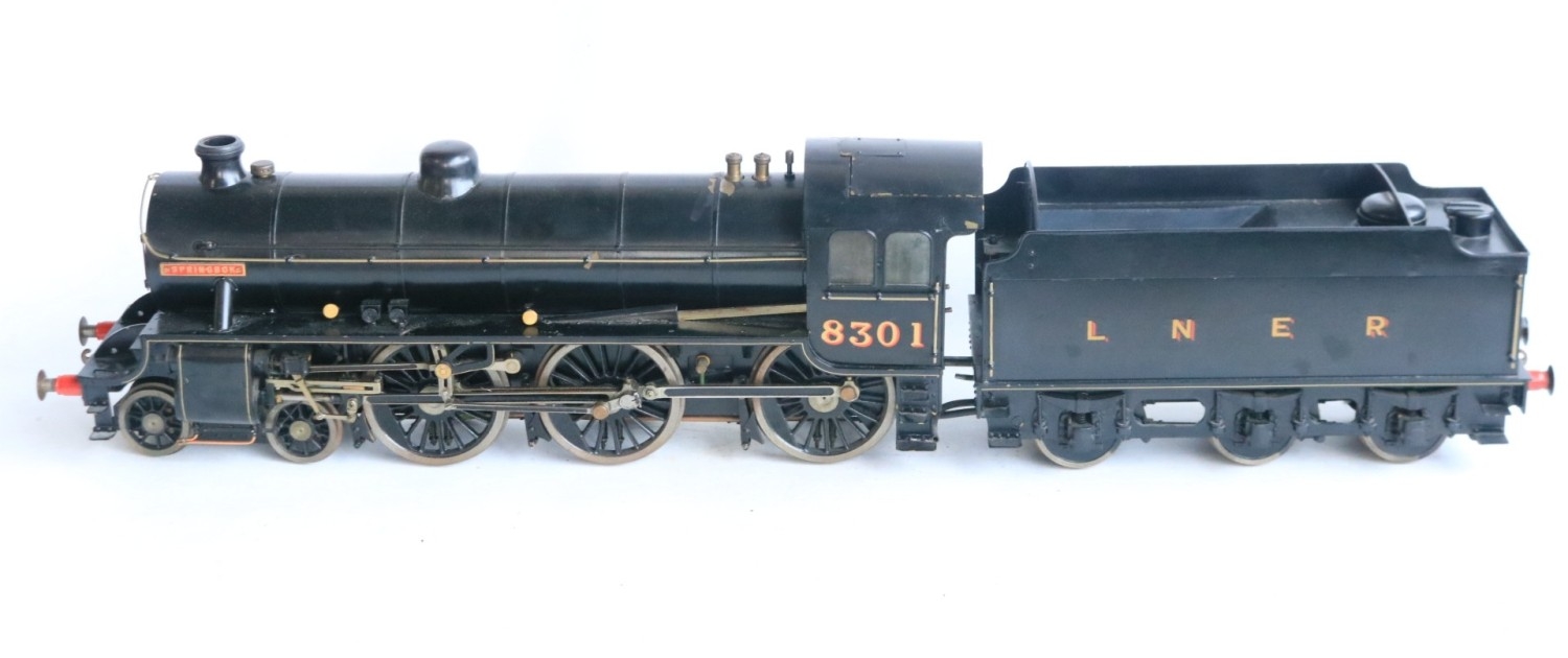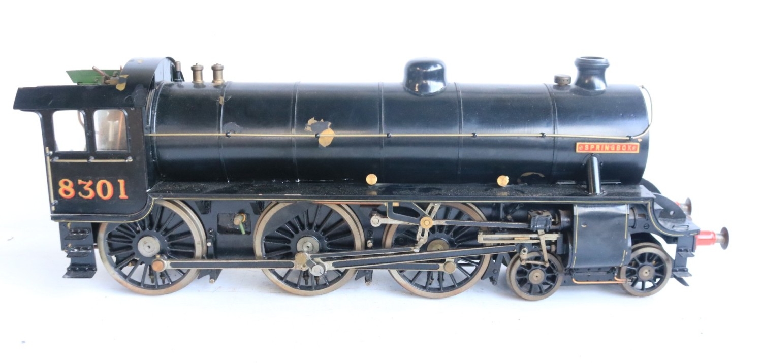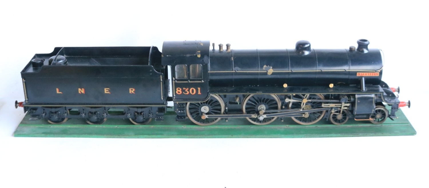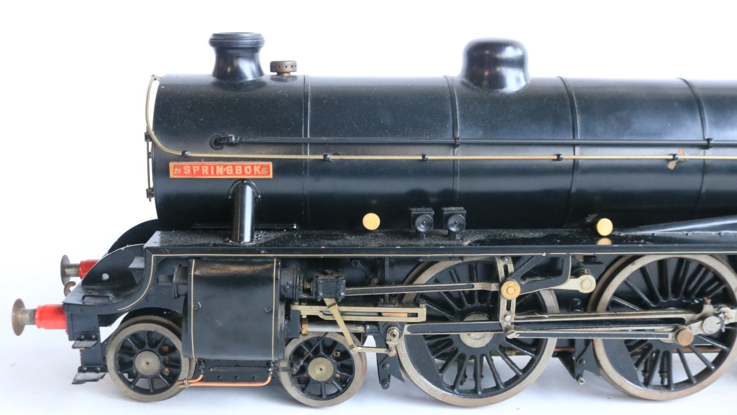 Large scale all metal 3.5" gauge live steam LNER Thompson Class B1 4-6-0 8301 'Springbok' locomotive model and tender, with working suspension and sprung buffers (please note left side tender rear buffer jammed in compressed position and some loose parts on model), no boiler certificate and would likely need a comprehensive service should any potential buyer wish to bring her back to life, the model would however make for a stunning static display as is, some fairly extensive paint chipping and please note front bogey loose but with fixing nut and some other loose parts (please refer to photos), overall dimensions approx length 119cm, width 17.5cm, height 26cm, complete with green painted wood base