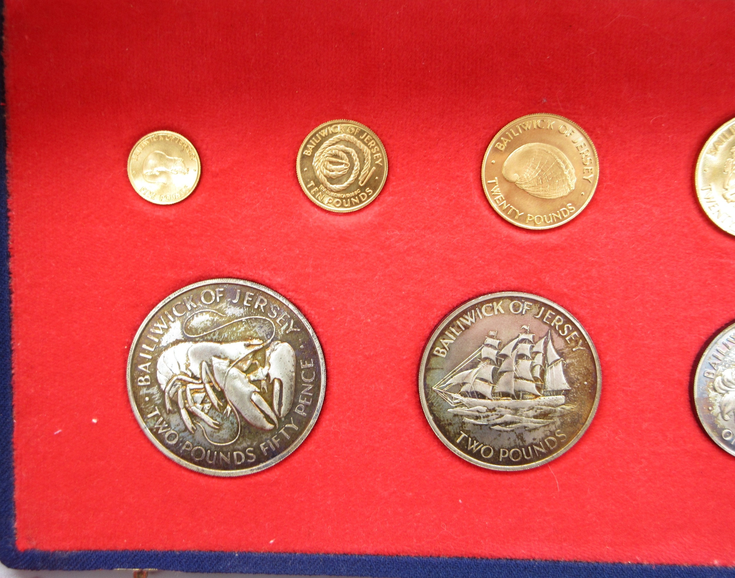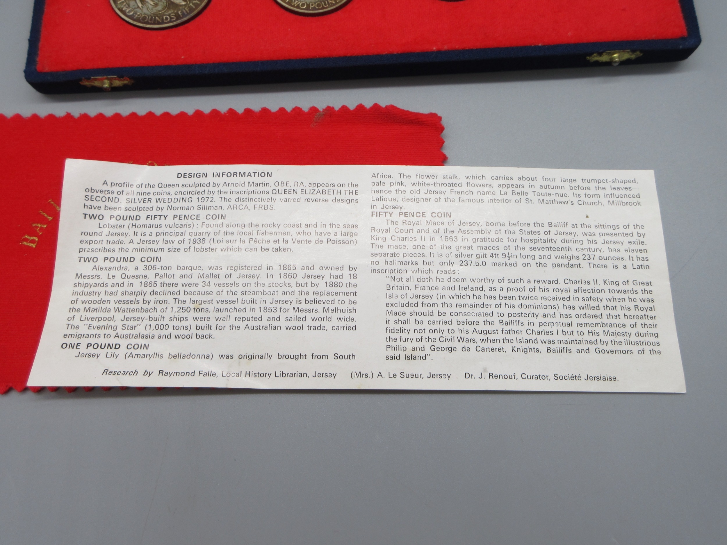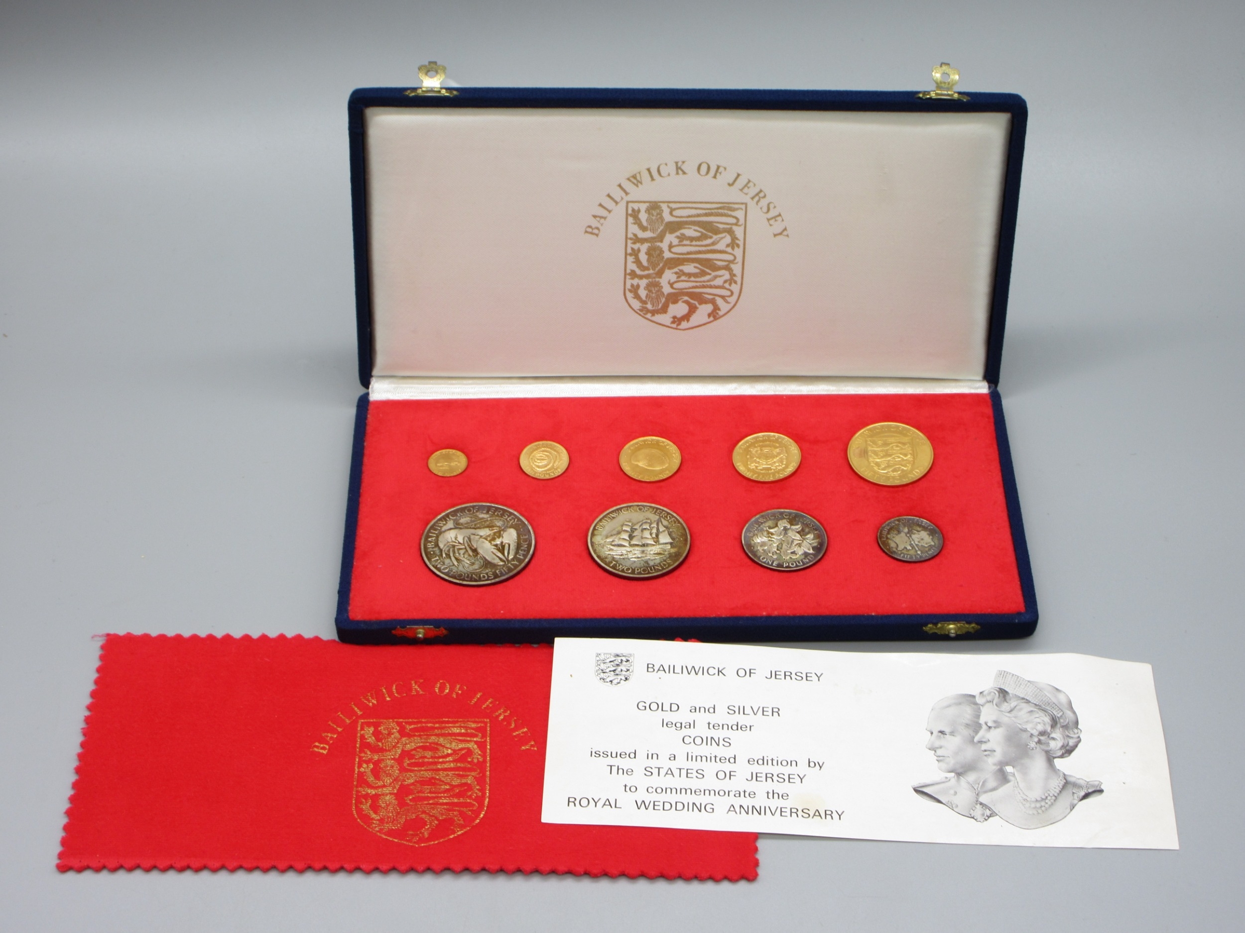 Bailiwick of Jersey - Elizabeth II (1952-2022), 1972 Royal Wedding Anniversary Nine-Coin Gold and Silver Set, comprising a Fifty Pounds, (22ct, approx. 22.63g), Twenty-Five Pounds (22ct, approx. 11.9g), Twenty Pounds (22ct, approx. 9.26g), Ten Pounds (22ct, approx. 4.64g), Five Pounds (22ct, approx. 2.62g), and silver coins comprising Two Pounds Fifty, Two Pounds, One Pound and, Fifty Pence, housed in presentation case
