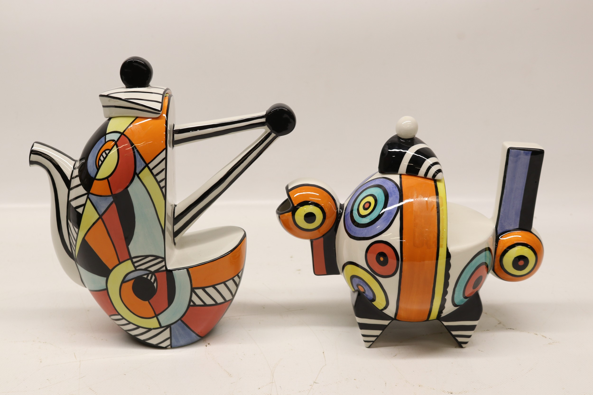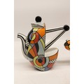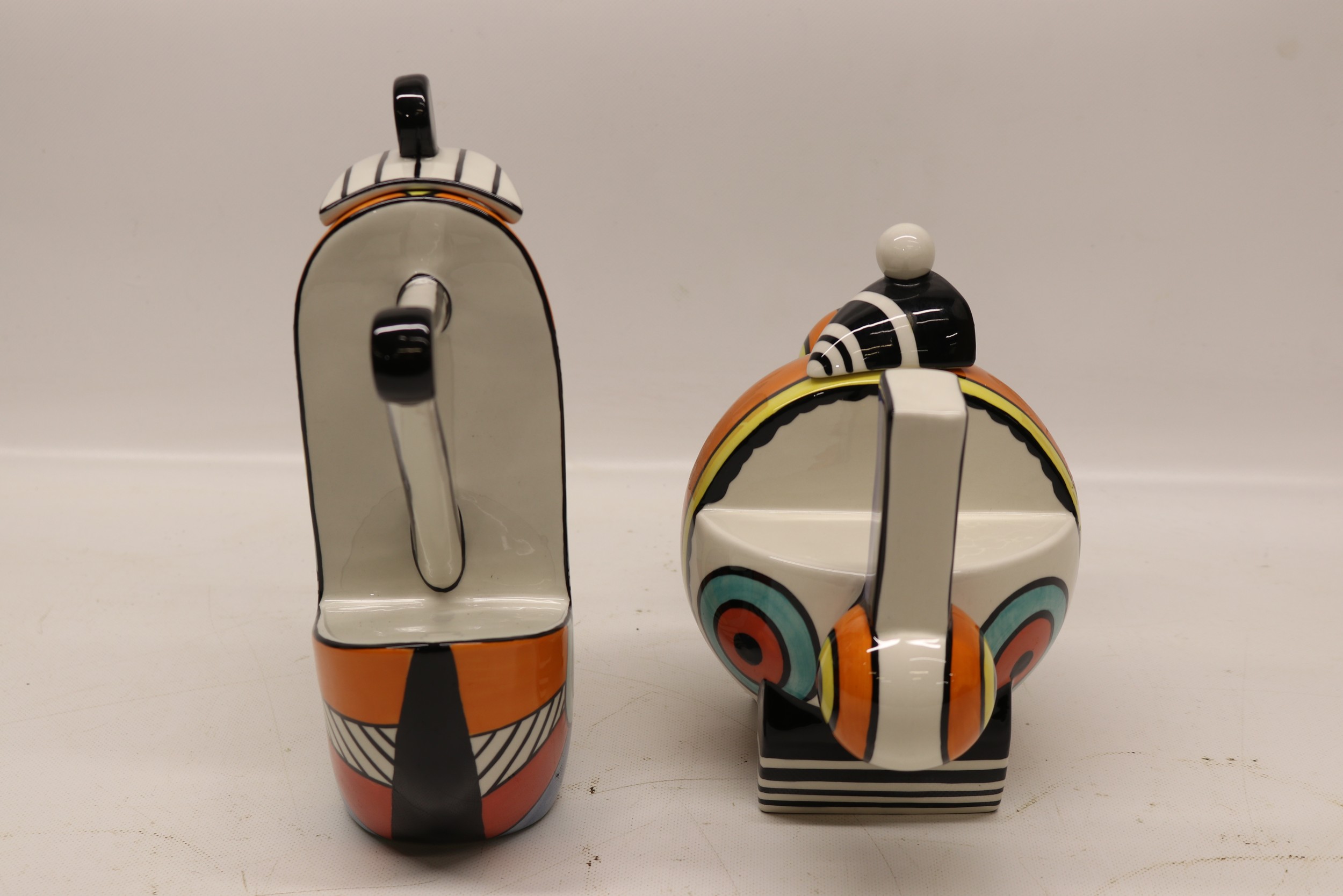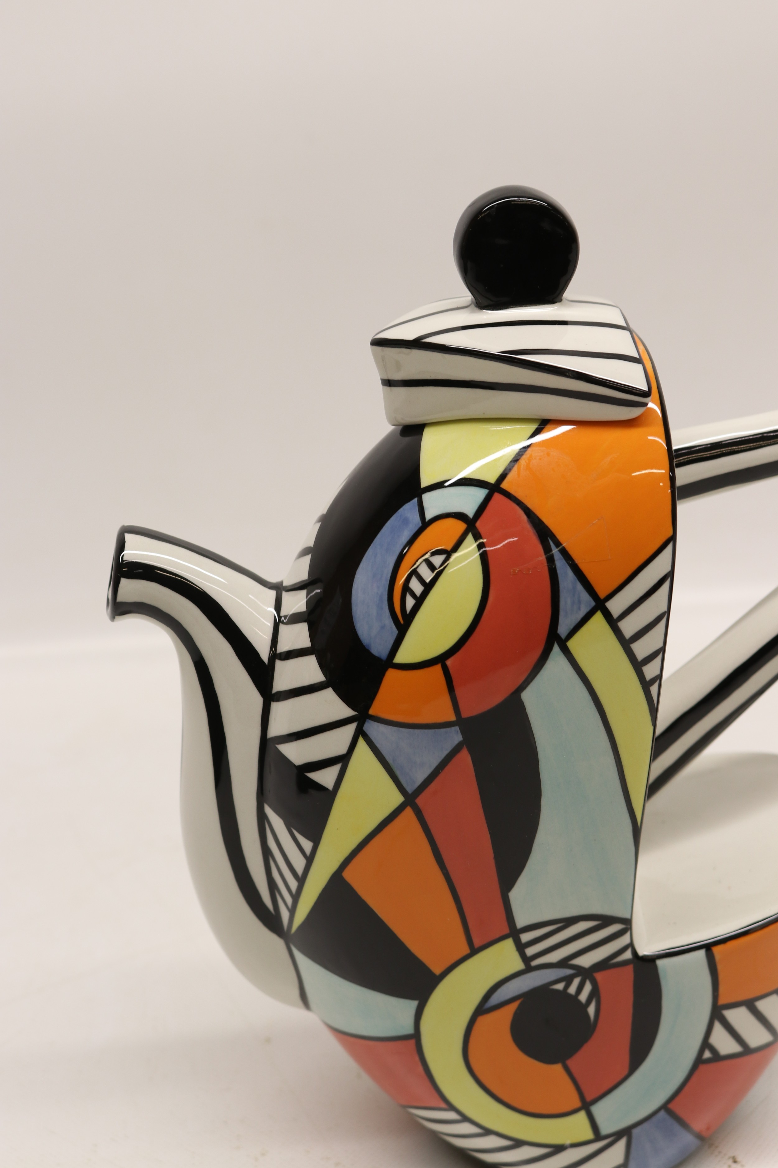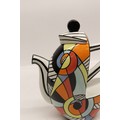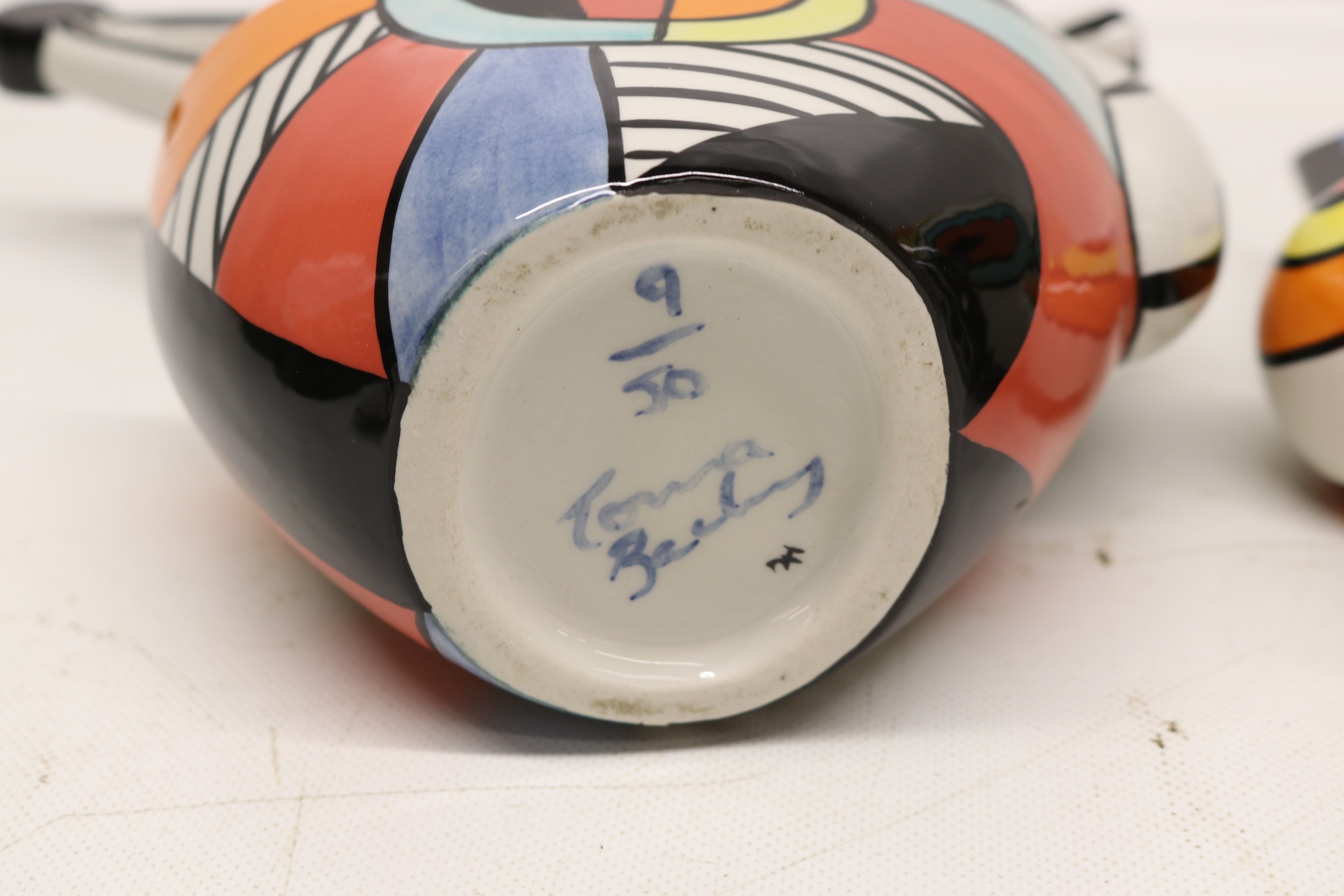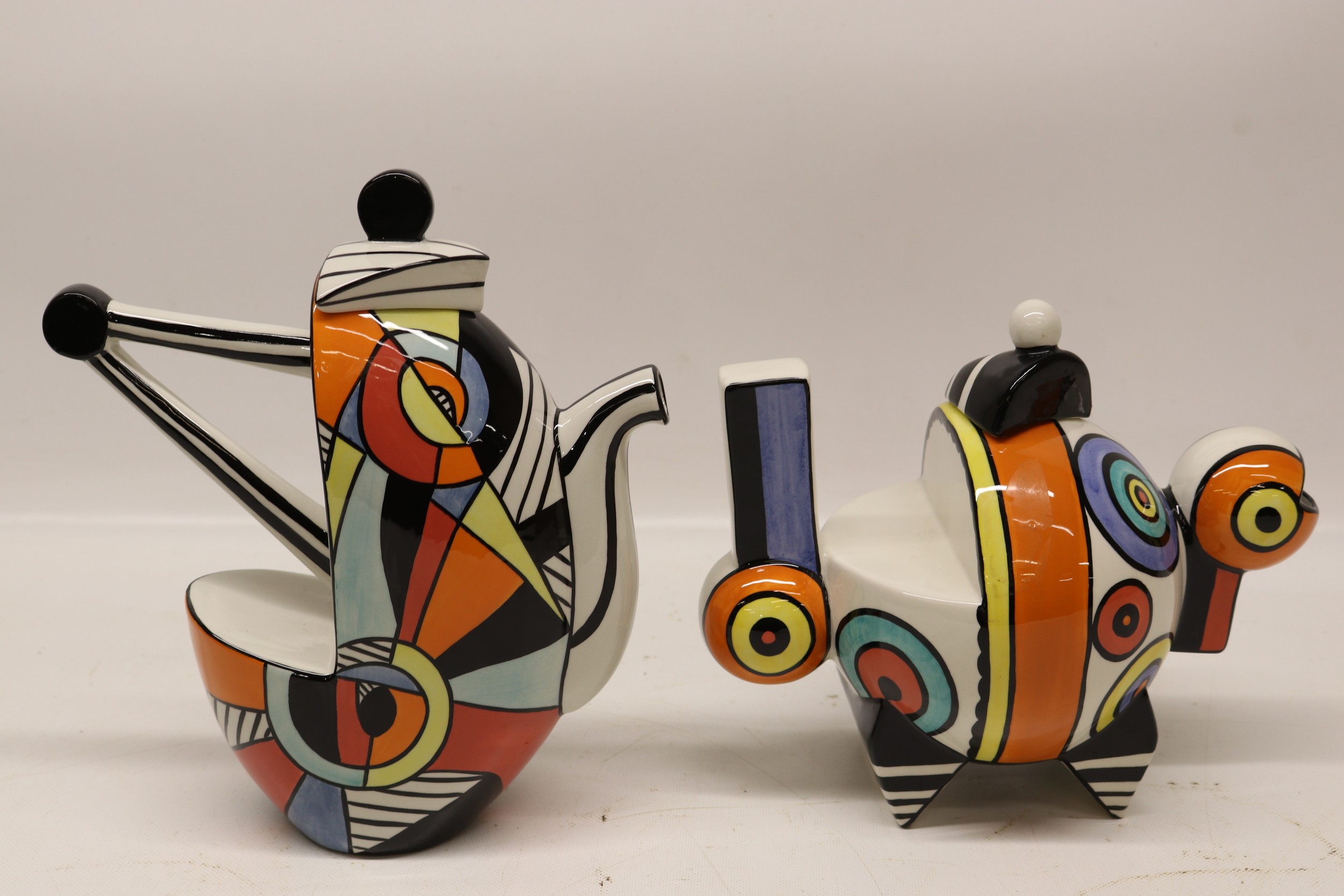 Lorna Bailey tall Art Deco, limited edition No.9/50, decorated in black, red, orange and yellow, approx. H25cm, signed and numbered to base; Lorna Bailey squat Art Deco teapot, decorated in blue, green, yellow, red, orange and black, signed to base