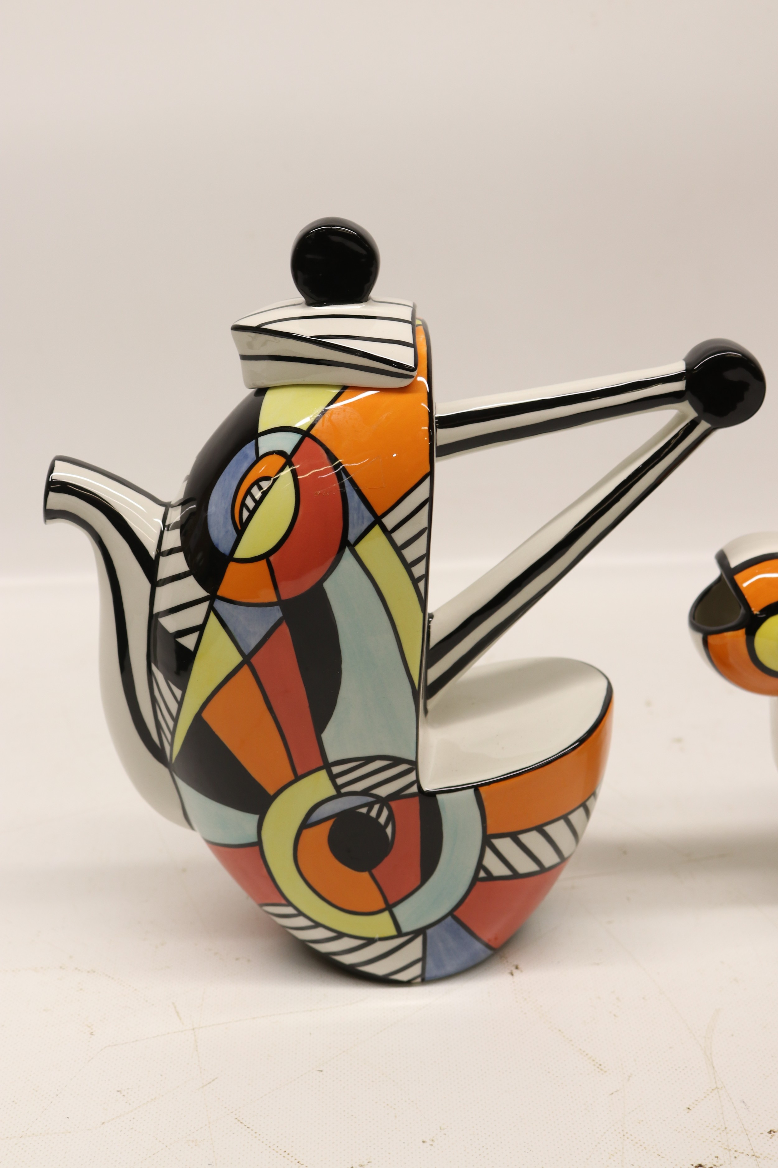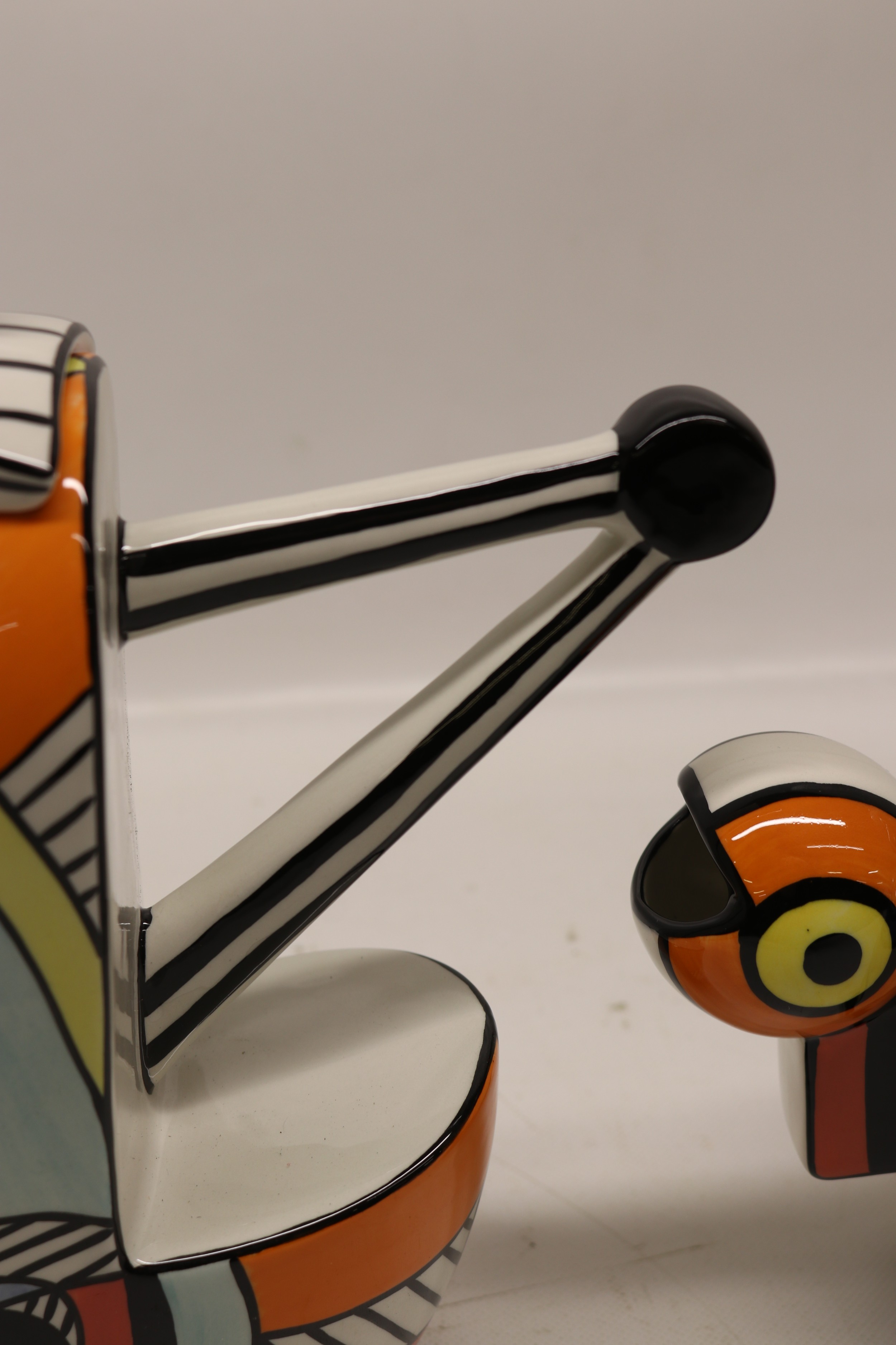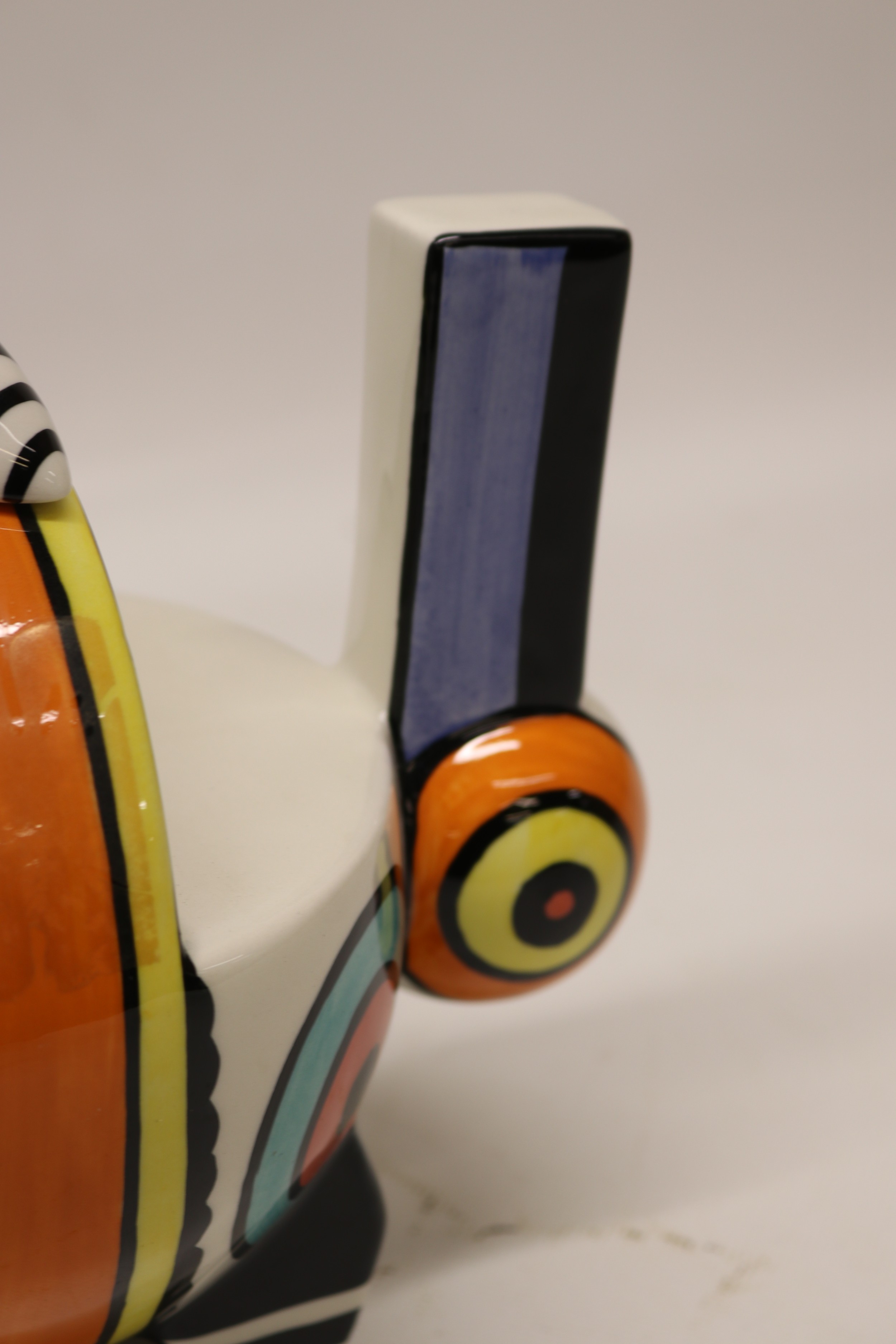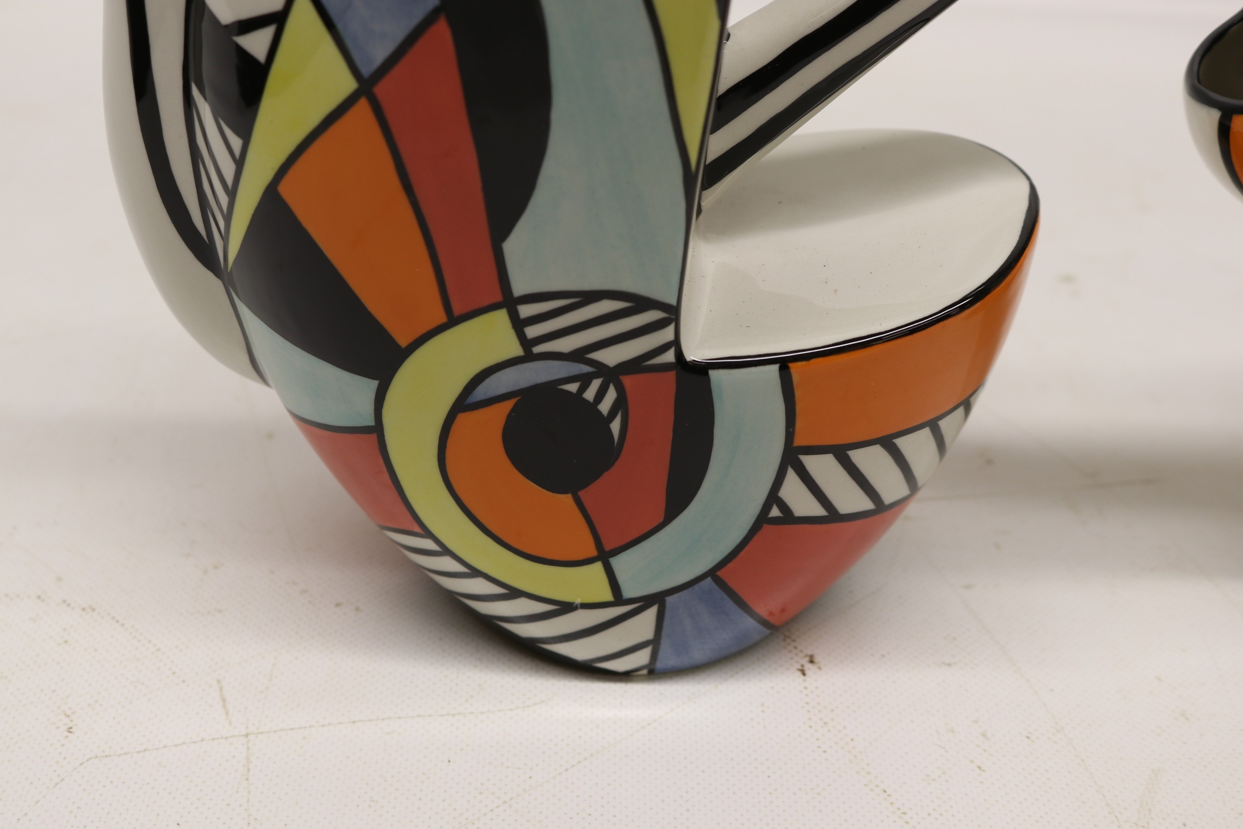 Lorna Bailey tall Art Deco, limited edition No.9/50, decorated in black, red, orange and yellow, approx. H25cm, signed and numbered to base; Lorna Bailey squat Art Deco teapot, decorated in blue, green, yellow, red, orange and black, signed to base