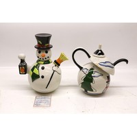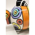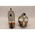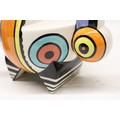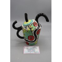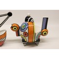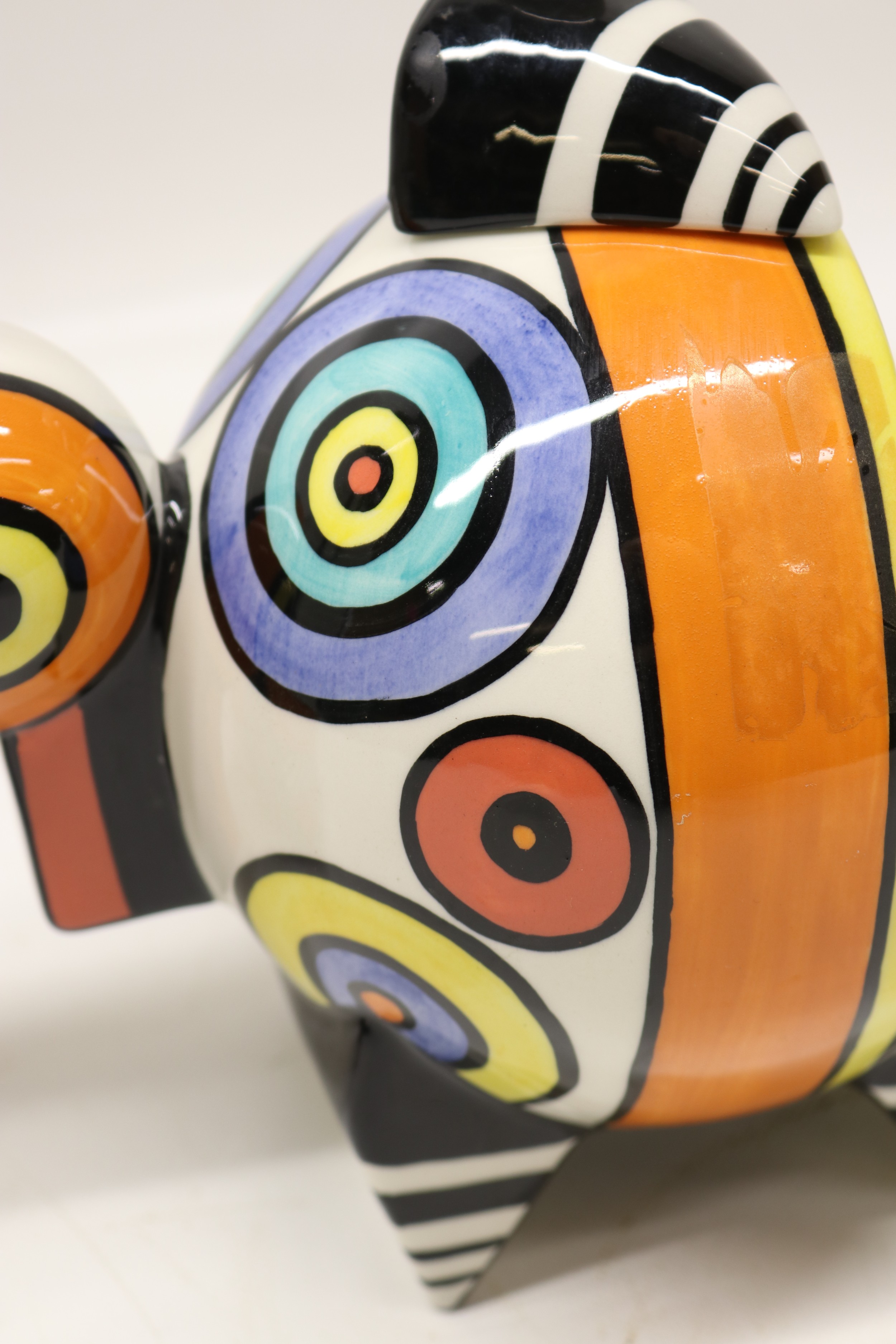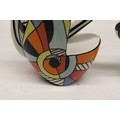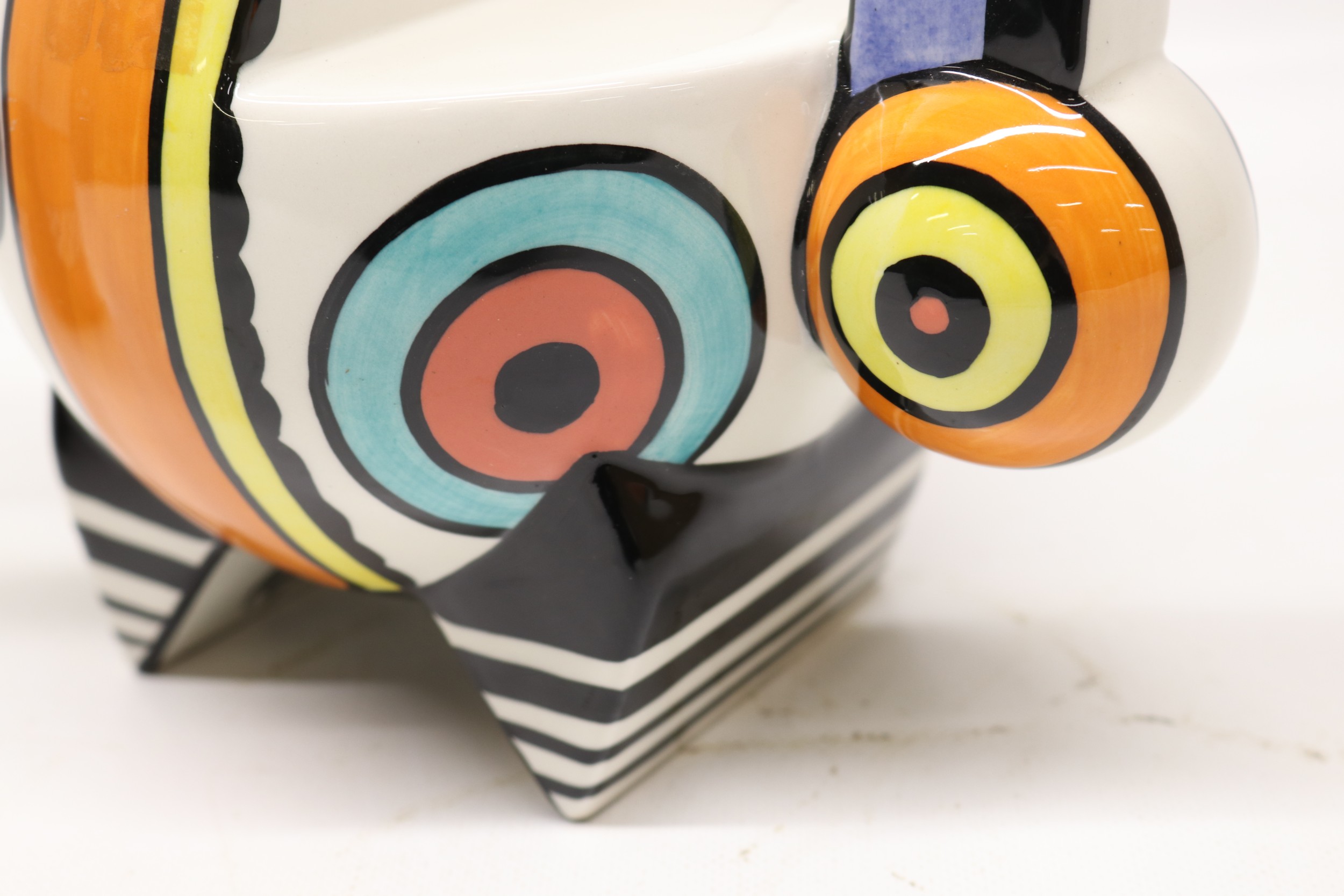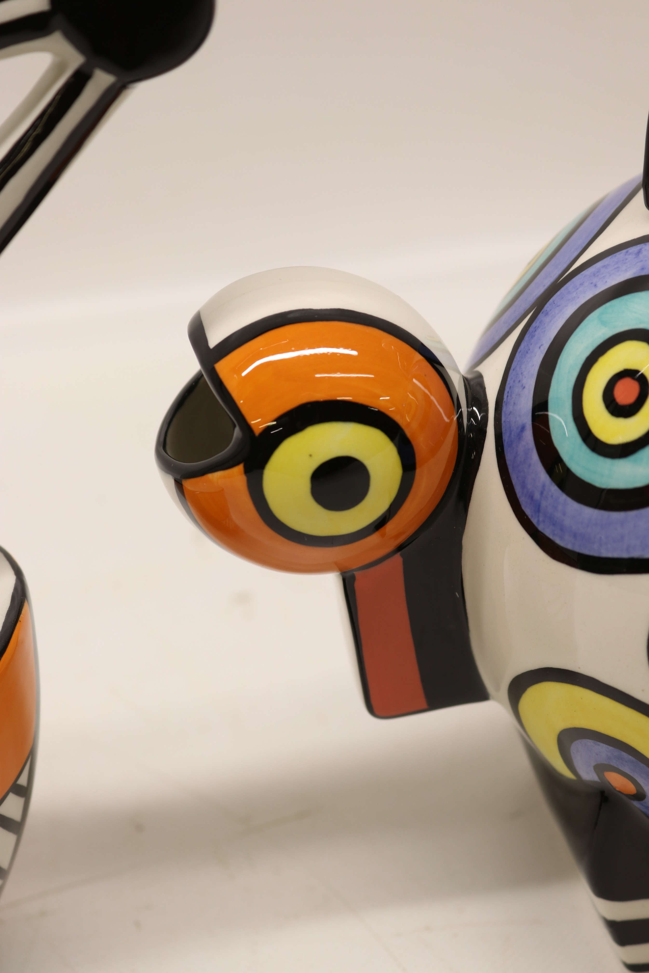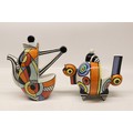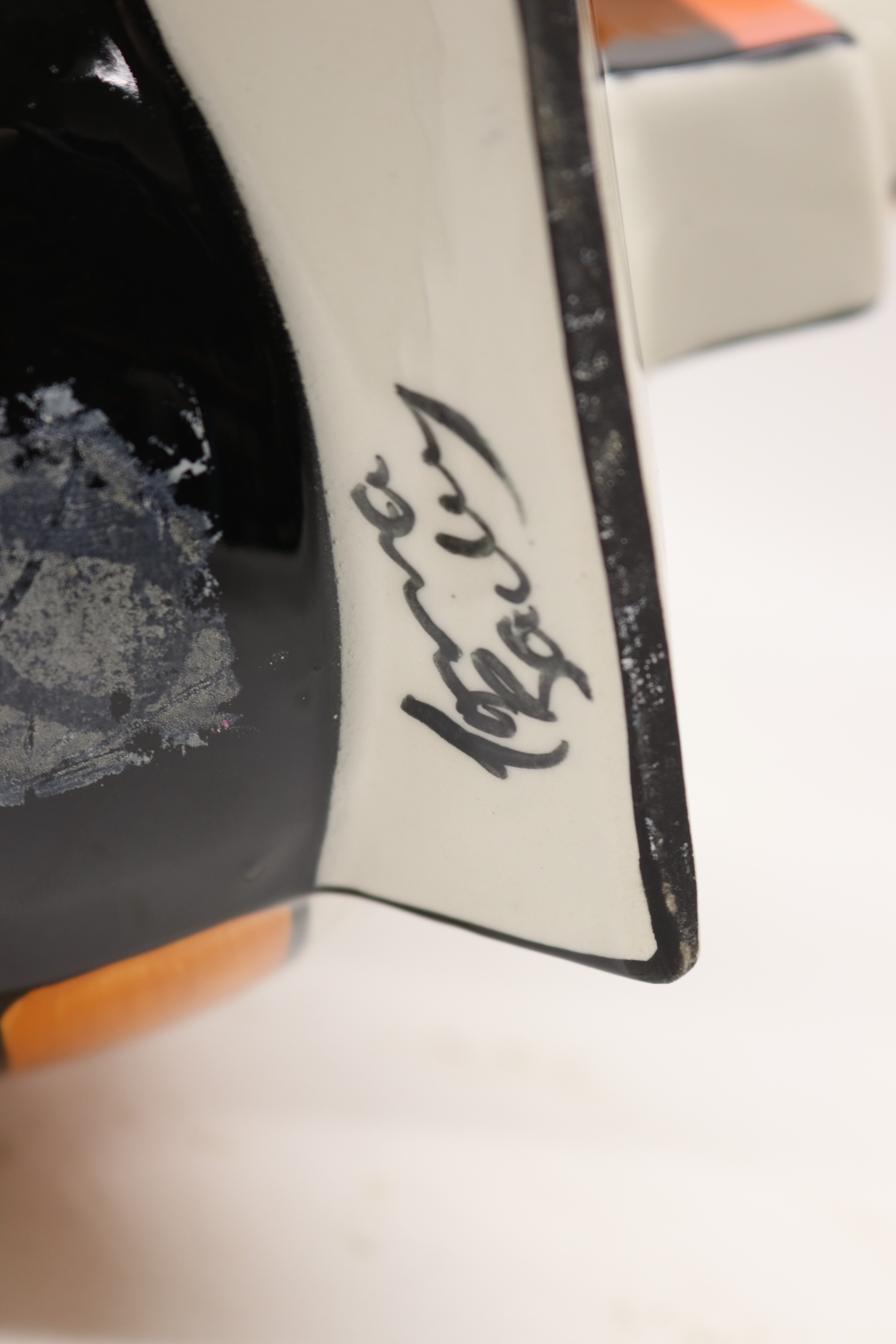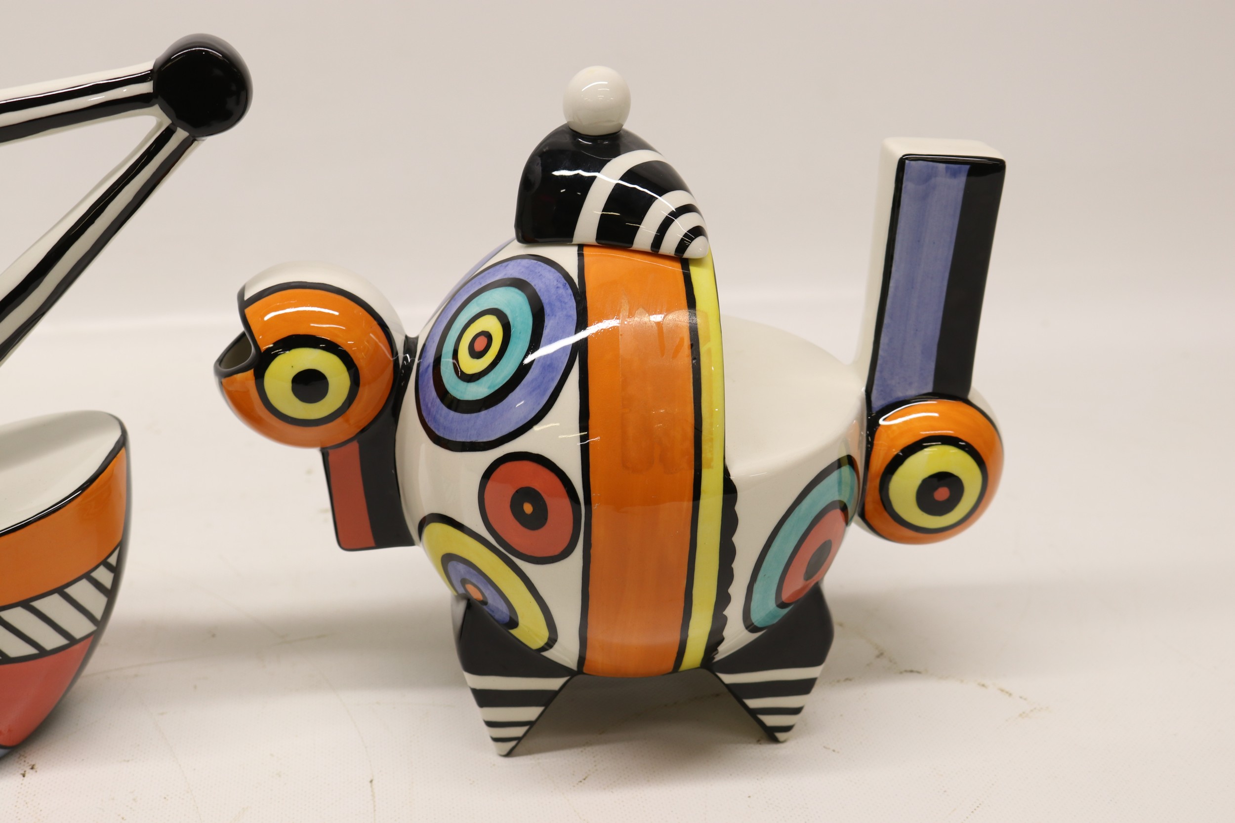 Lorna Bailey tall Art Deco, limited edition No.9/50, decorated in black, red, orange and yellow, approx. H25cm, signed and numbered to base; Lorna Bailey squat Art Deco teapot, decorated in blue, green, yellow, red, orange and black, signed to base
