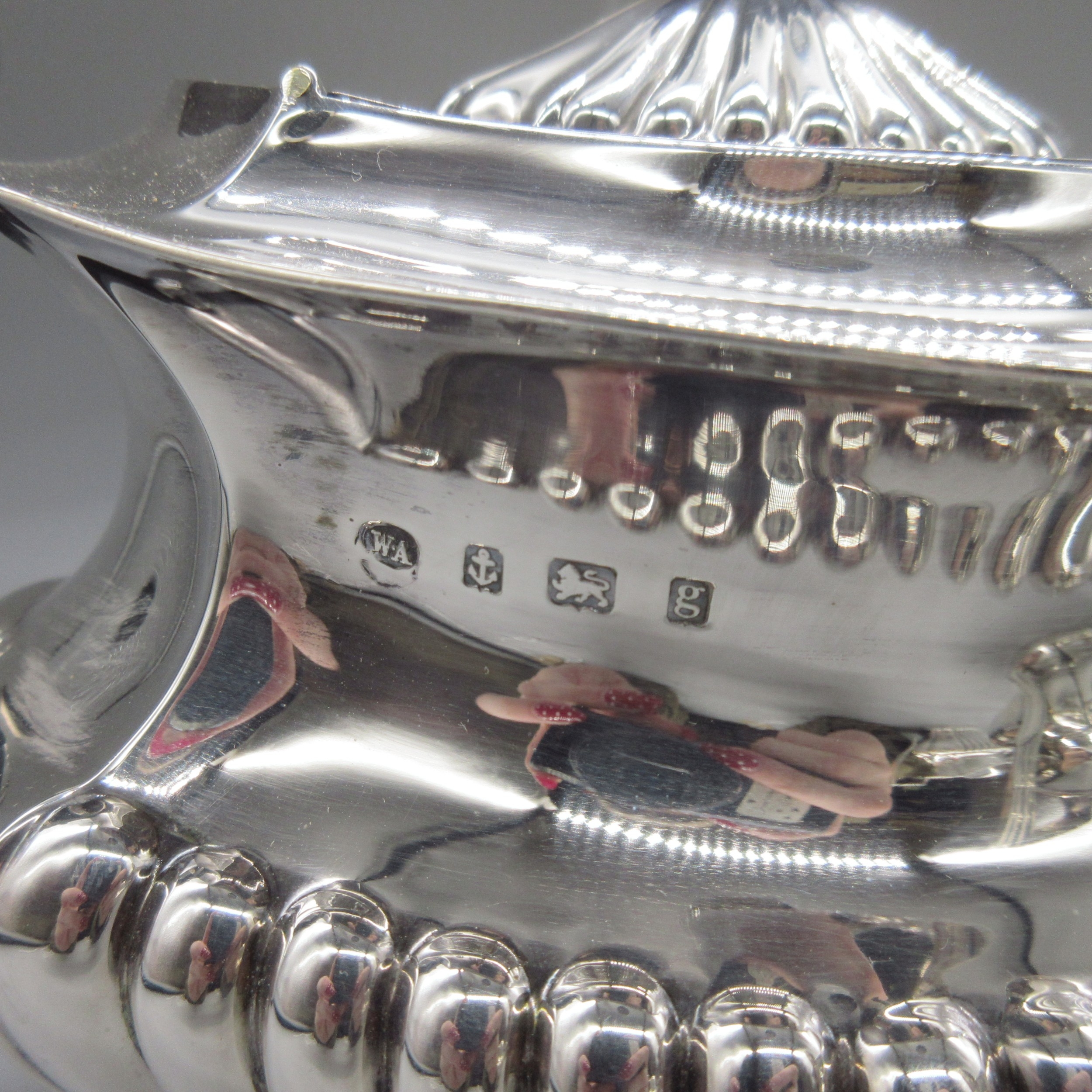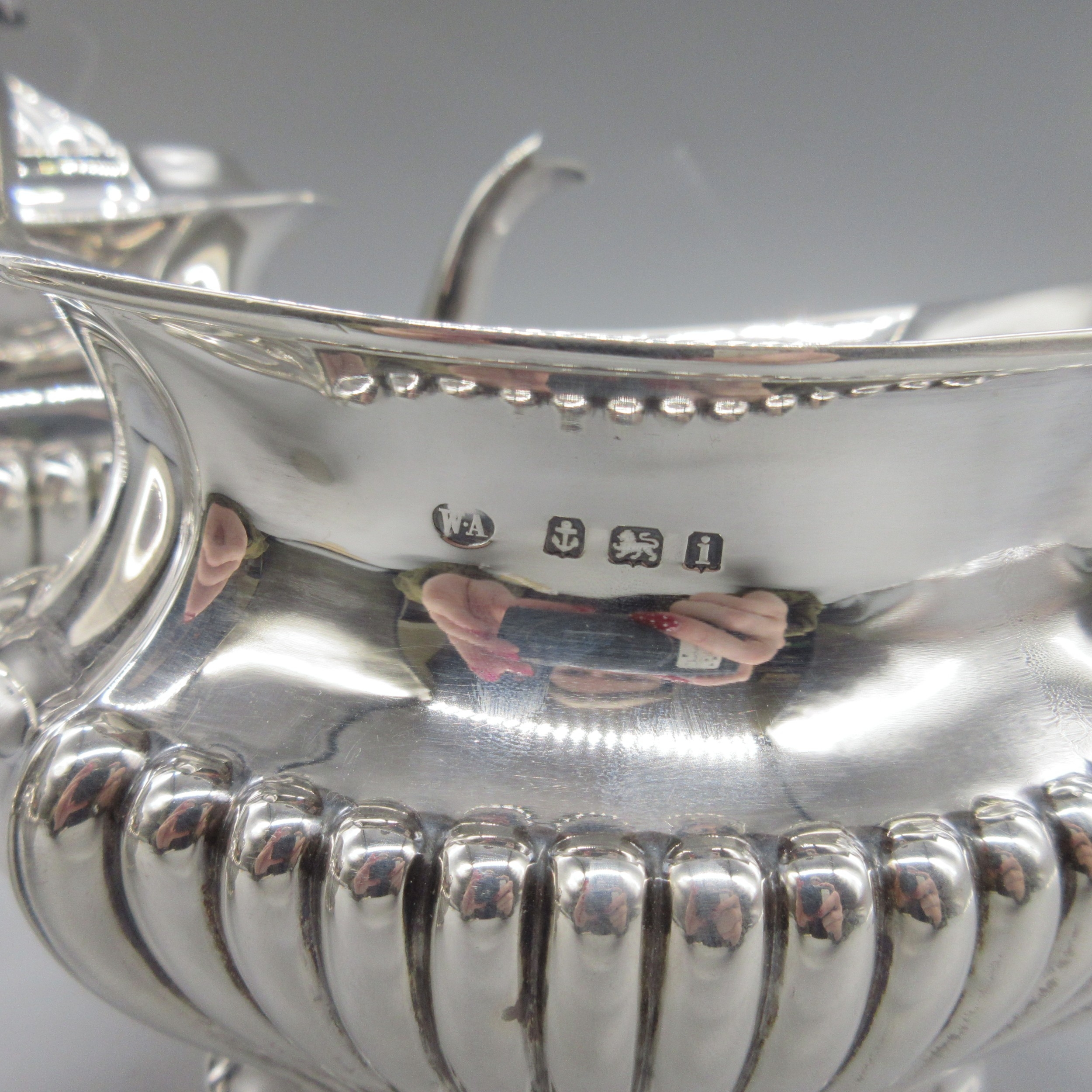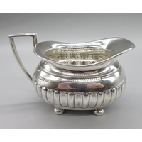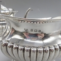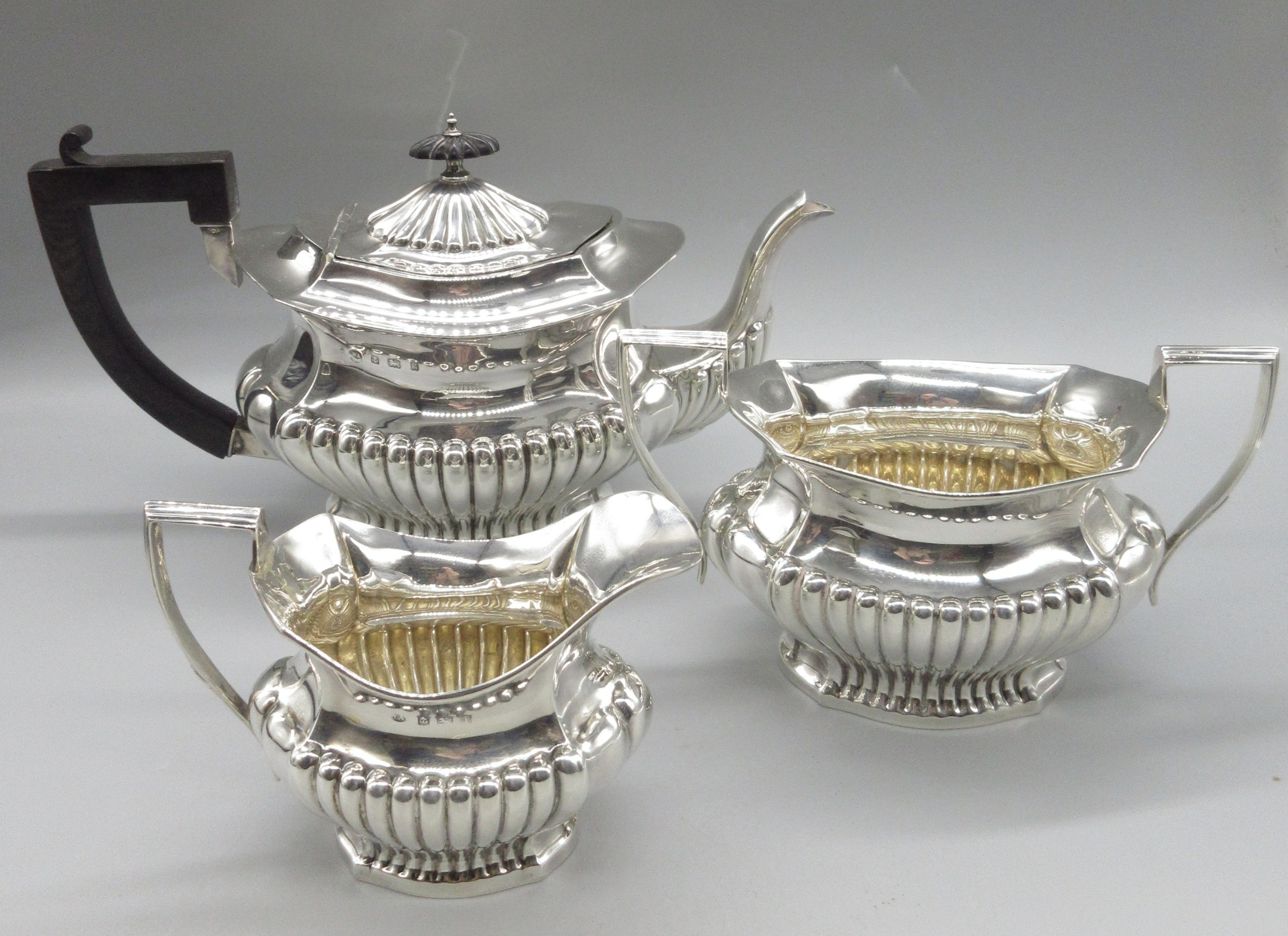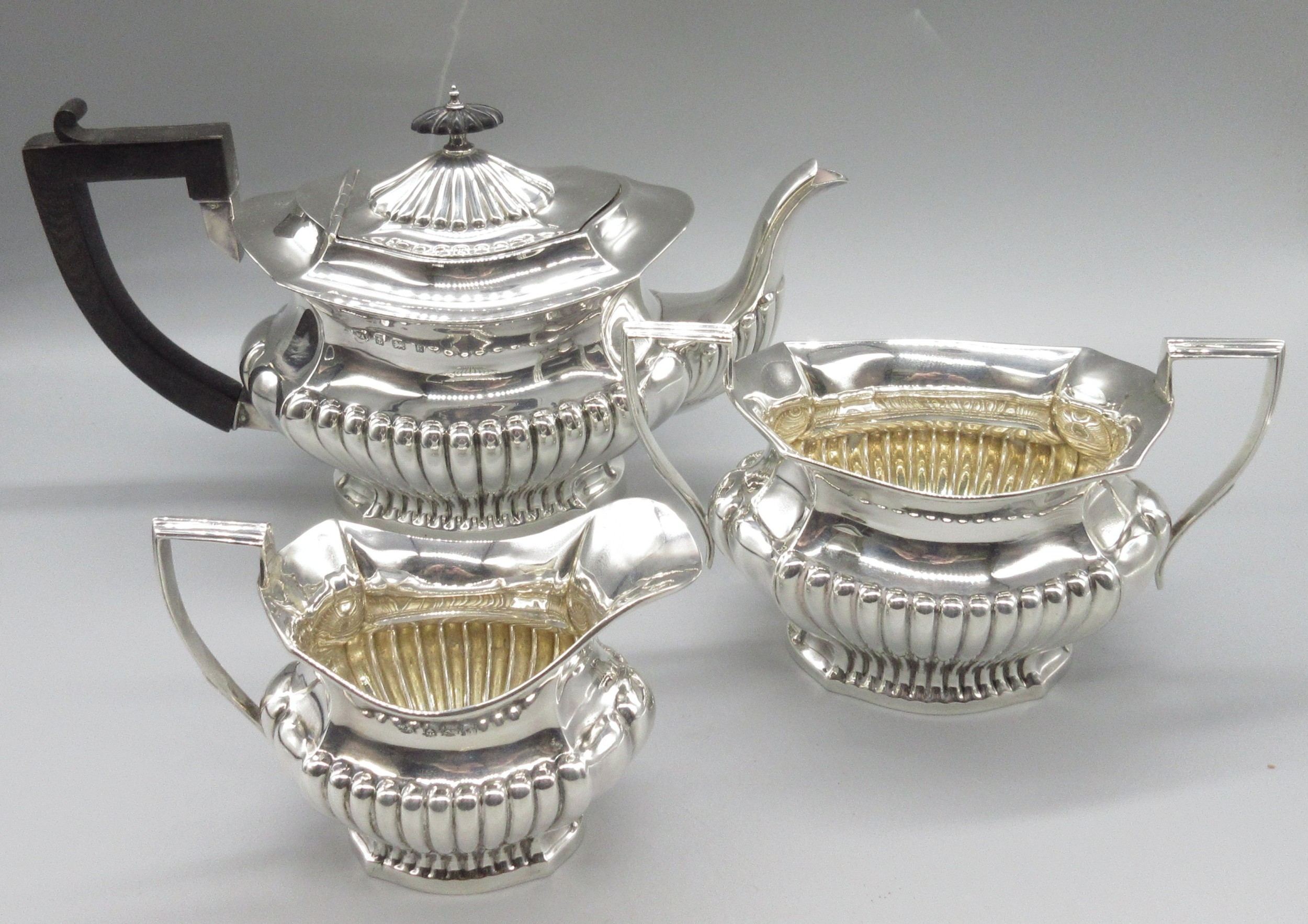 Edwardian silver three piece tea set to include teapot, twin handled sugar bowl and milk jug, all having partly lobed baluster bodies, by William Aitkin, Birmingham 1908, (teapot 1906), 36.1ozt