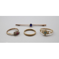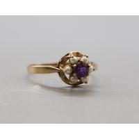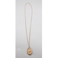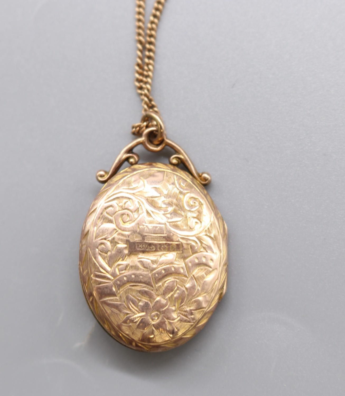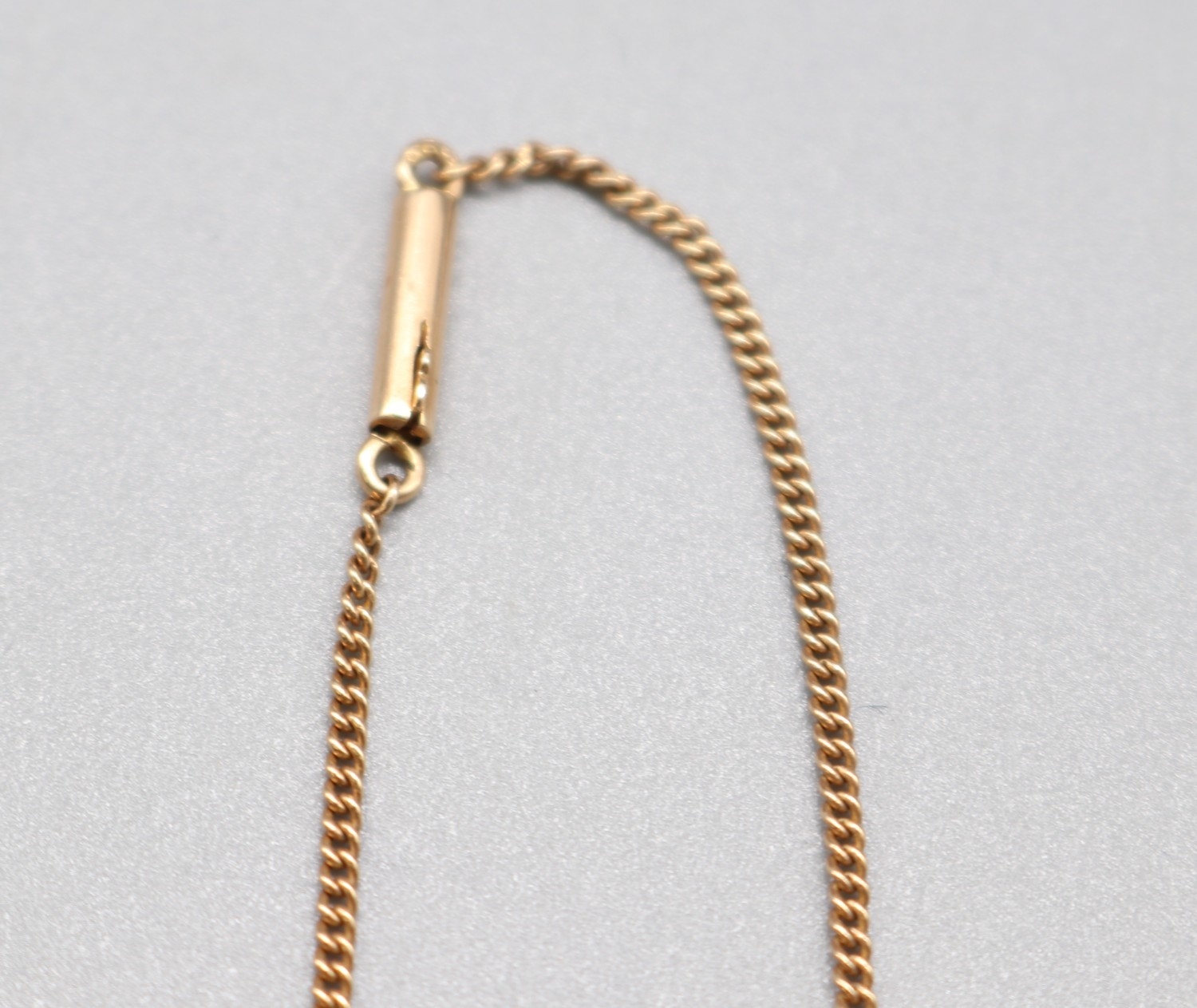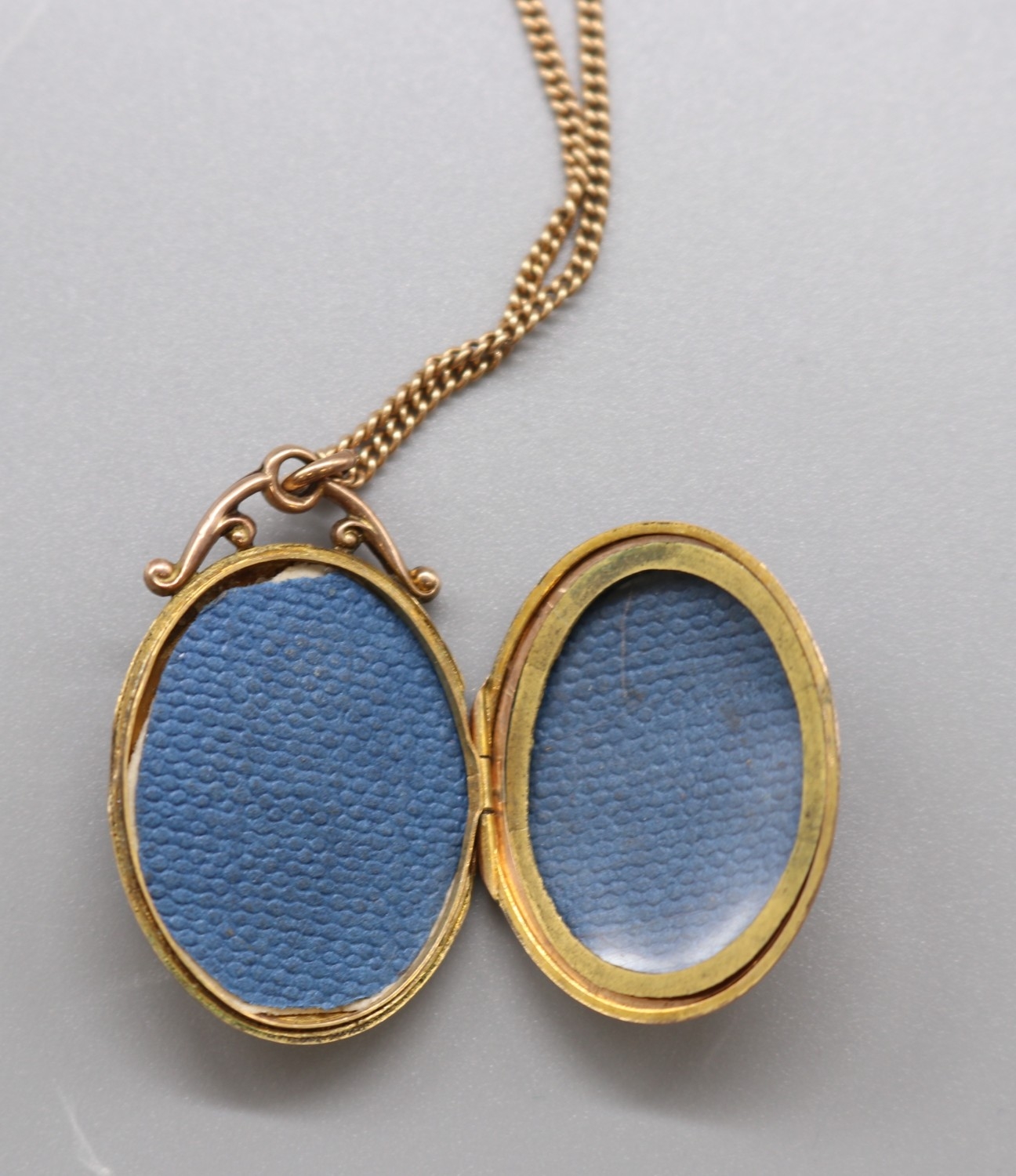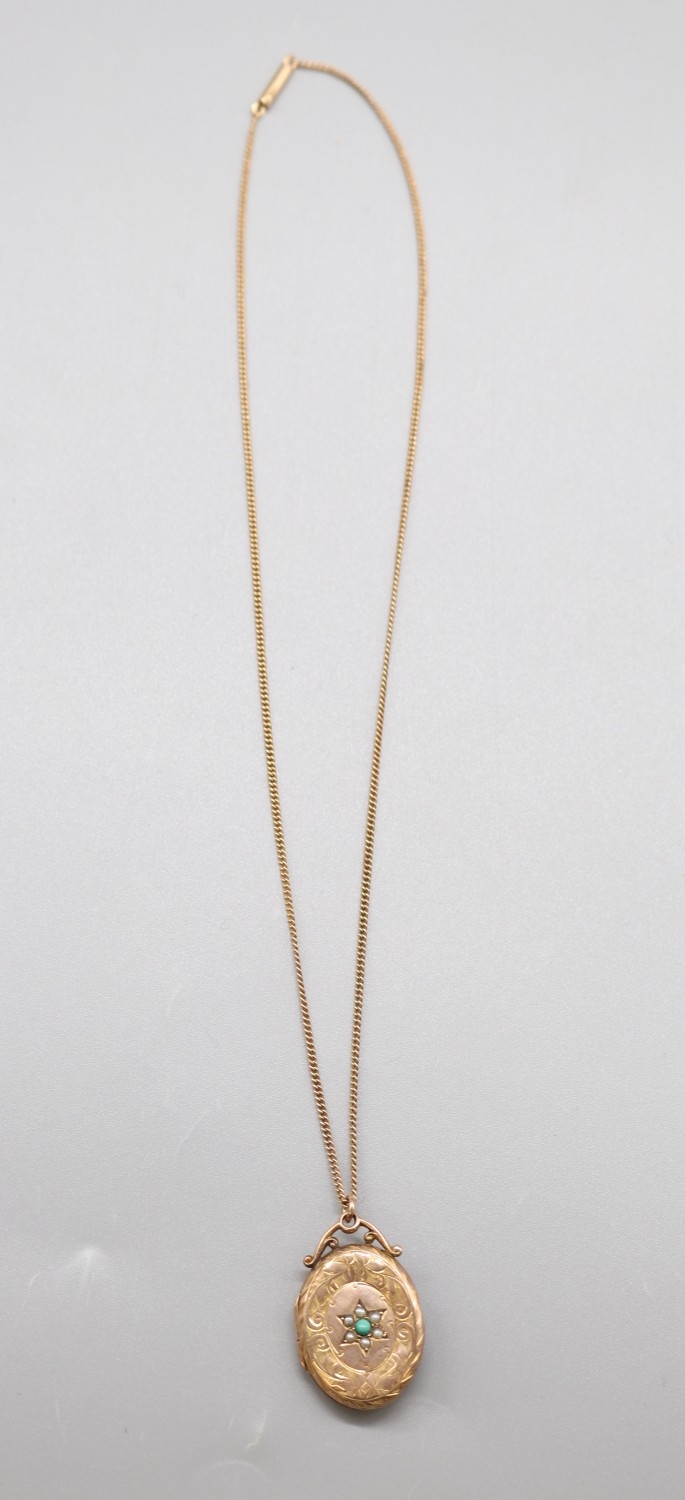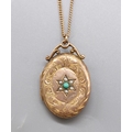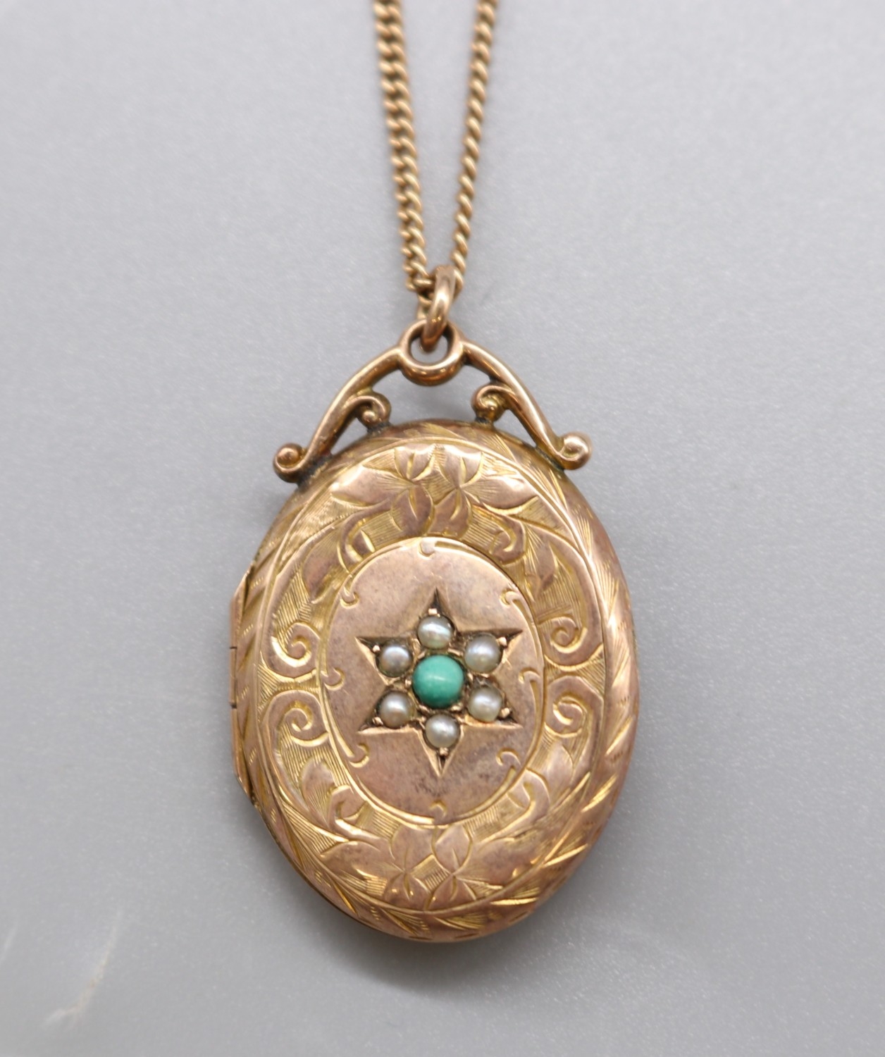 9ct hallmarked locket with turquoise and seed pearls star pattern, hallmarks worn, with a yellow metal chain, L42cm (6.7g)