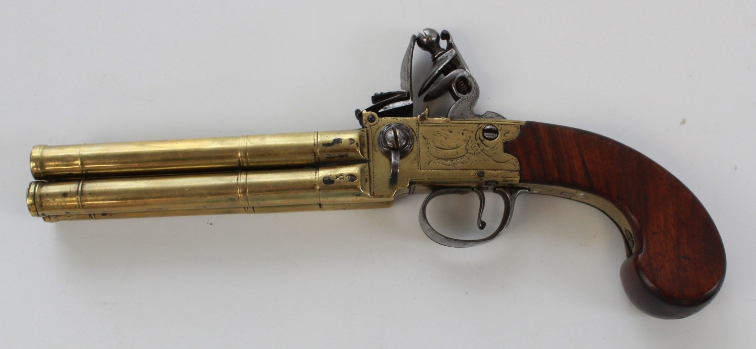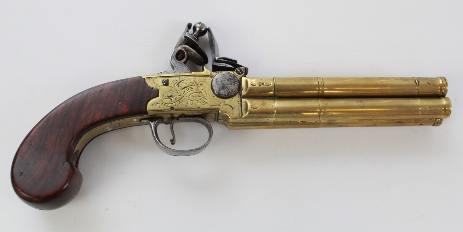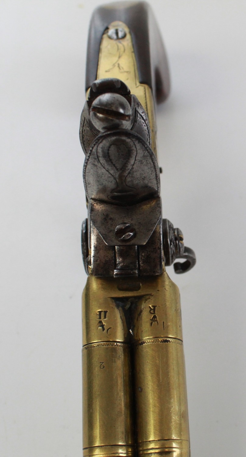 80 bore brass four barrelled flintlock tap-action pistol by Rea of London, 5" turn-off cannon barrels with rifled muzzles, London IR proof marks, engraved makers name to the brass lock, silver hallmarked cartouche, 28.5cm overall