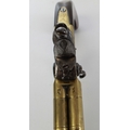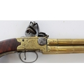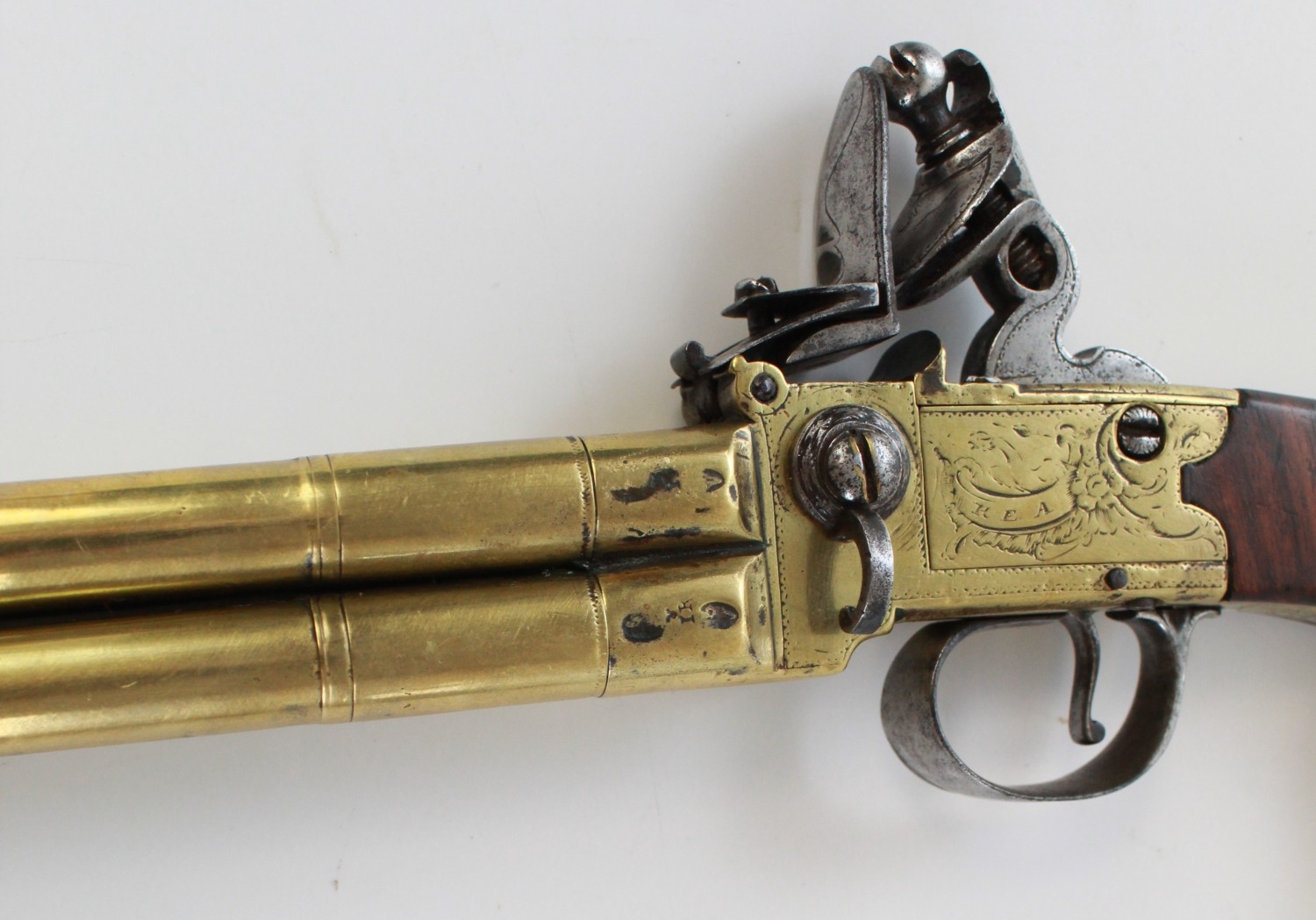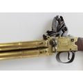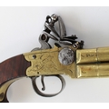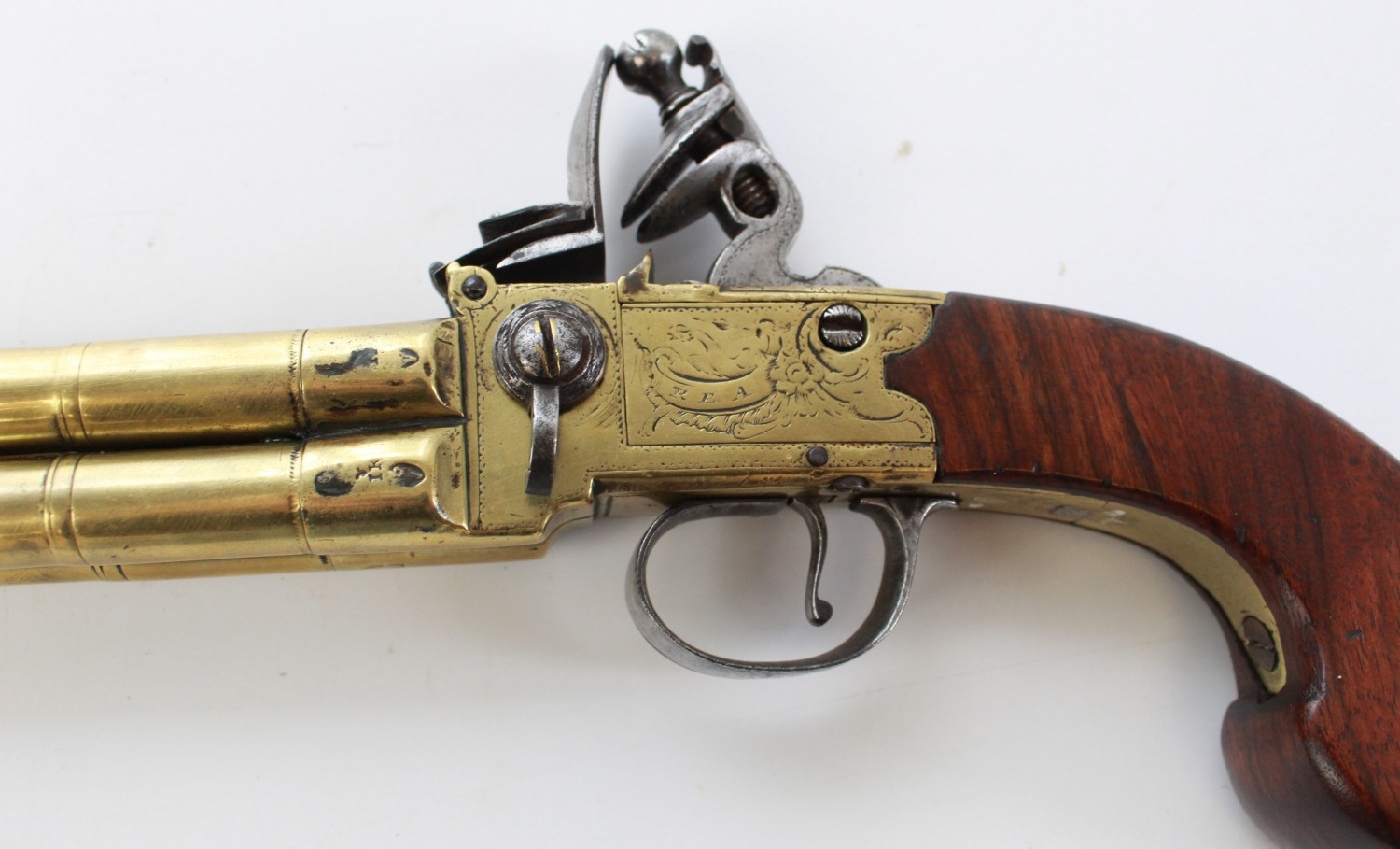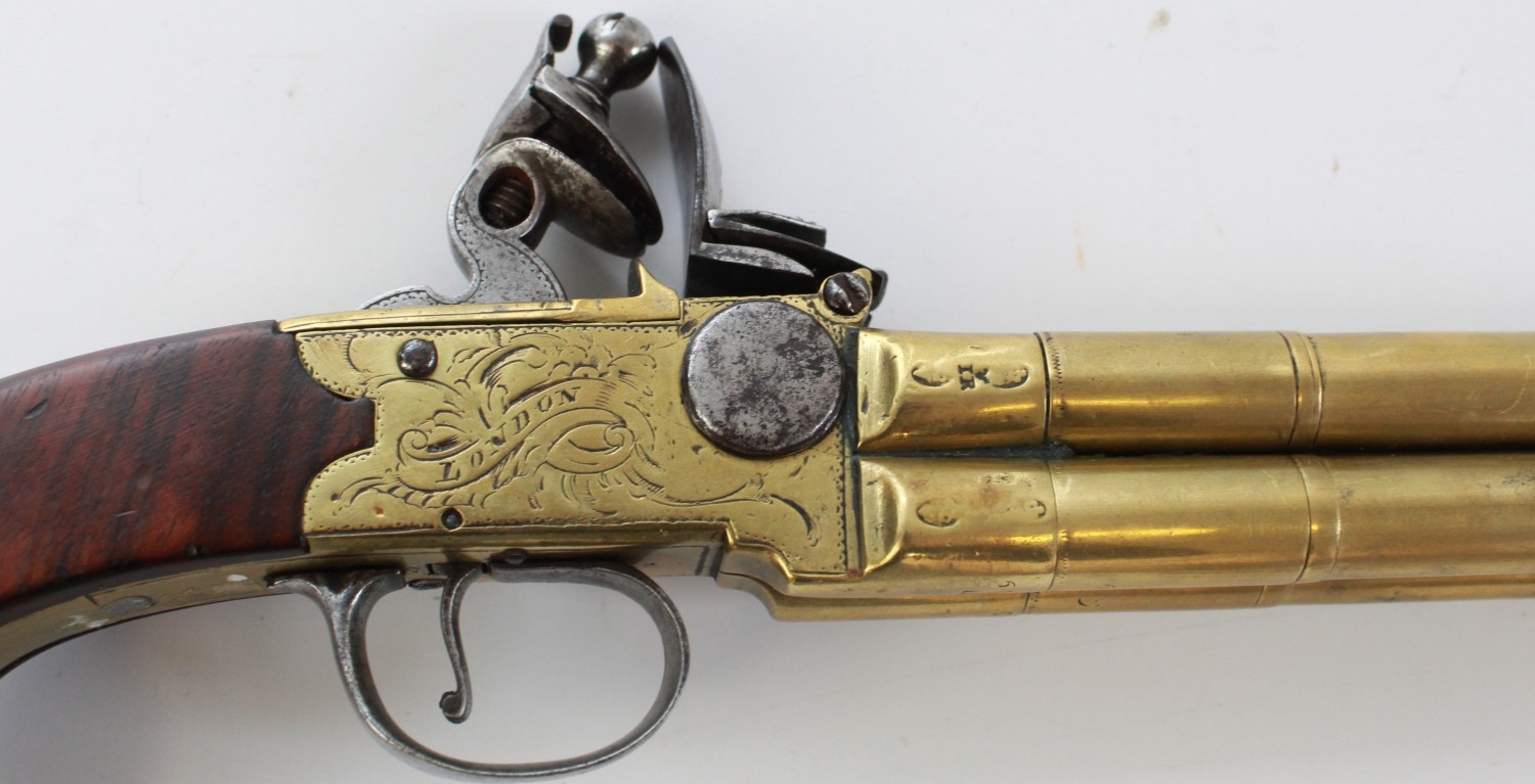 80 bore brass four barrelled flintlock tap-action pistol by Rea of London, 5" turn-off cannon barrels with rifled muzzles, London IR proof marks, engraved makers name to the brass lock, silver hallmarked cartouche, 28.5cm overall