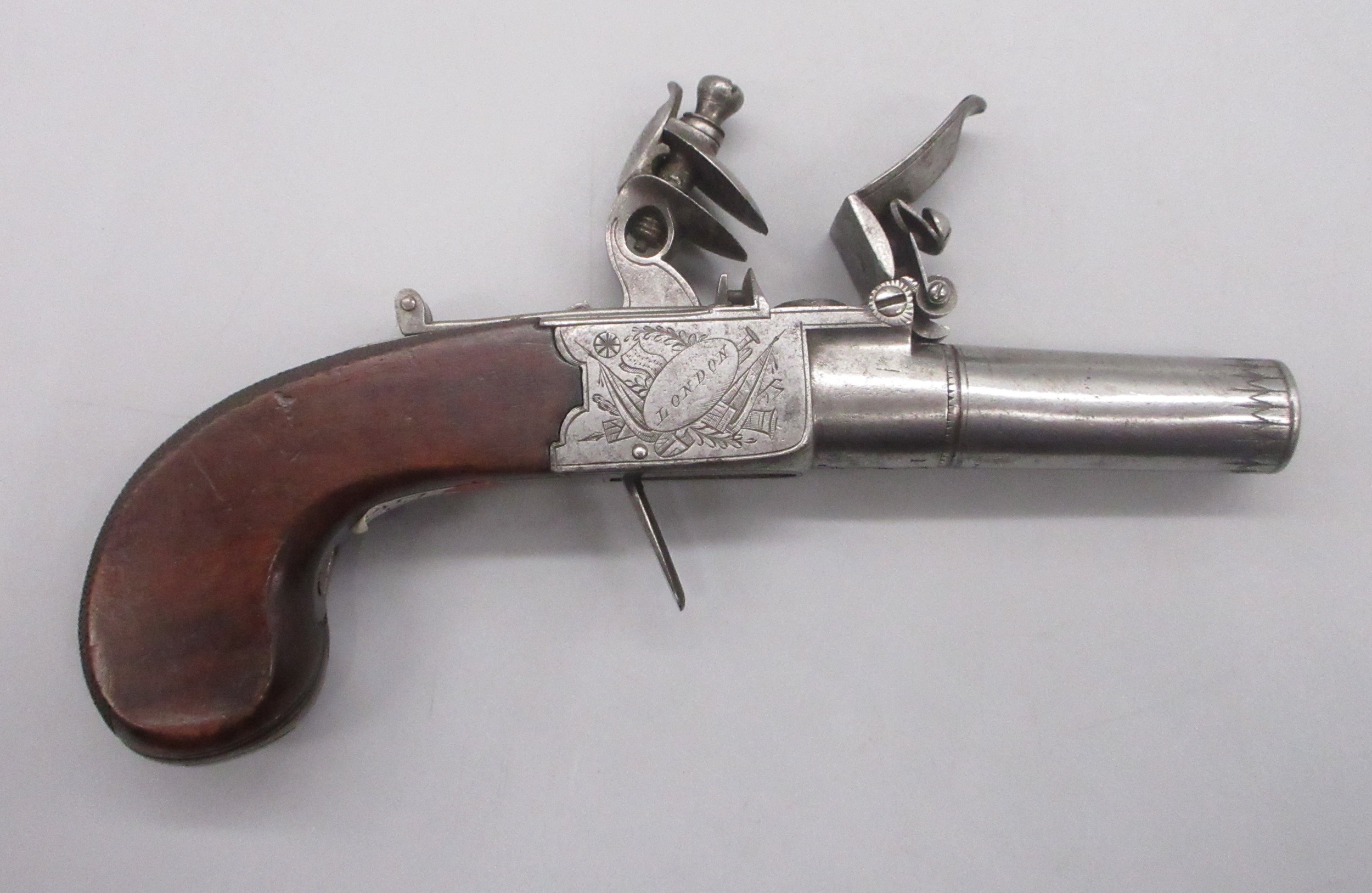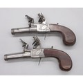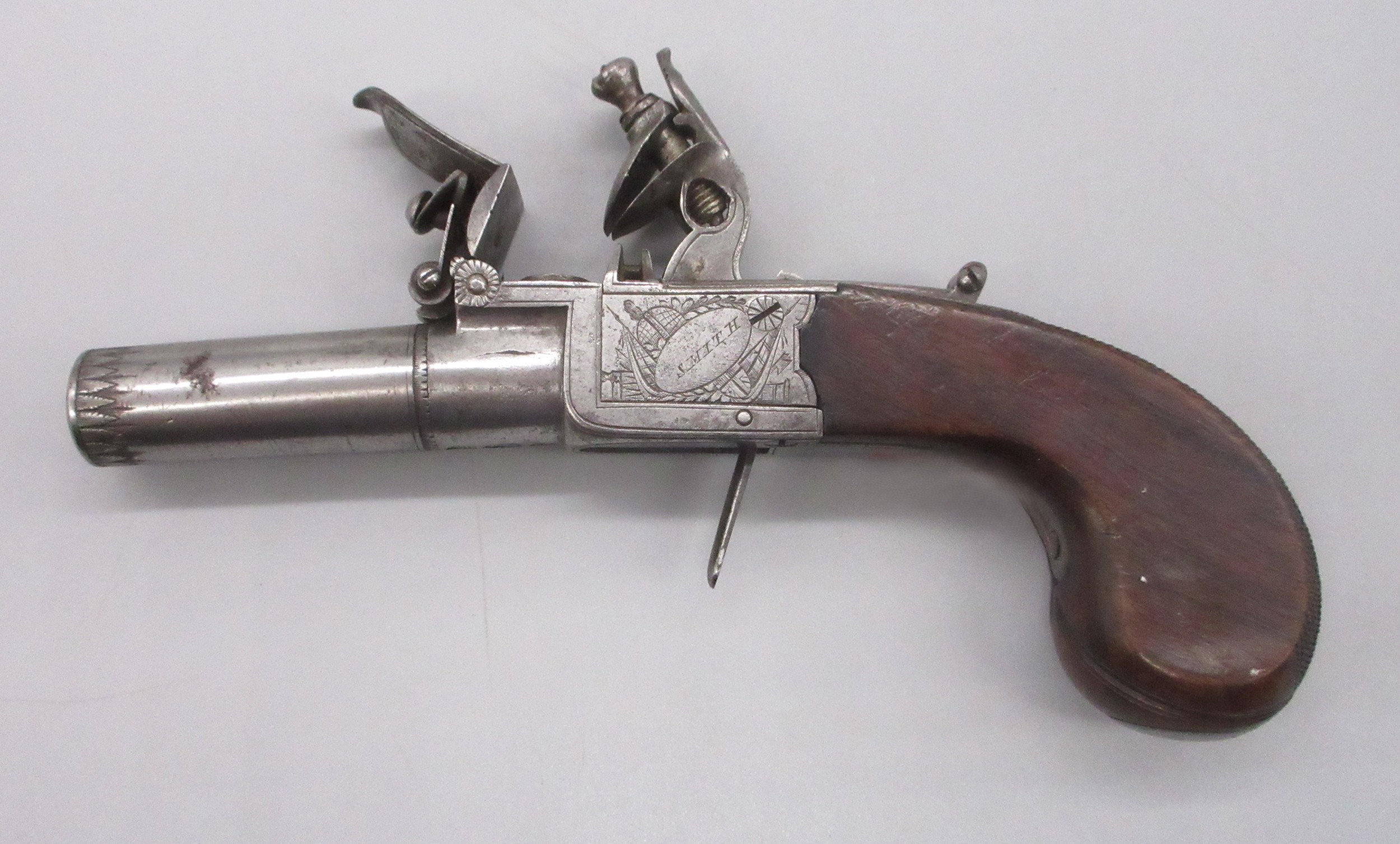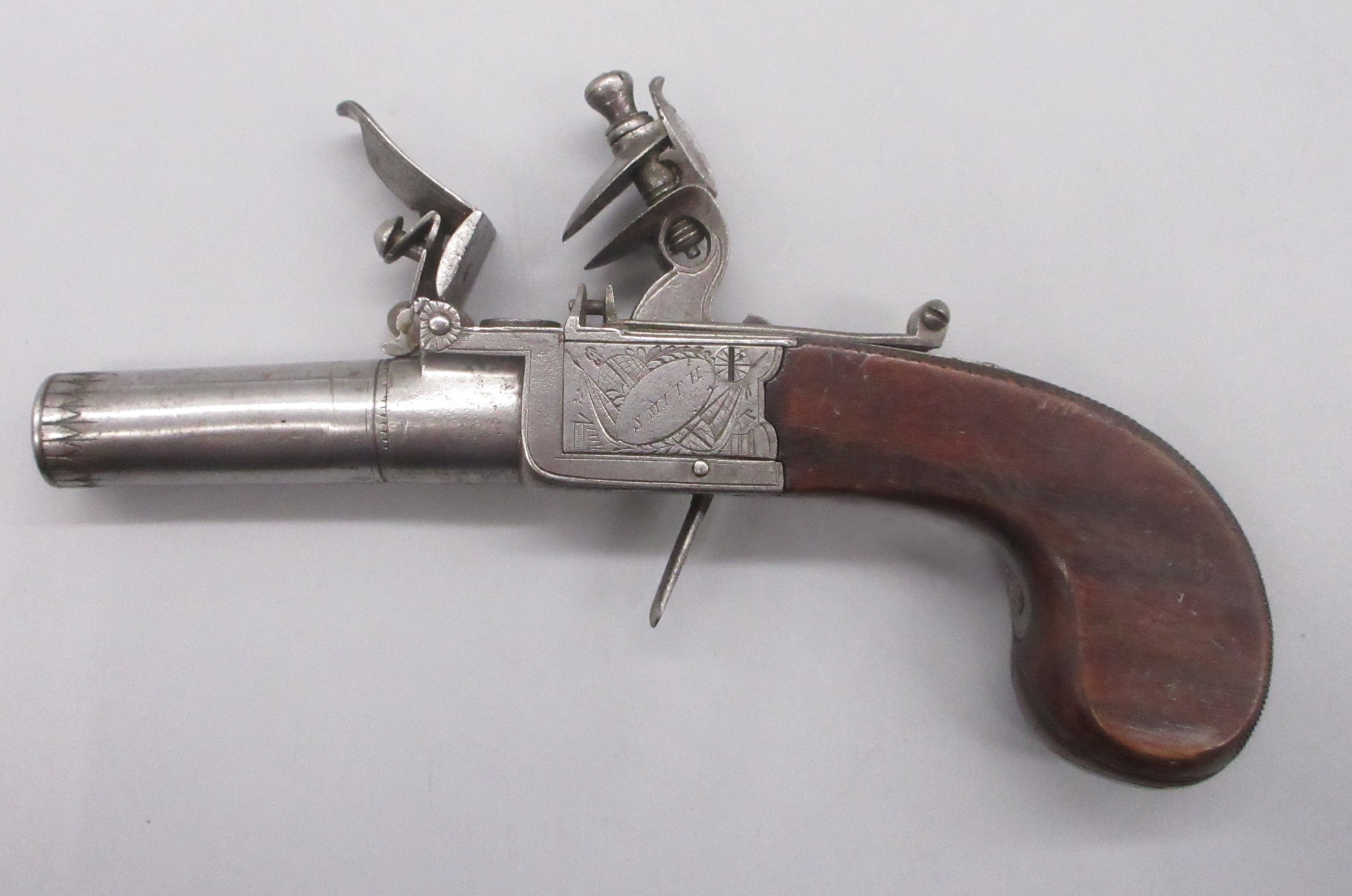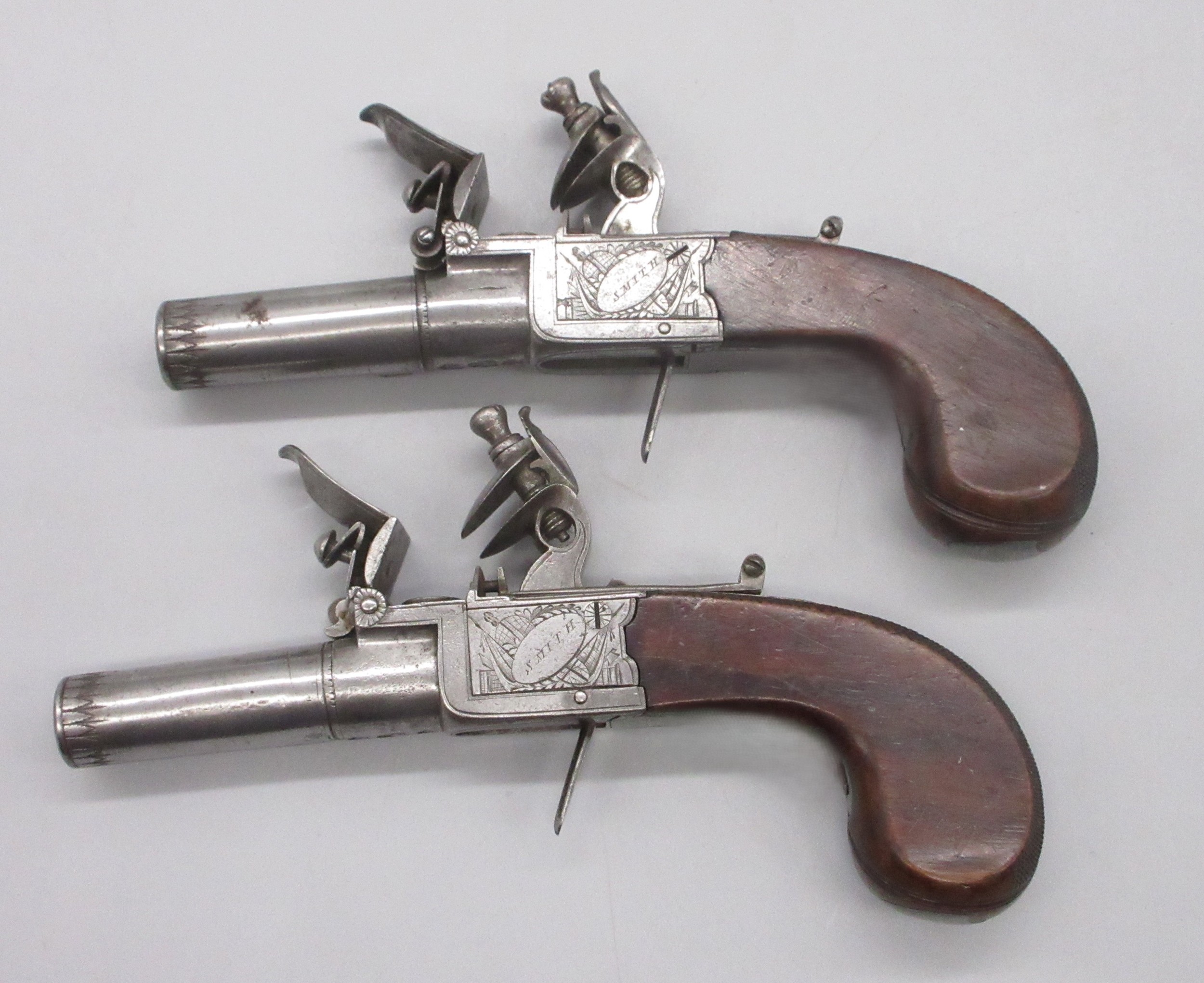 Pair of 50 bore flintlock pocket pistol by 'Smith, London', 1.75" turn-off barrels with engraved detail, stamped proof marks, folding trigger, top slide safety, engraved and named locks, shield shaped cartouches to the butts and chequered grip backs, 16cm overall