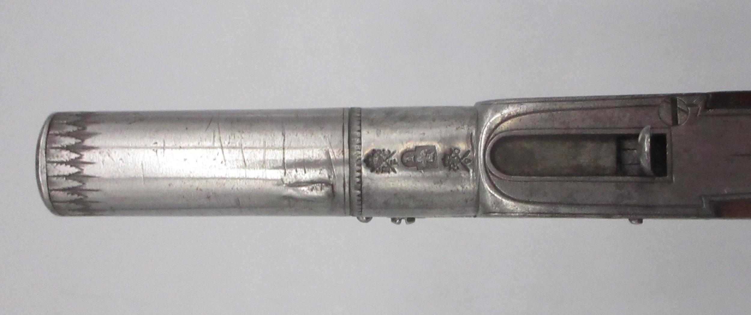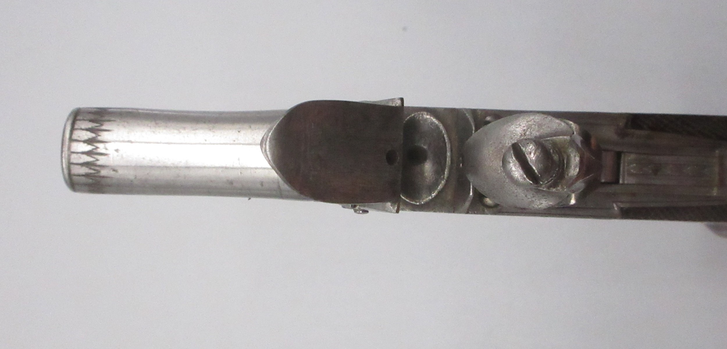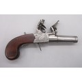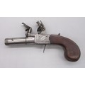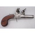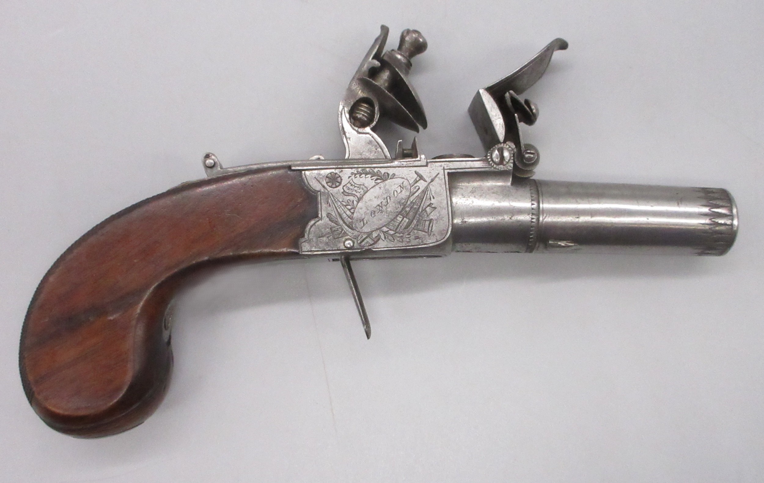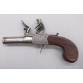 Pair of 50 bore flintlock pocket pistol by 'Smith, London', 1.75" turn-off barrels with engraved detail, stamped proof marks, folding trigger, top slide safety, engraved and named locks, shield shaped cartouches to the butts and chequered grip backs, 16cm overall