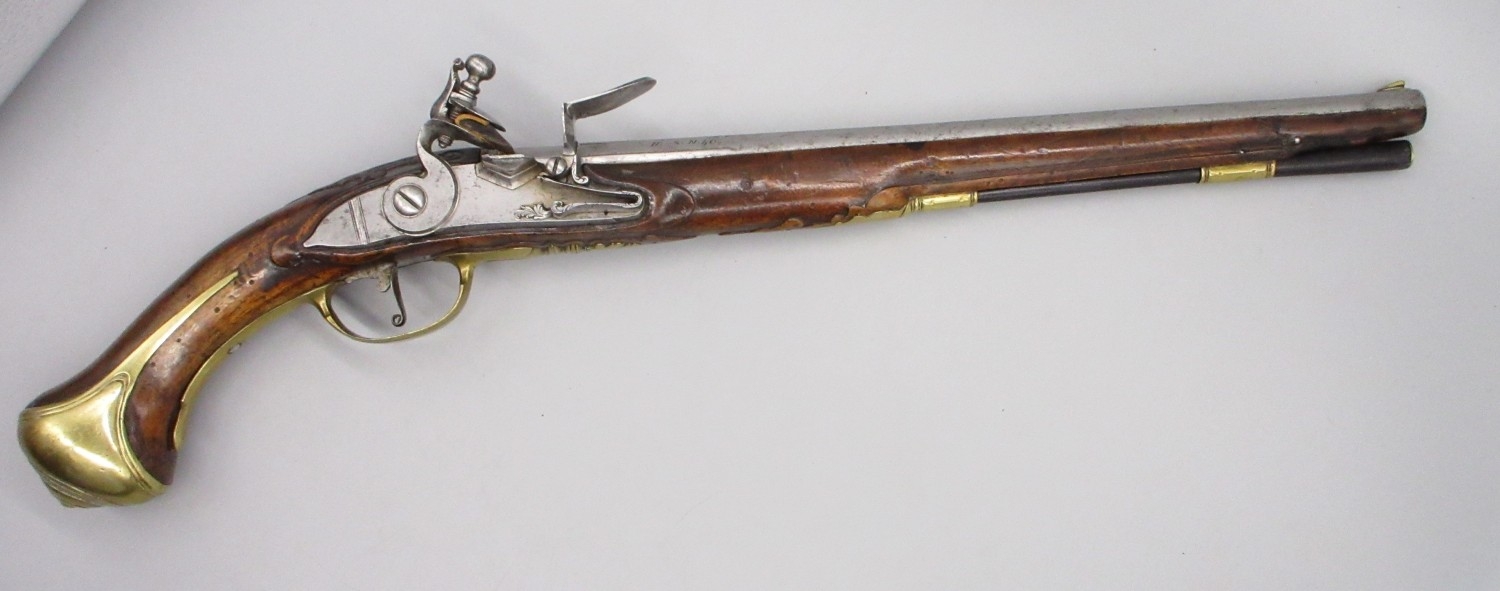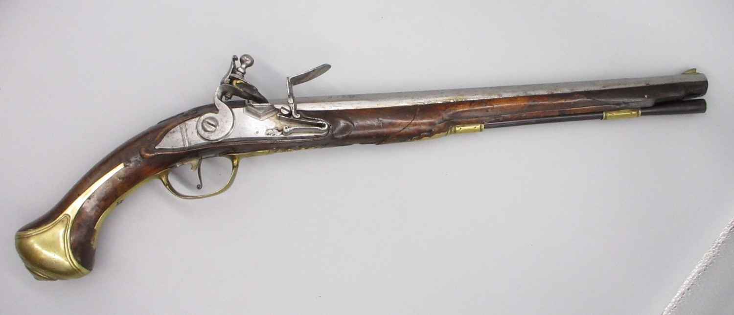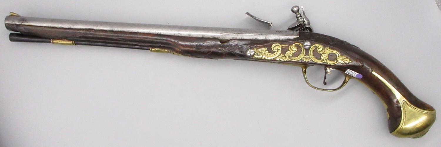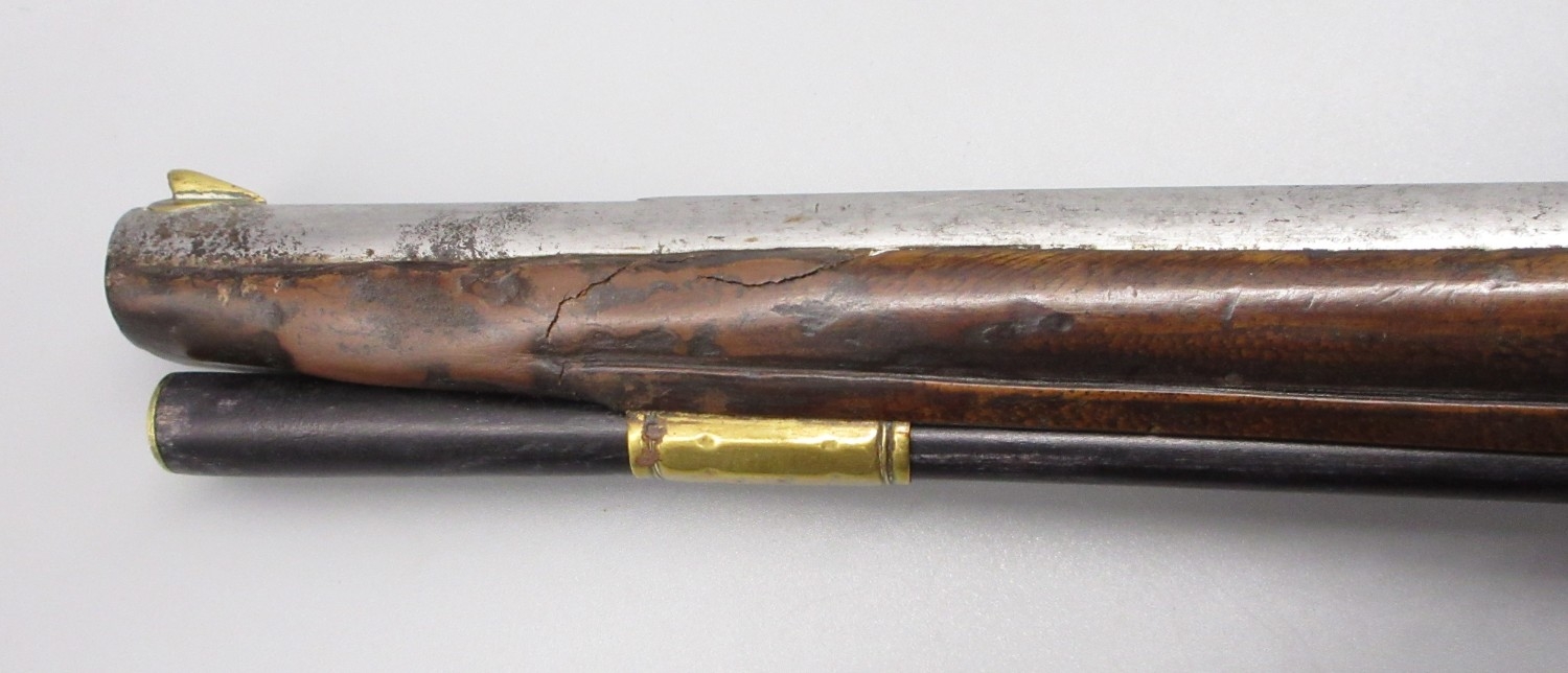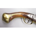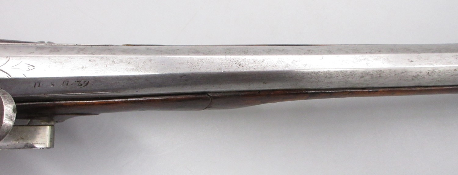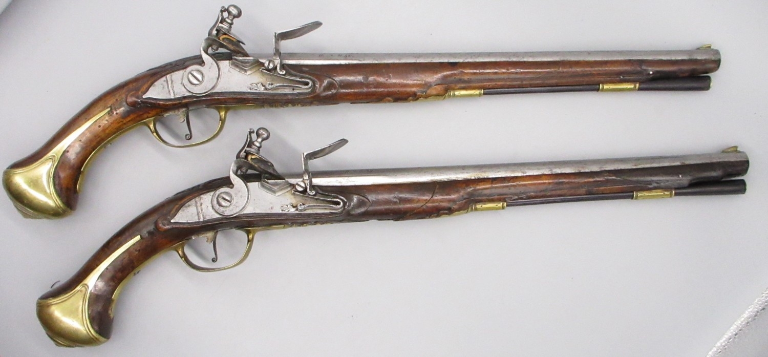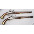 Pair of long barreled 22 bore flintlock pistols, 14" barrels with fixed fore sights, engraved `H.S.N 39 and 40' stamped `Cartie', brass mounts and un-named locks, complete with ramrods, 56cm overall (stock cracked on one)