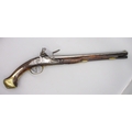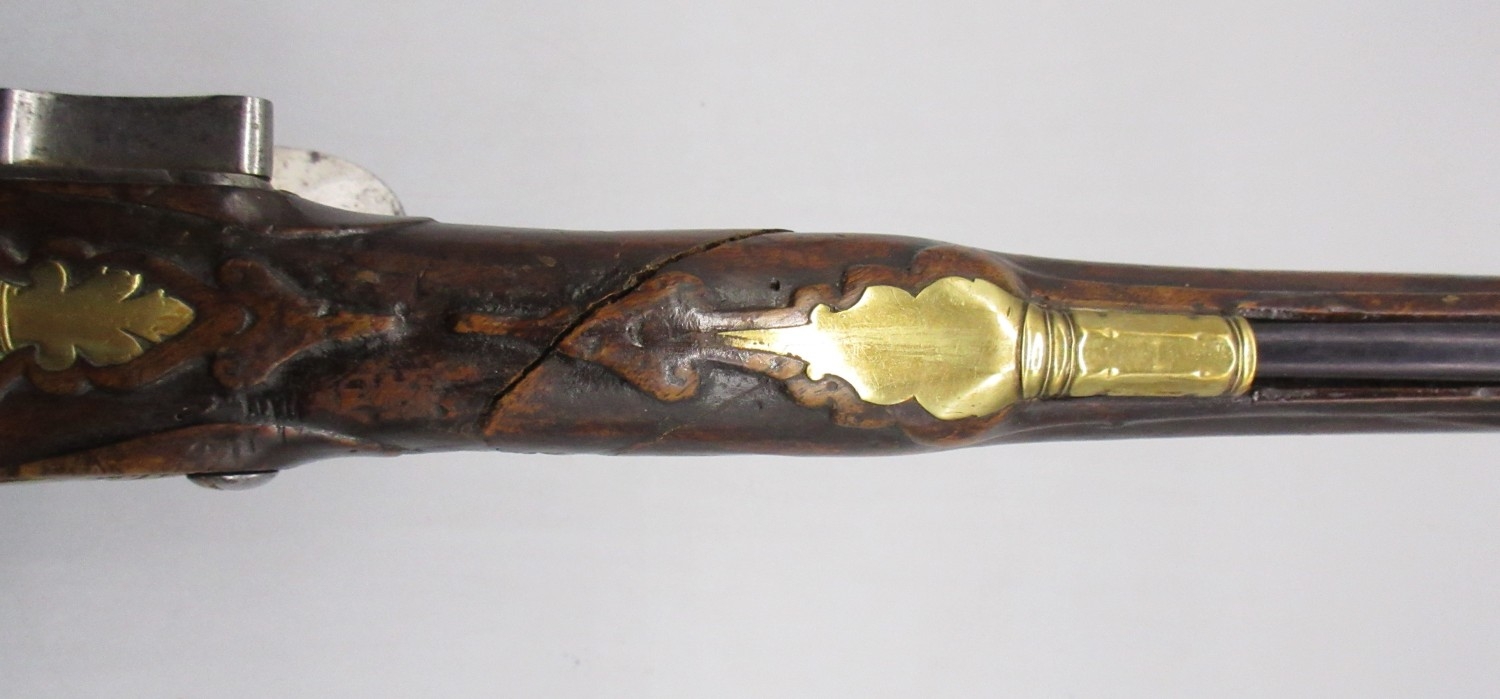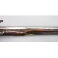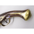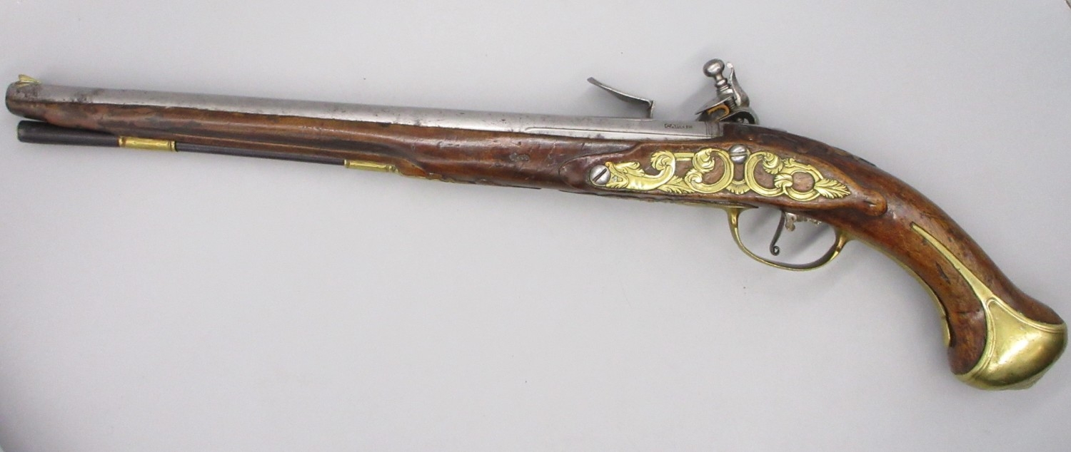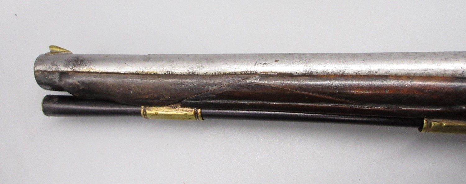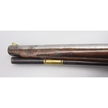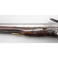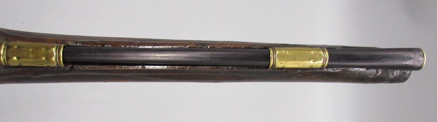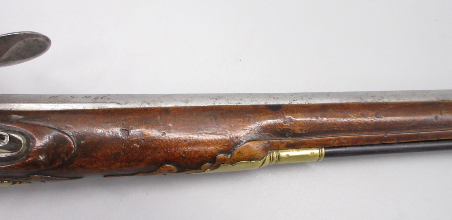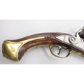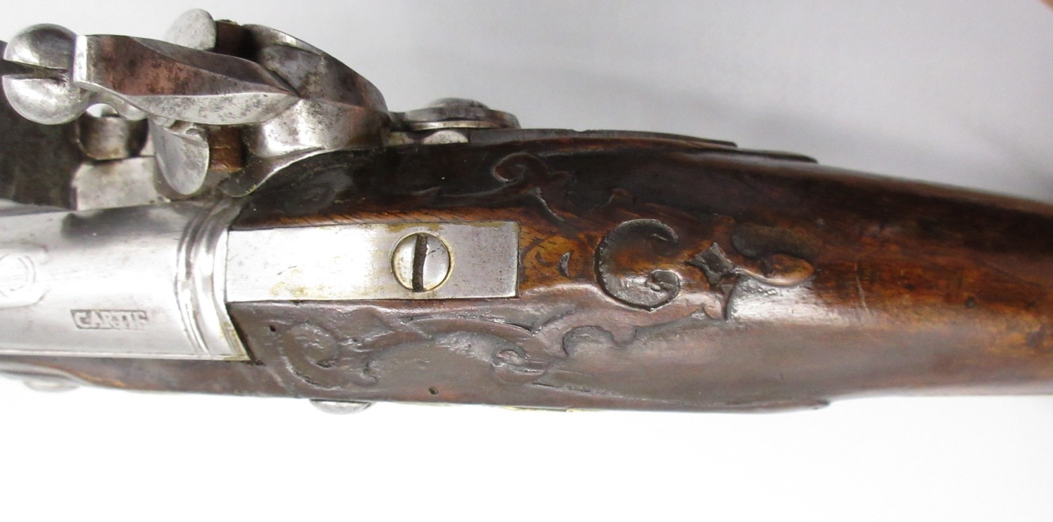 Pair of long barreled 22 bore flintlock pistols, 14" barrels with fixed fore sights, engraved `H.S.N 39 and 40' stamped `Cartie', brass mounts and un-named locks, complete with ramrods, 56cm overall (stock cracked on one)