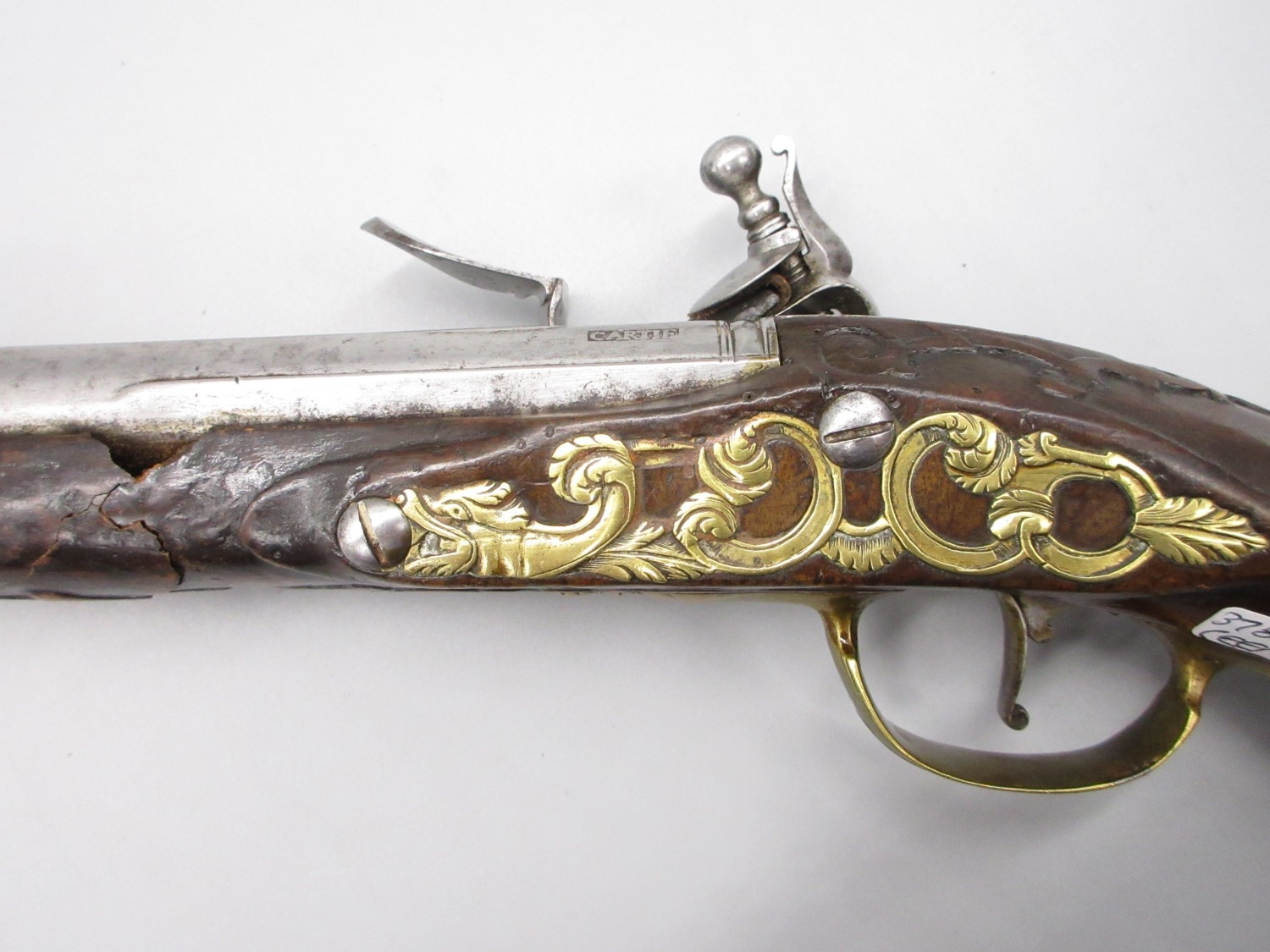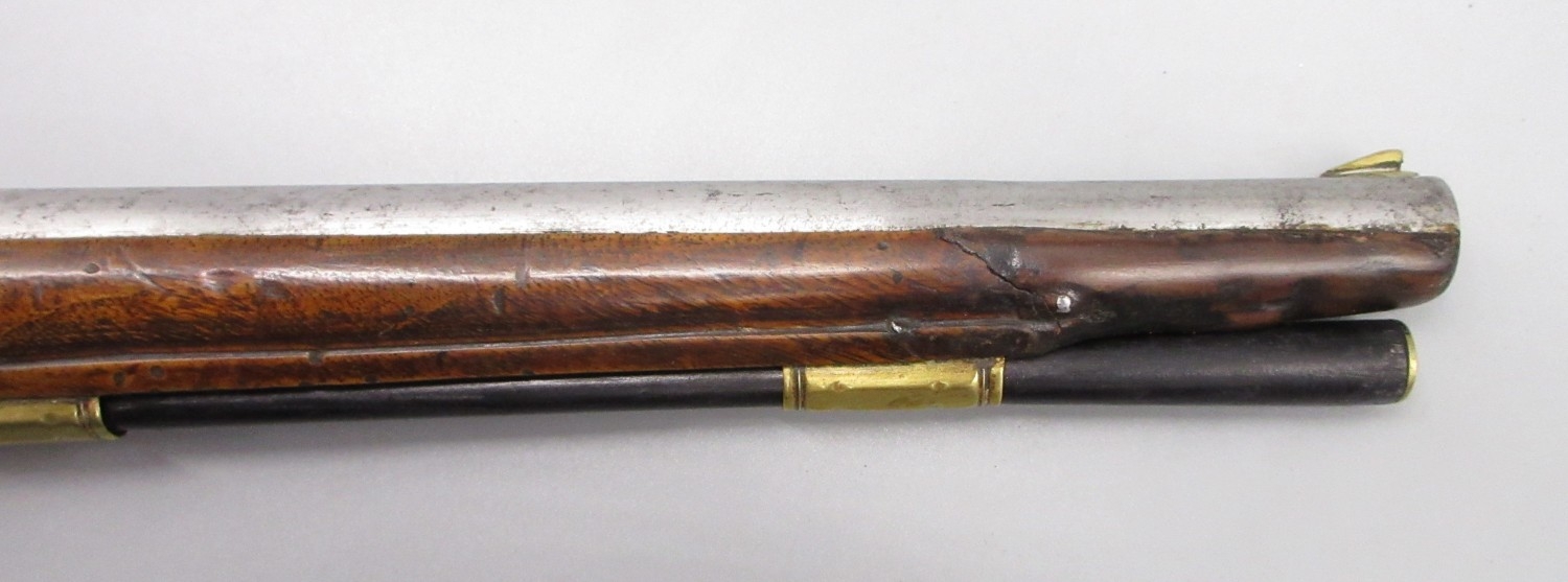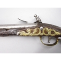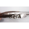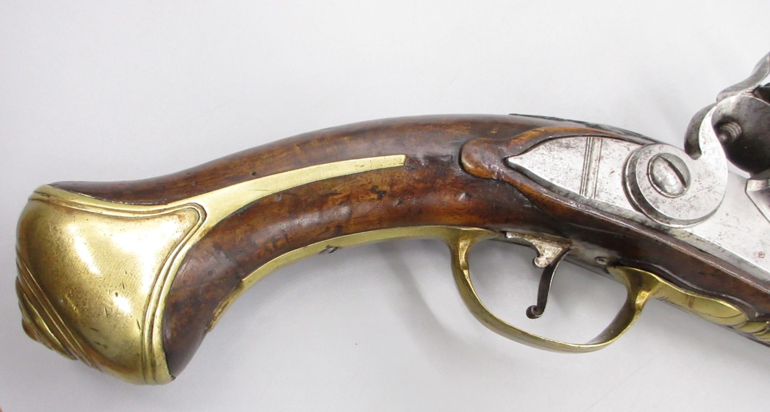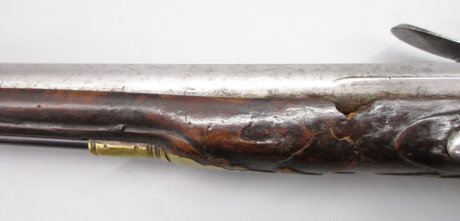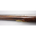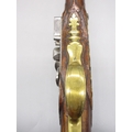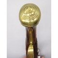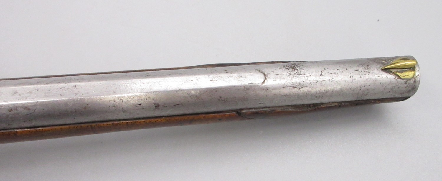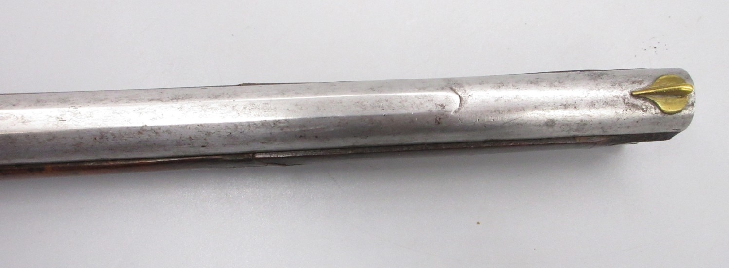 Pair of long barreled 22 bore flintlock pistols, 14" barrels with fixed fore sights, engraved `H.S.N 39 and 40' stamped `Cartie', brass mounts and un-named locks, complete with ramrods, 56cm overall (stock cracked on one)