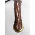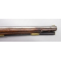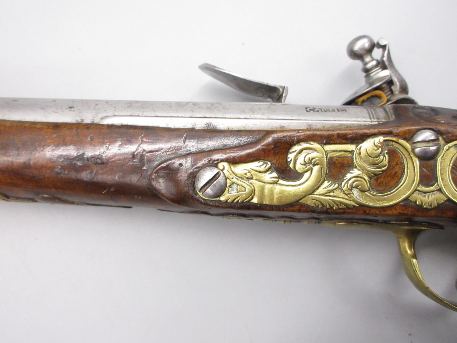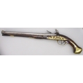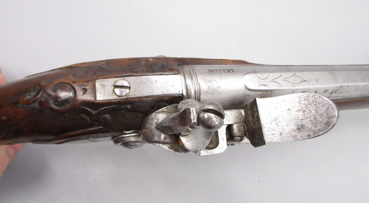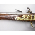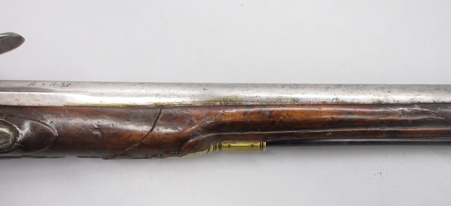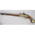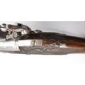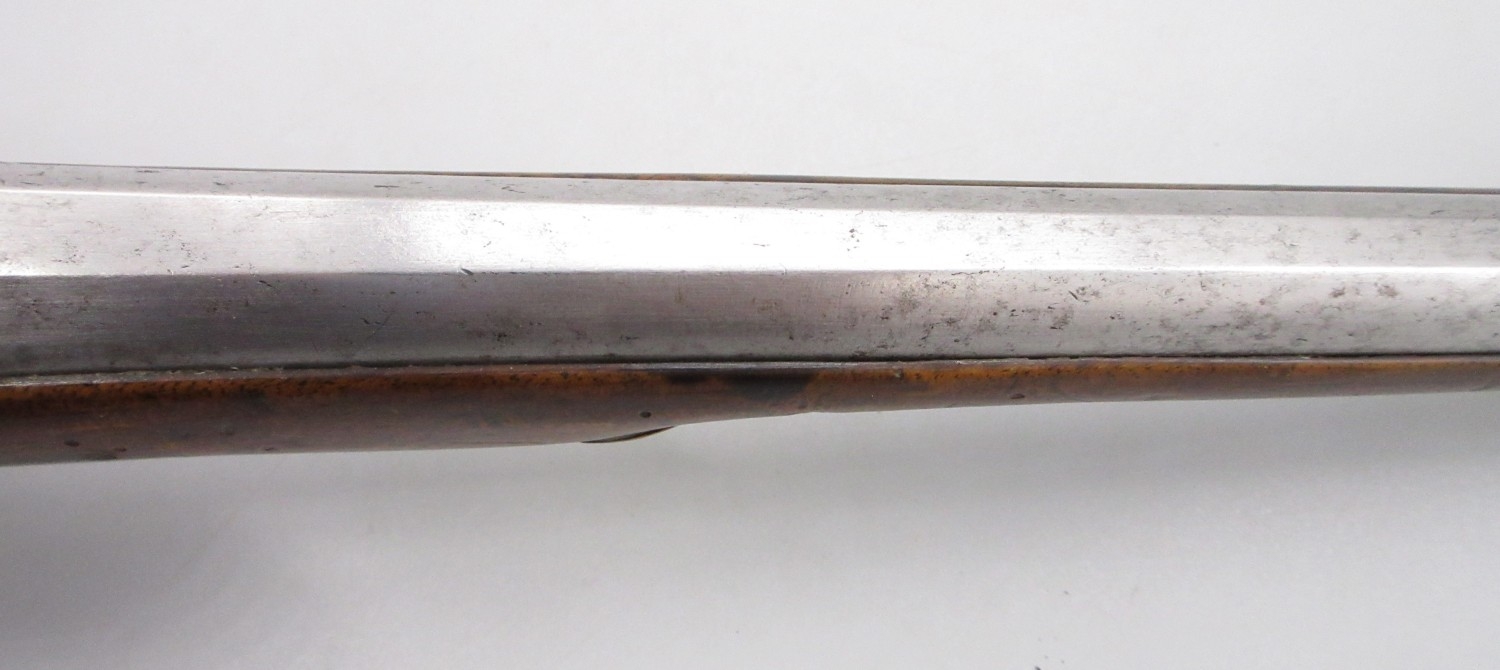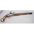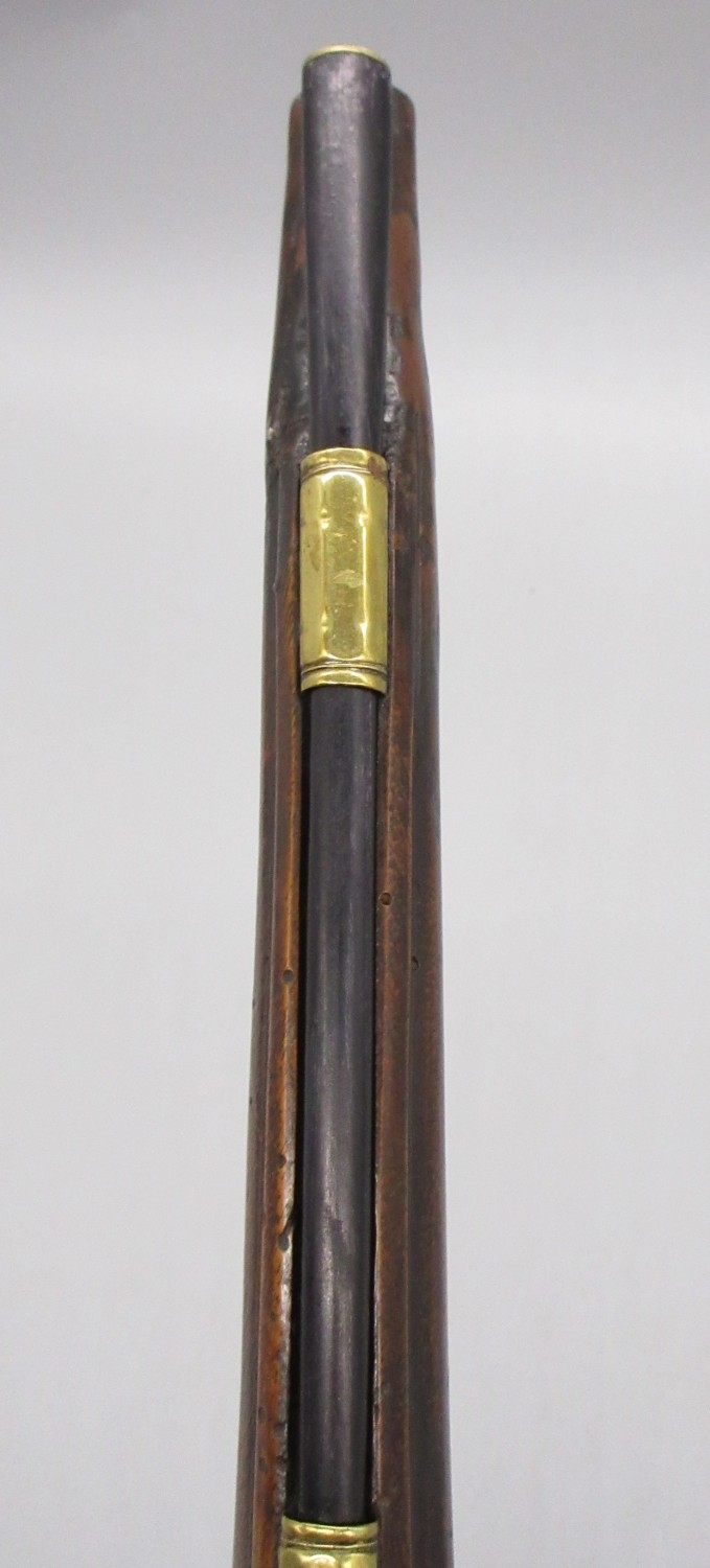 Pair of long barreled 22 bore flintlock pistols, 14" barrels with fixed fore sights, engraved `H.S.N 39 and 40' stamped `Cartie', brass mounts and un-named locks, complete with ramrods, 56cm overall (stock cracked on one)