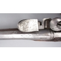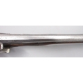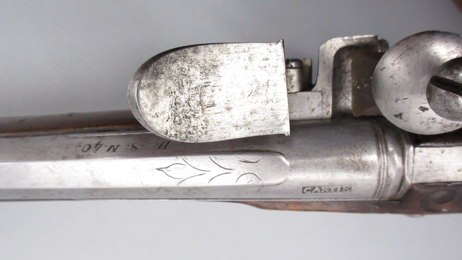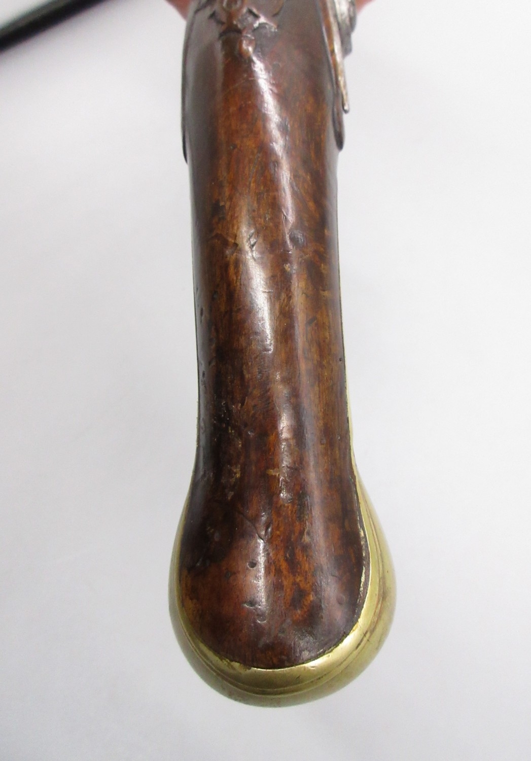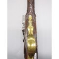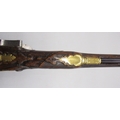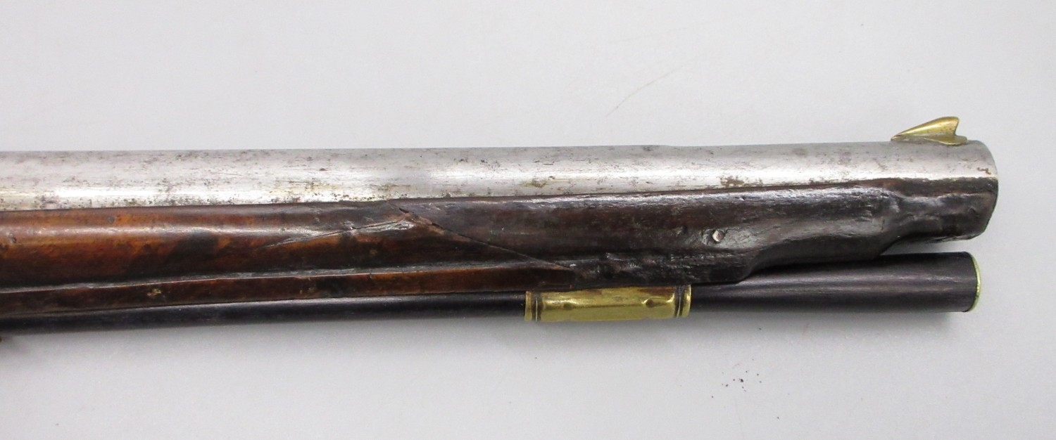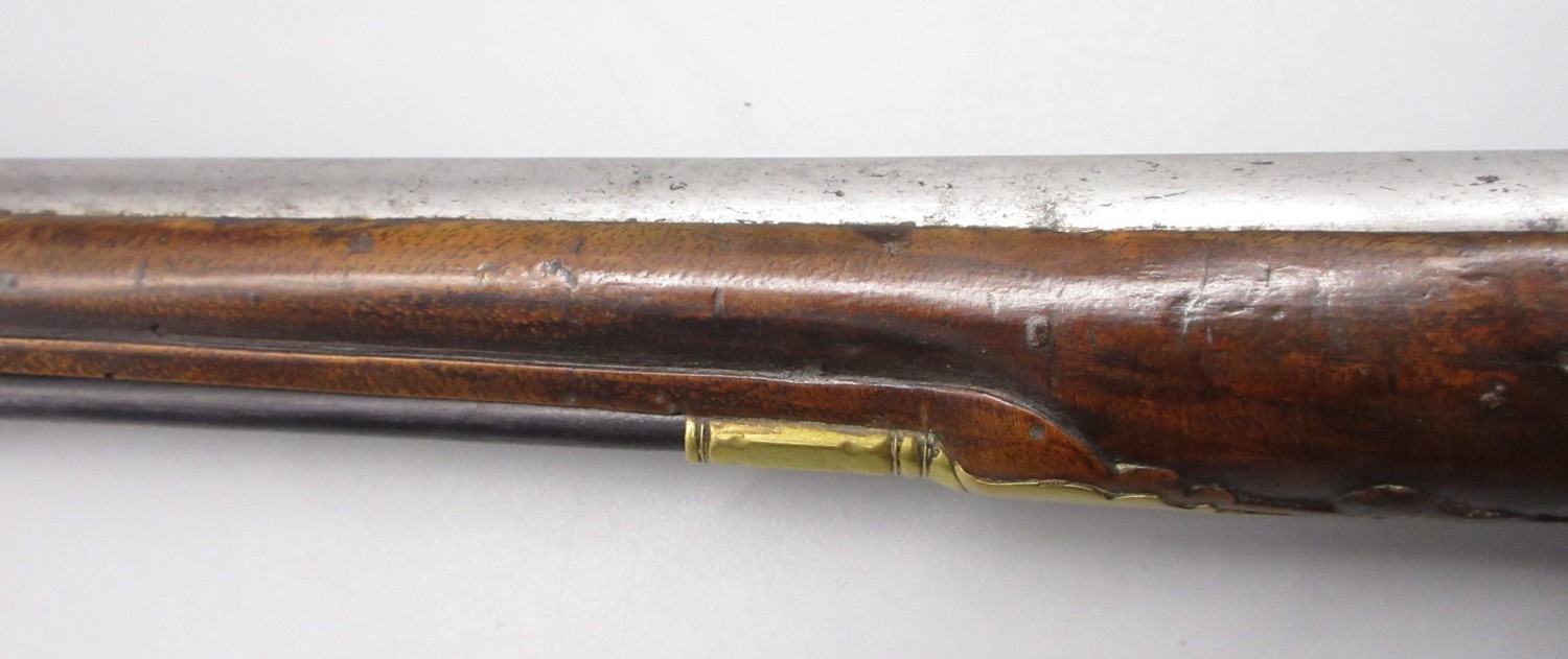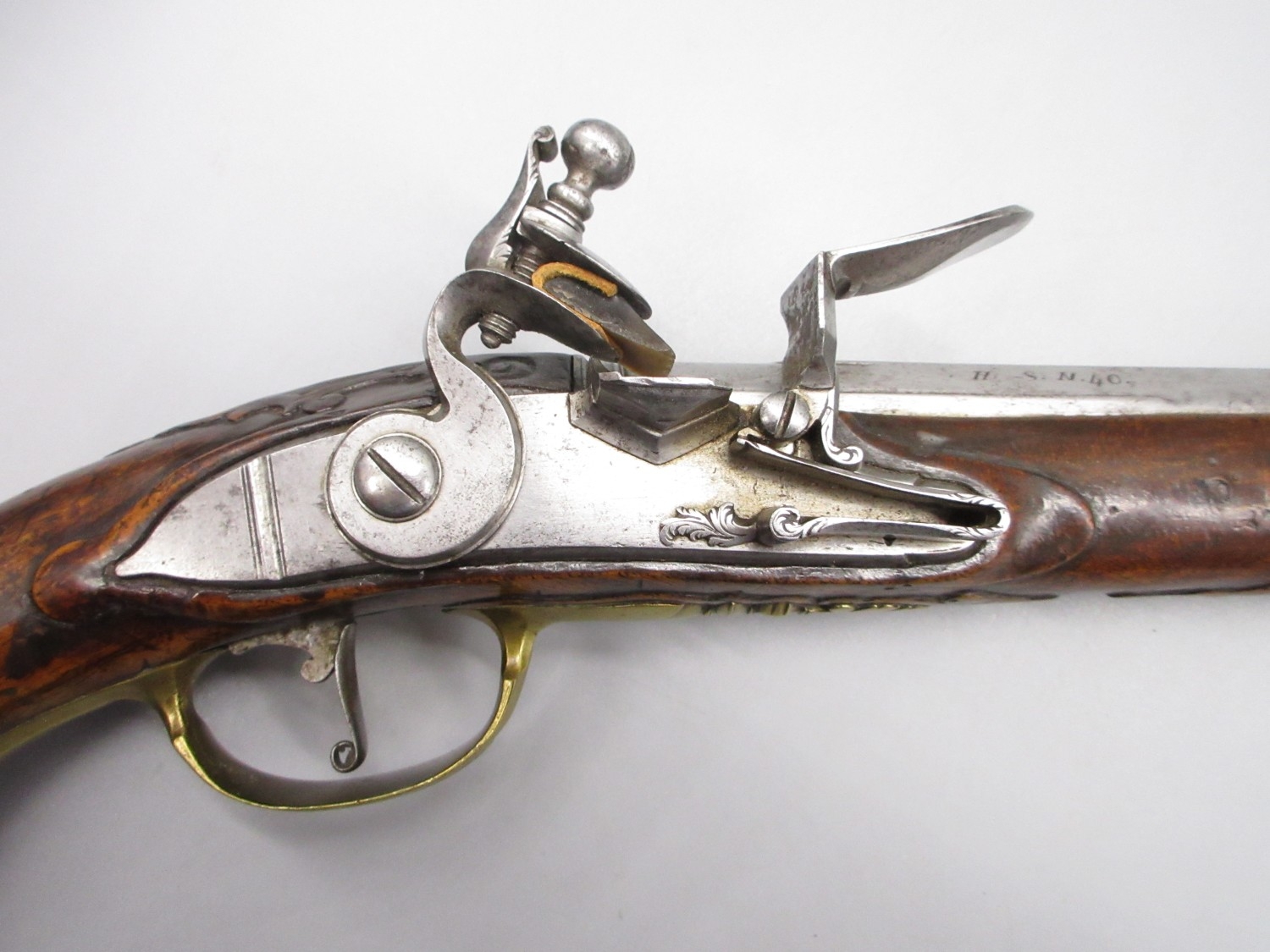 Pair of long barreled 22 bore flintlock pistols, 14" barrels with fixed fore sights, engraved `H.S.N 39 and 40' stamped `Cartie', brass mounts and un-named locks, complete with ramrods, 56cm overall (stock cracked on one)