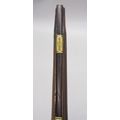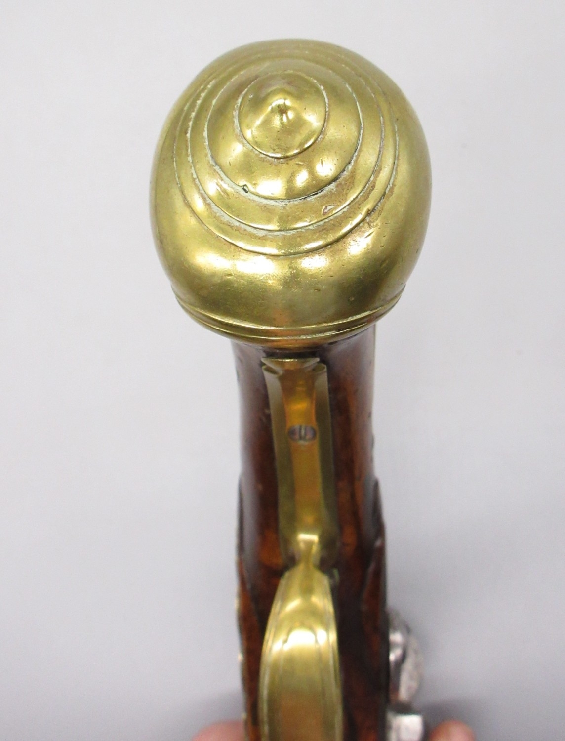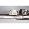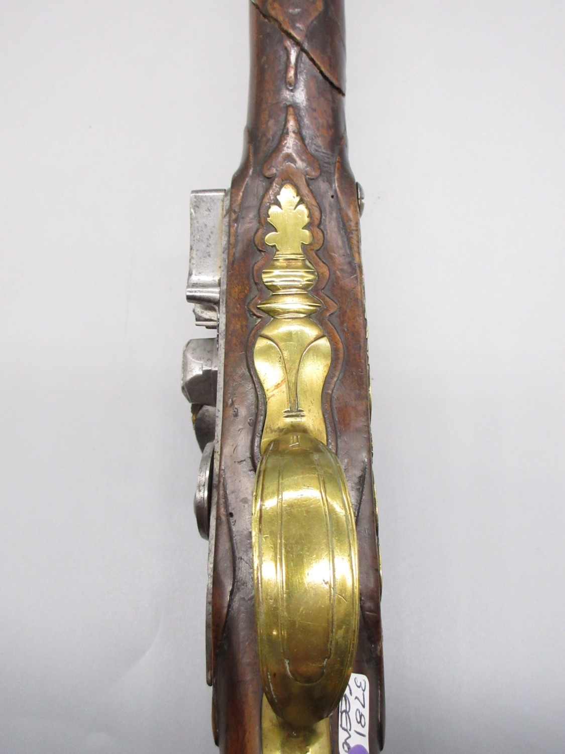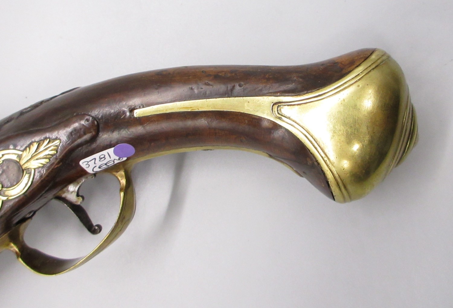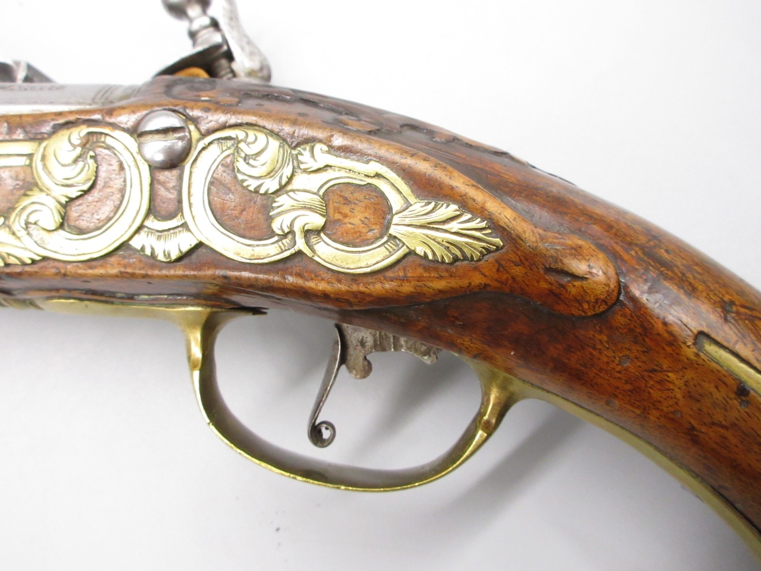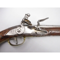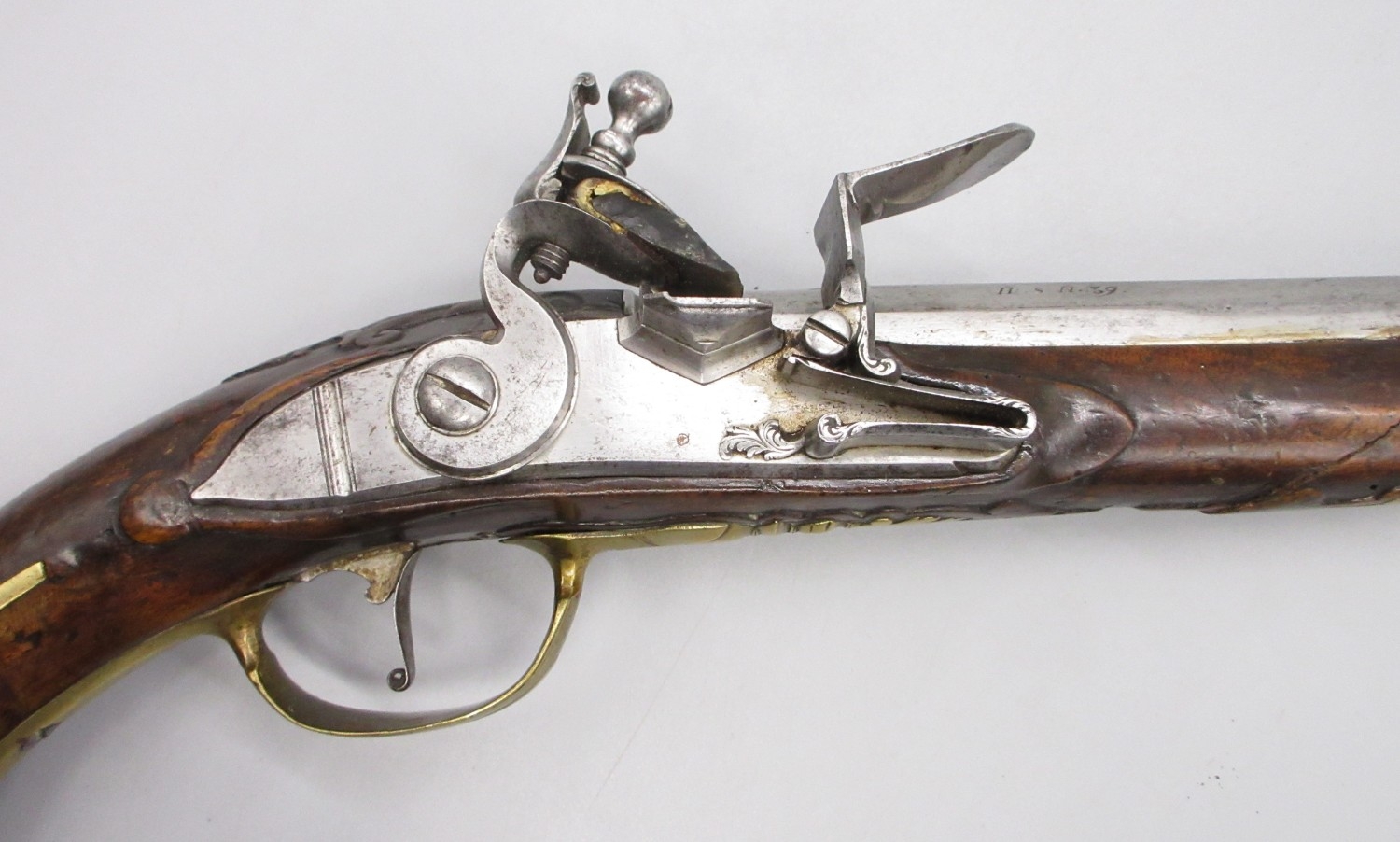 Pair of long barreled 22 bore flintlock pistols, 14" barrels with fixed fore sights, engraved `H.S.N 39 and 40' stamped `Cartie', brass mounts and un-named locks, complete with ramrods, 56cm overall (stock cracked on one)