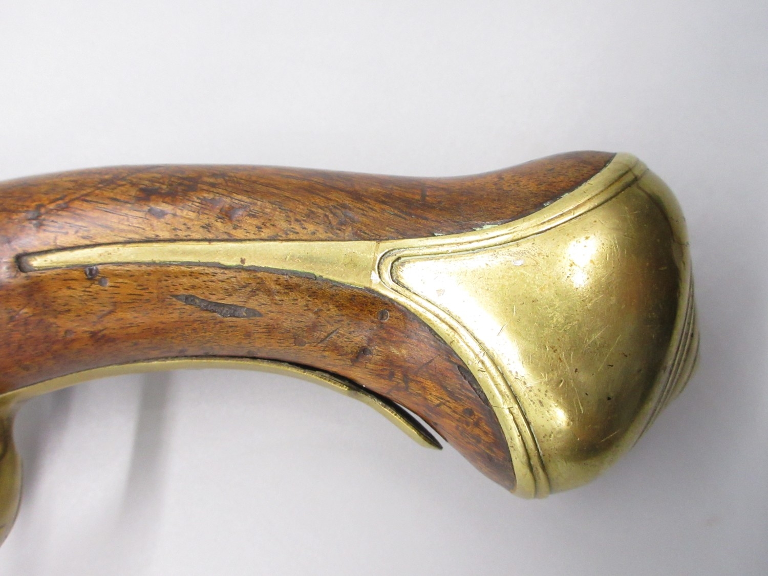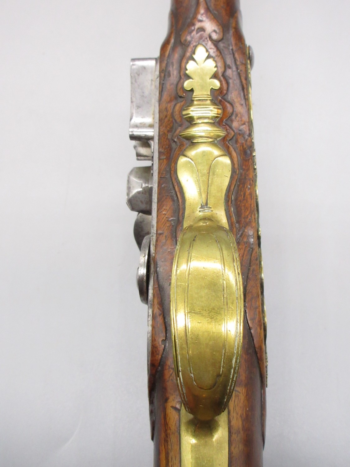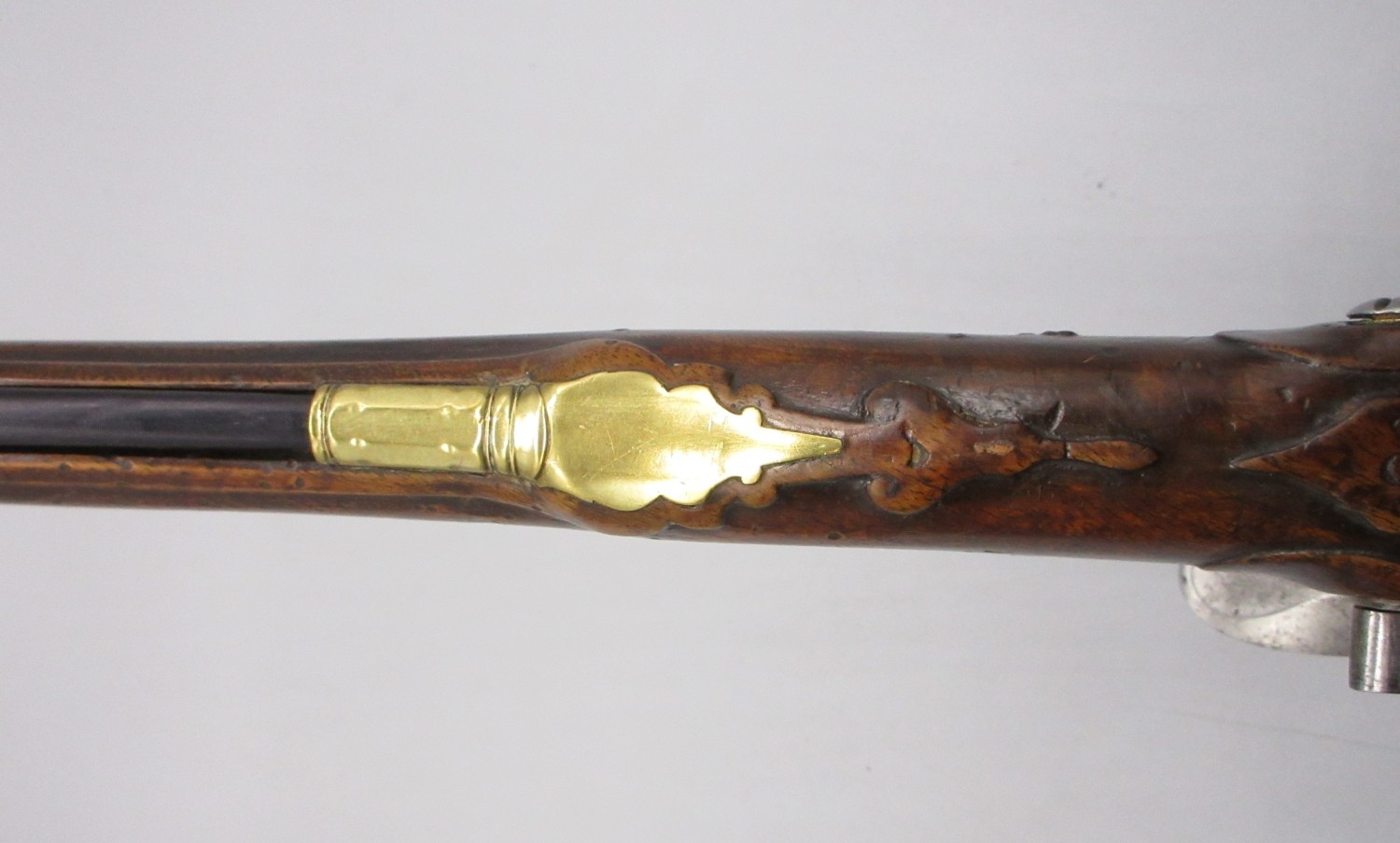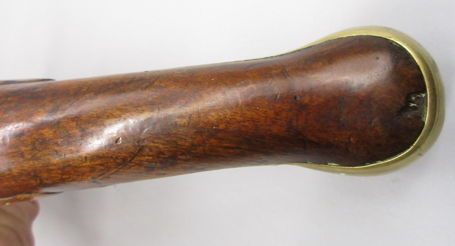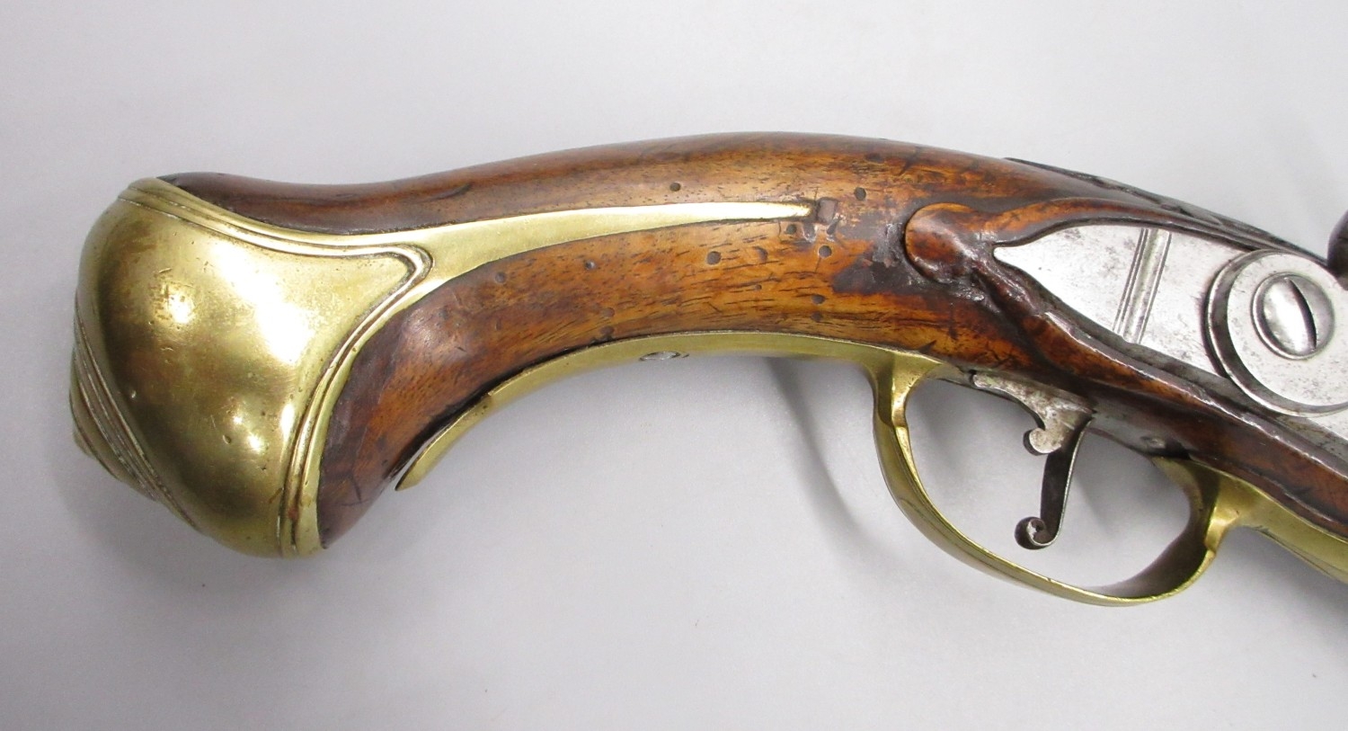 Pair of long barreled 22 bore flintlock pistols, 14" barrels with fixed fore sights, engraved `H.S.N 39 and 40' stamped `Cartie', brass mounts and un-named locks, complete with ramrods, 56cm overall (stock cracked on one)