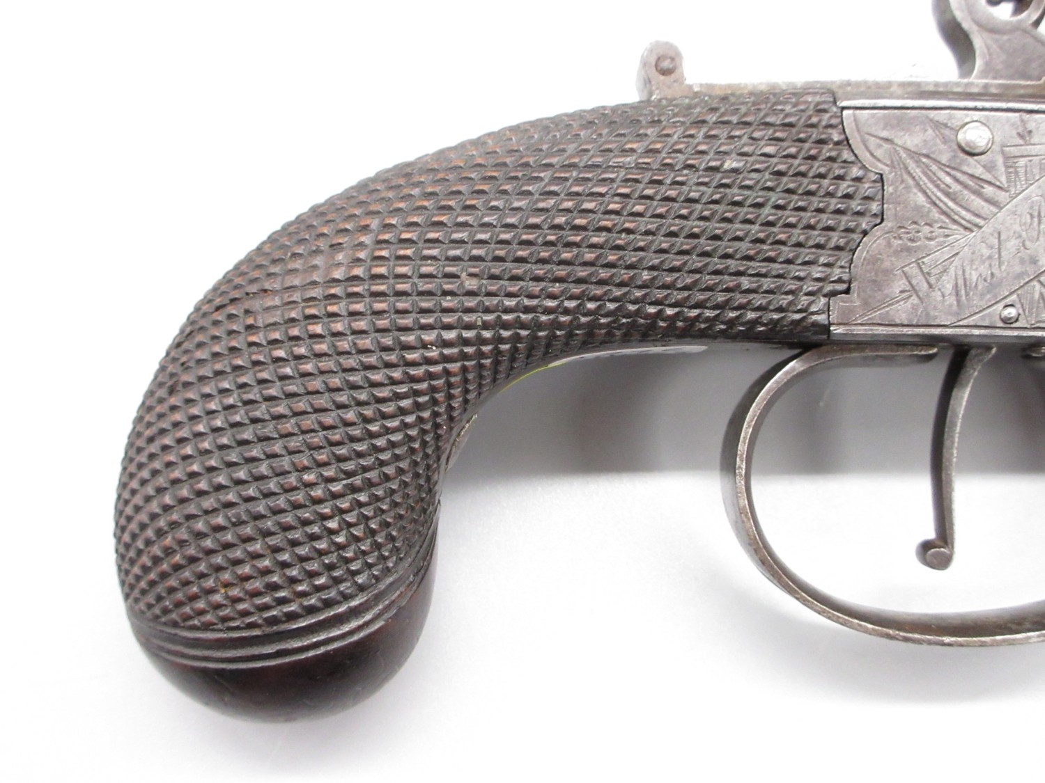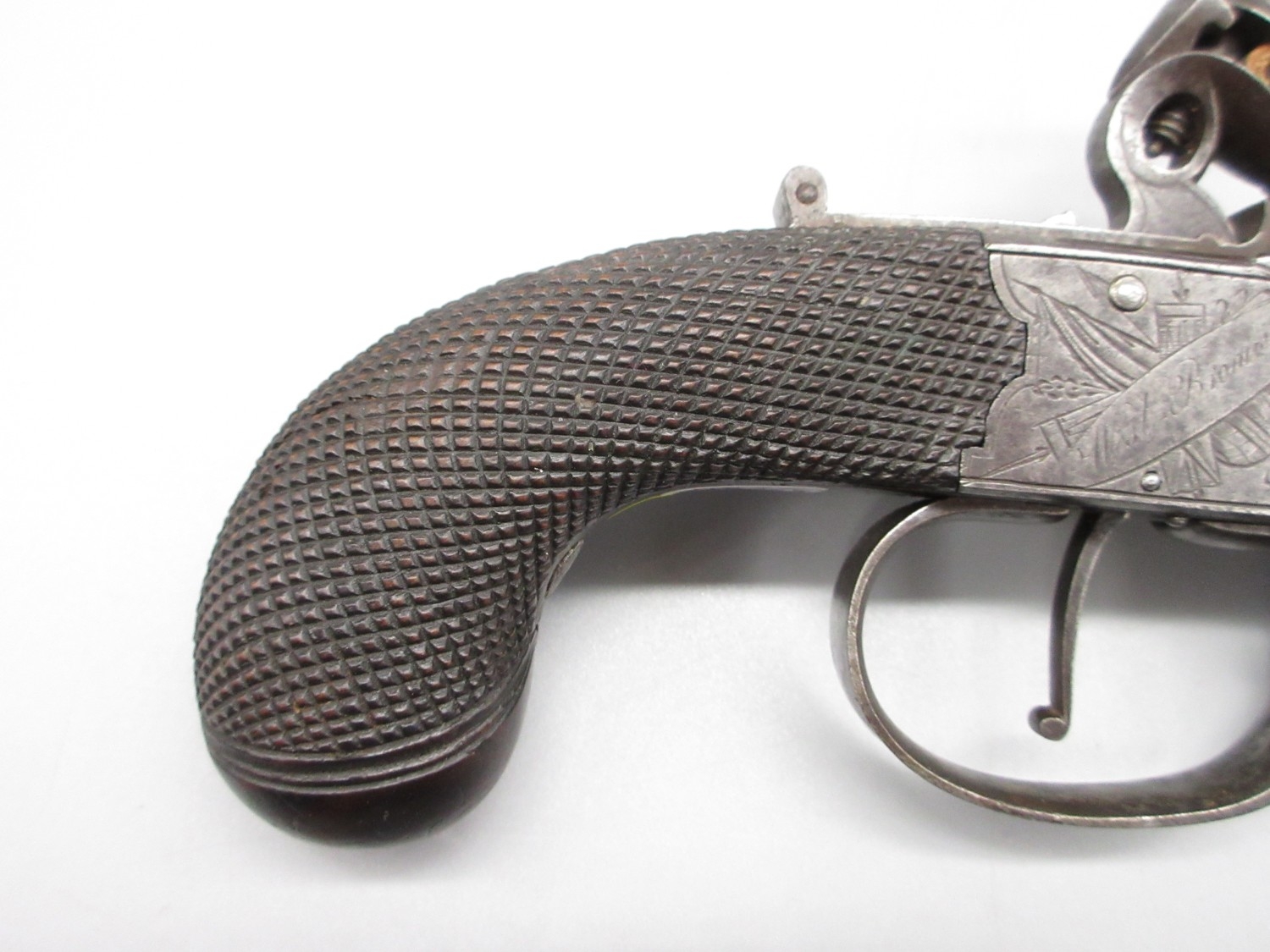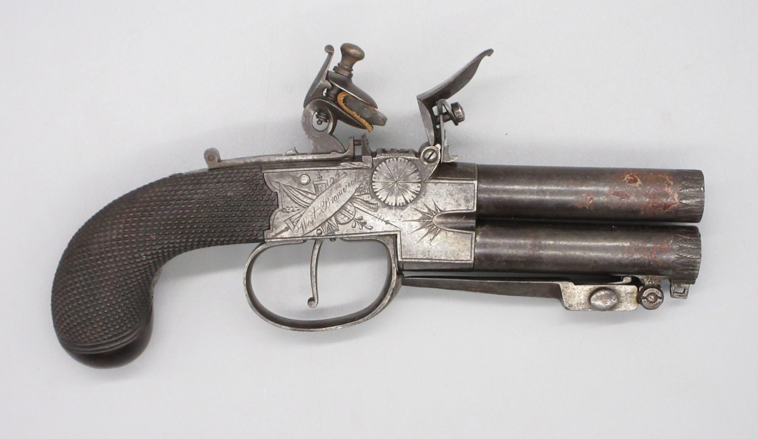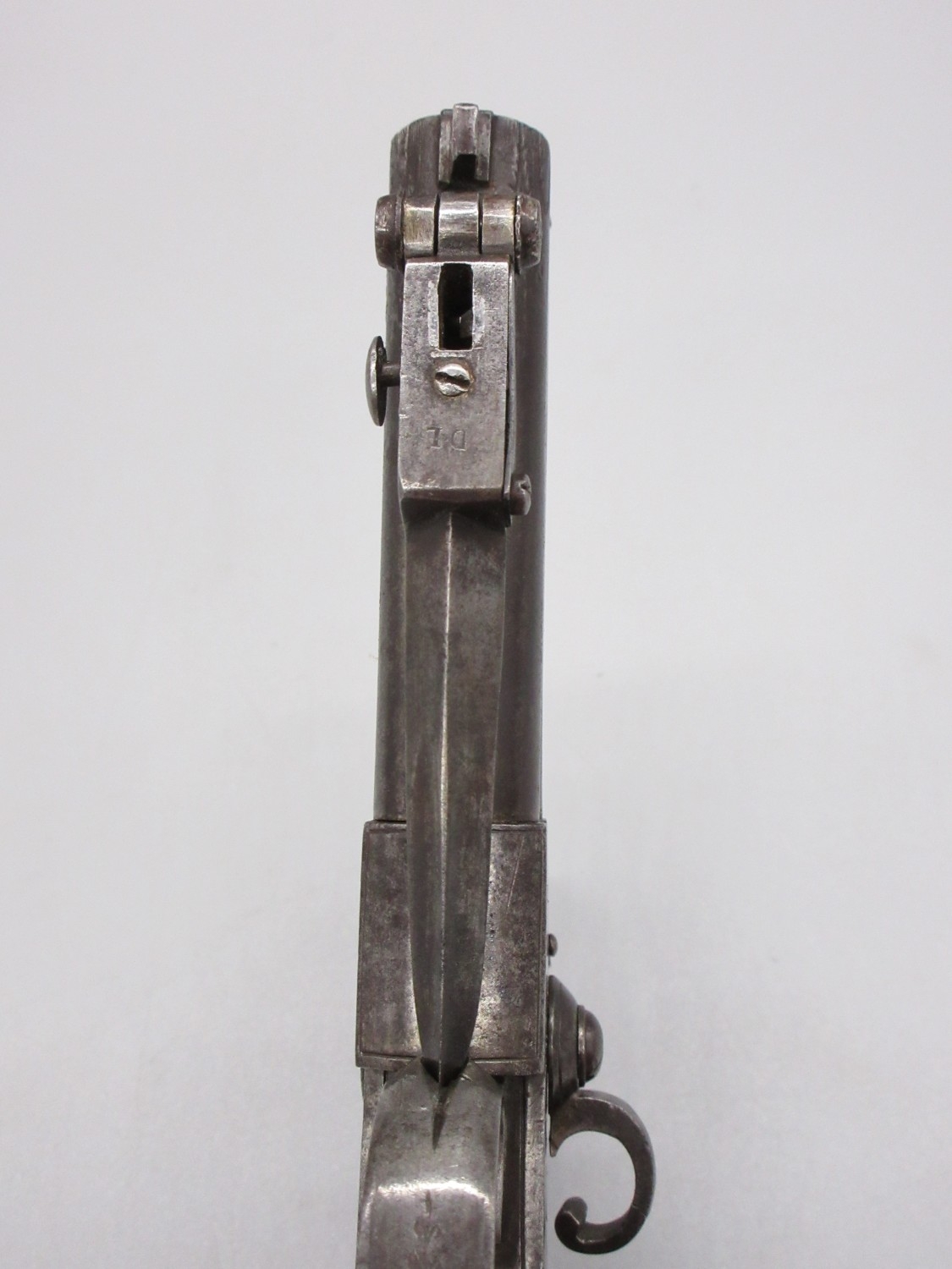 54 bore flintlock tap-action over and under pocket pistol by `T. Whitehouse West Bromwich' 2.75" turn off barrels with star cut muzzles, 2" sprung bayonet with trigger guard release, stamped proof marks and engraved makers details to the lock, top slide safety, 21cm overall.