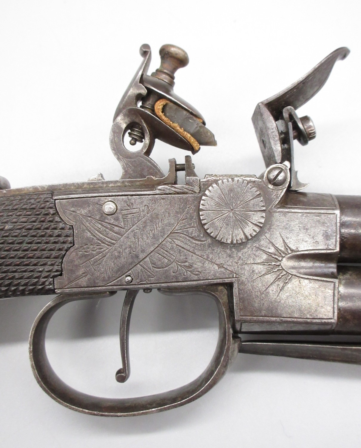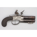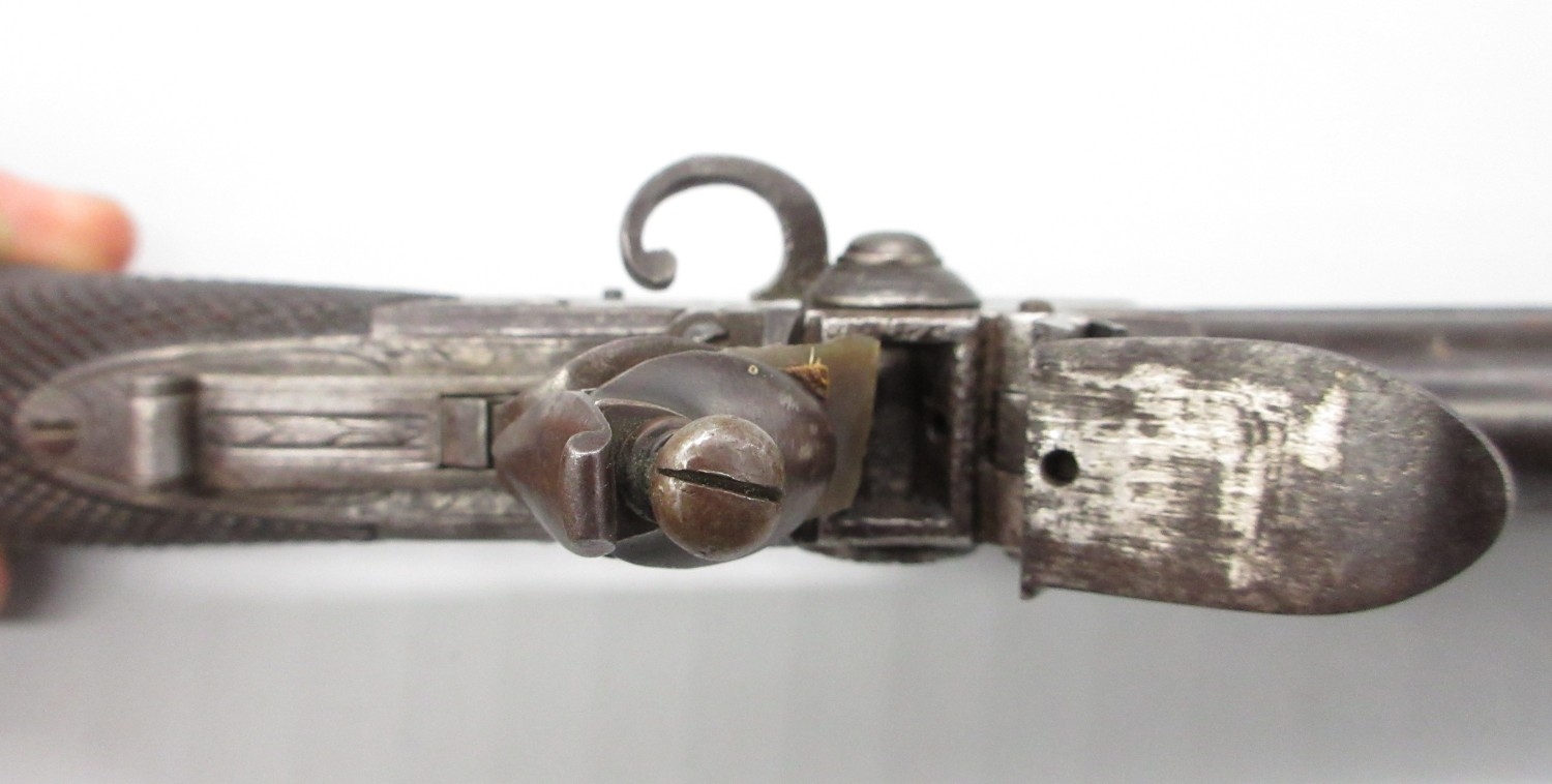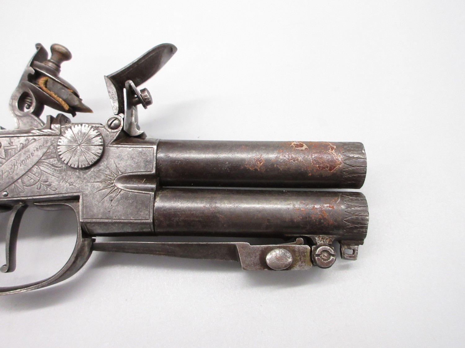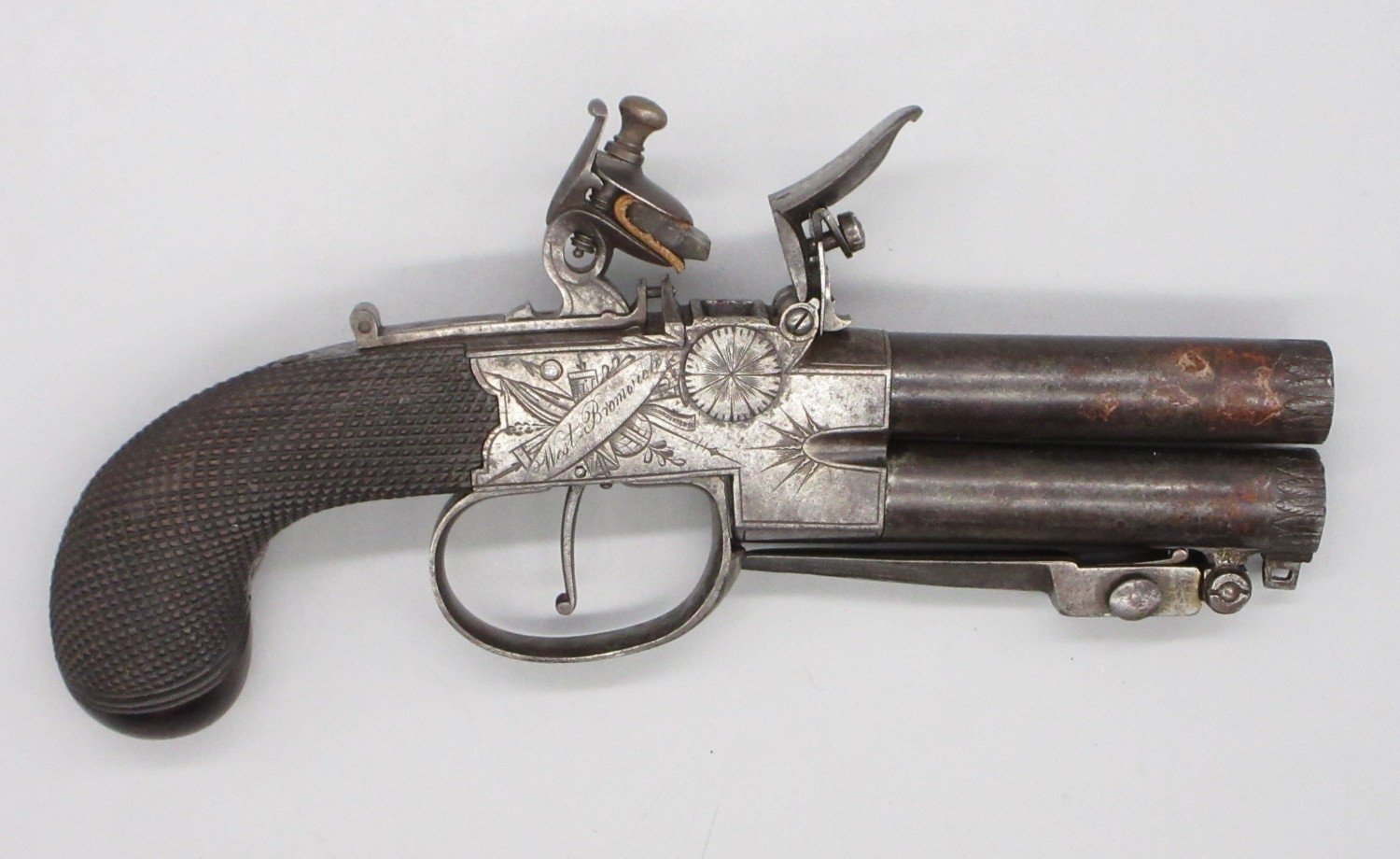 54 bore flintlock tap-action over and under pocket pistol by `T. Whitehouse West Bromwich' 2.75" turn off barrels with star cut muzzles, 2" sprung bayonet with trigger guard release, stamped proof marks and engraved makers details to the lock, top slide safety, 21cm overall.