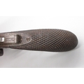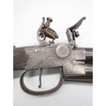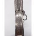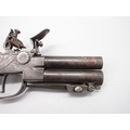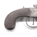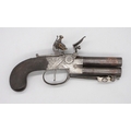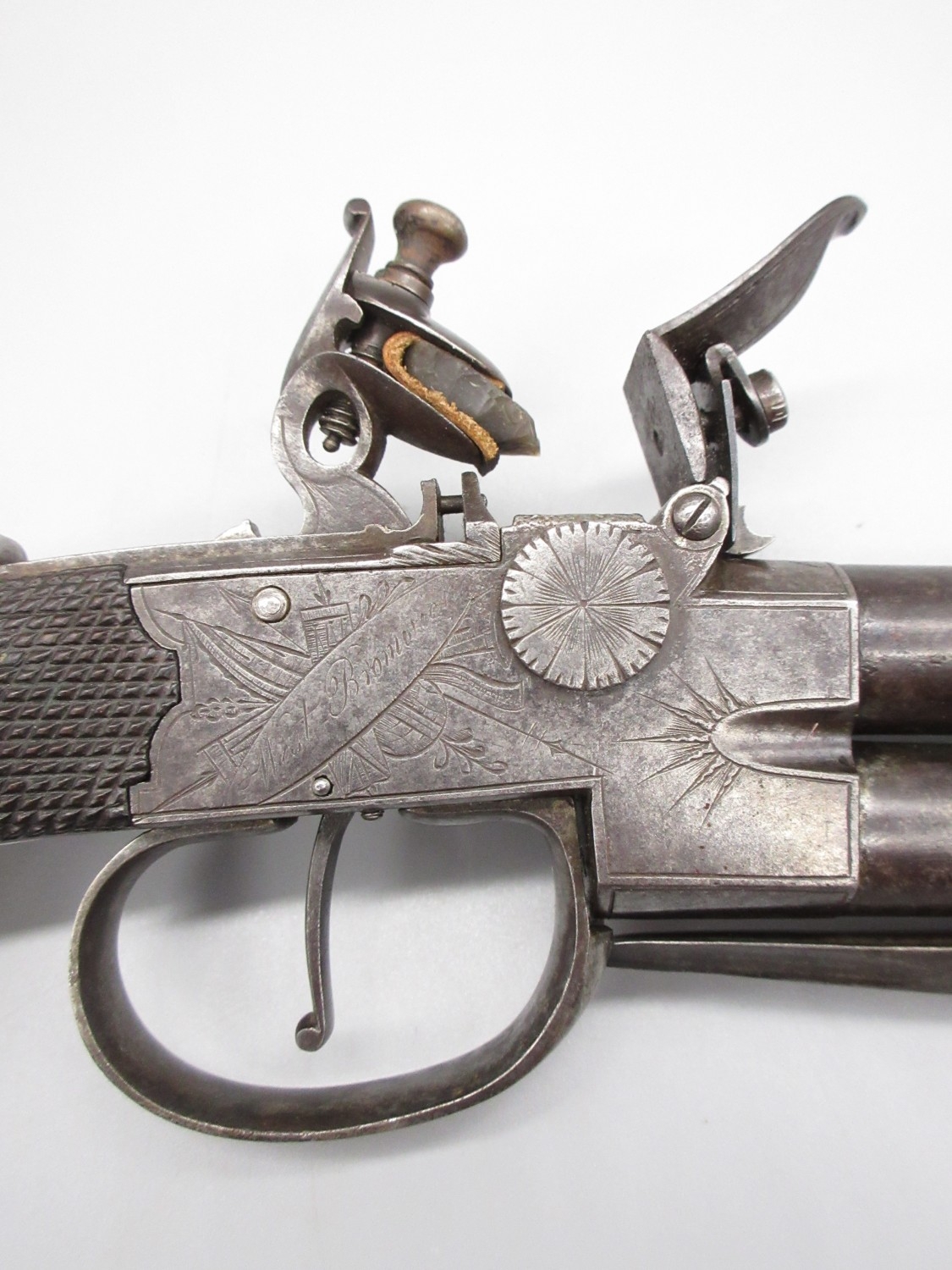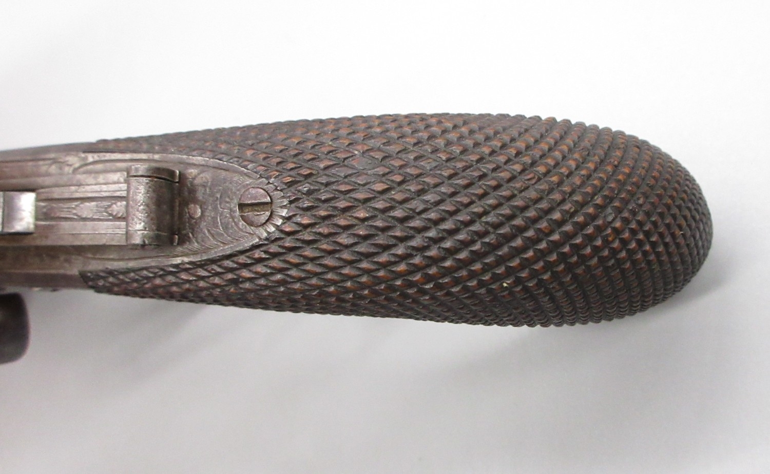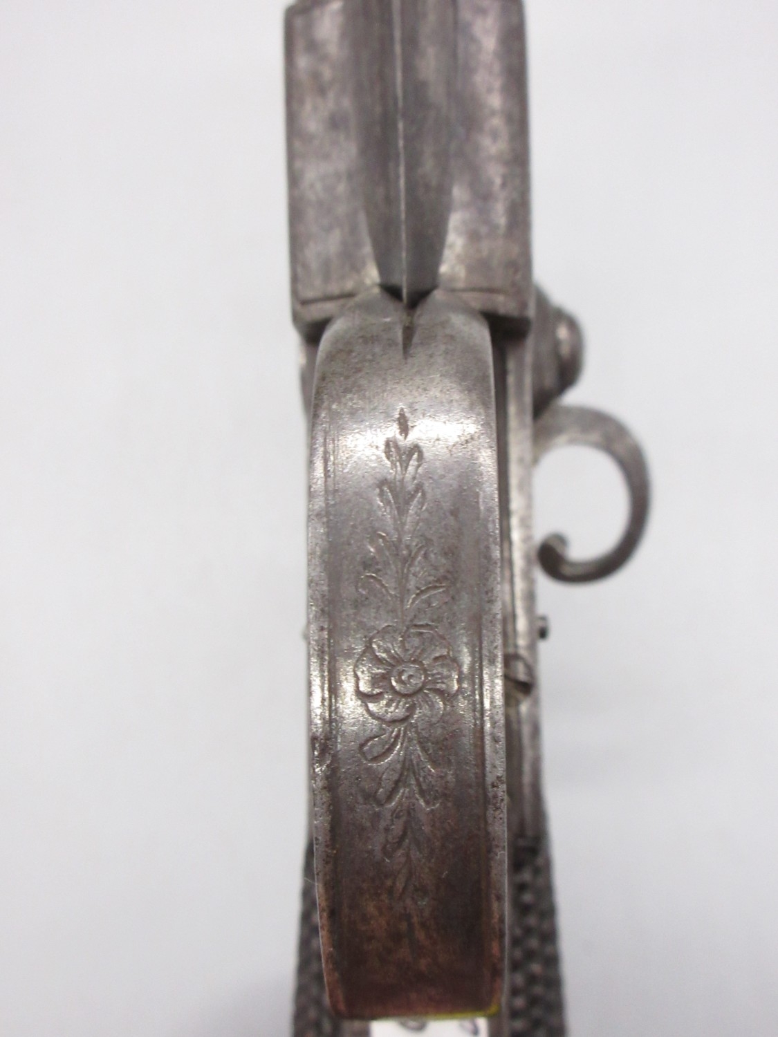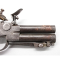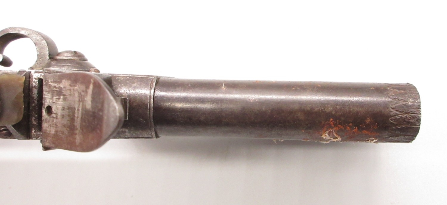 54 bore flintlock tap-action over and under pocket pistol by `T. Whitehouse West Bromwich' 2.75" turn off barrels with star cut muzzles, 2" sprung bayonet with trigger guard release, stamped proof marks and engraved makers details to the lock, top slide safety, 21cm overall.