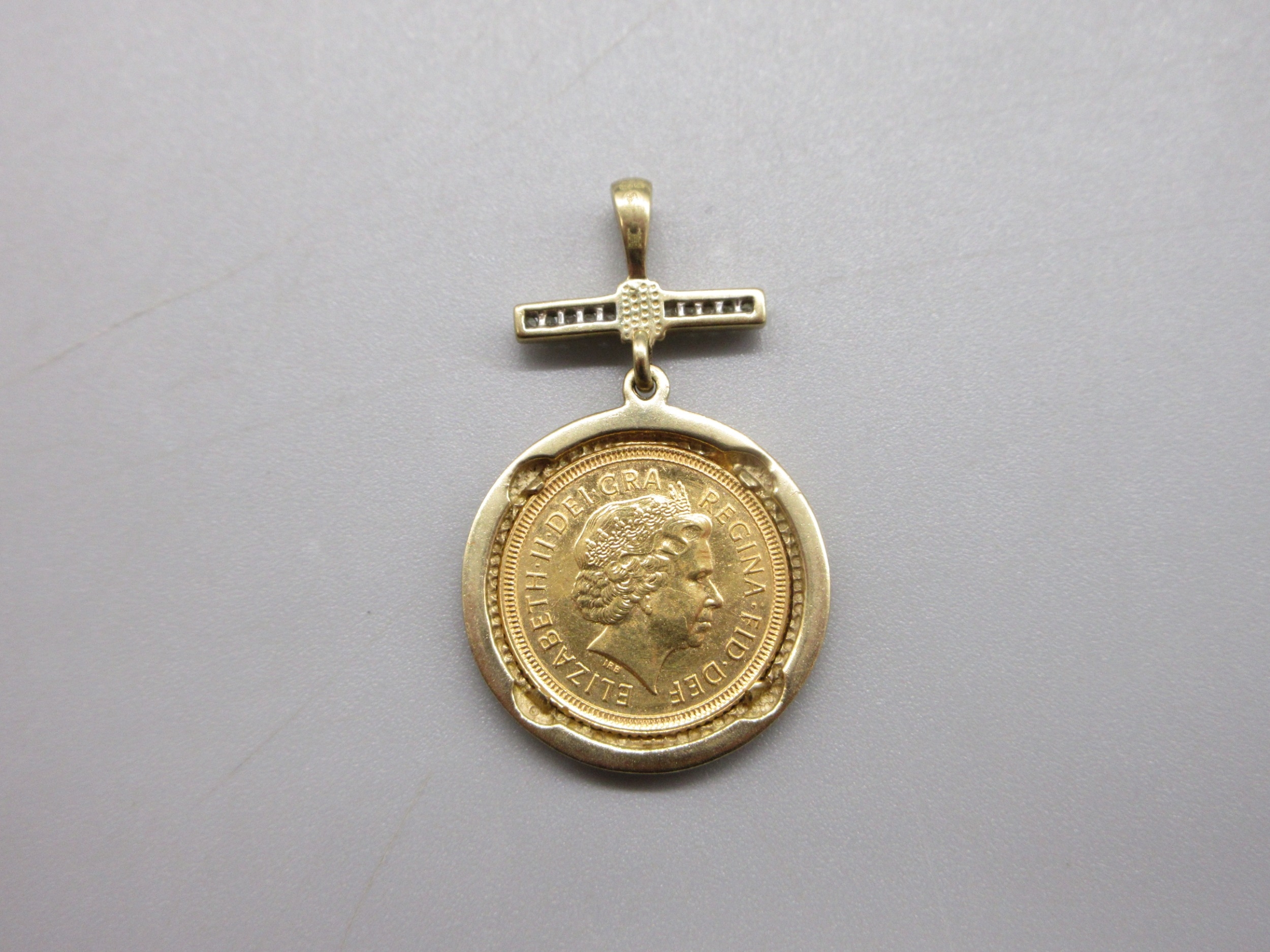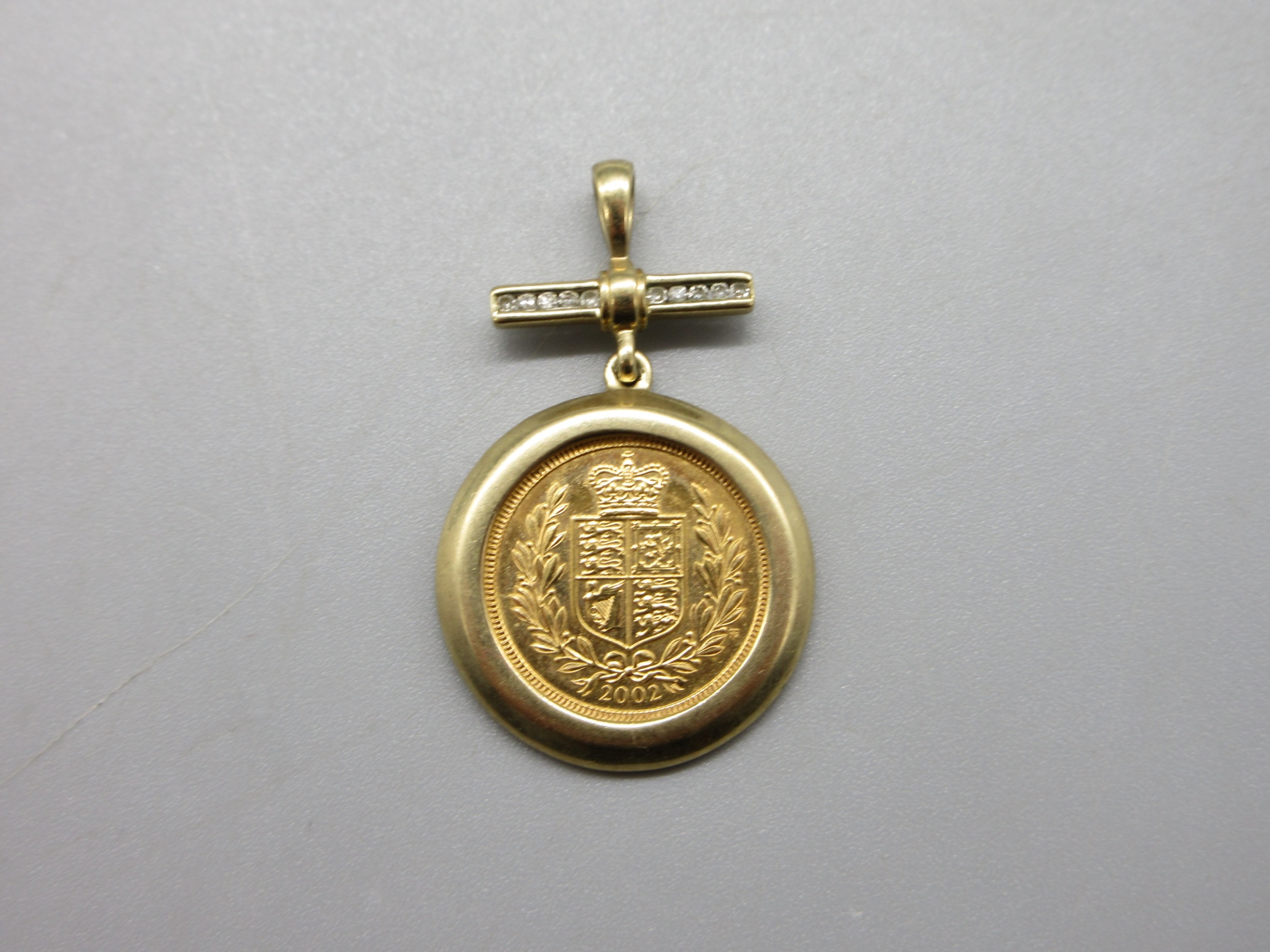 Queen Elizabeth (1952-2022) 2002 Half-Sovereign in yellow metal mount with 9ct hallmarked hoop link set with 10 Diamonds (5 a side) (8.6g)