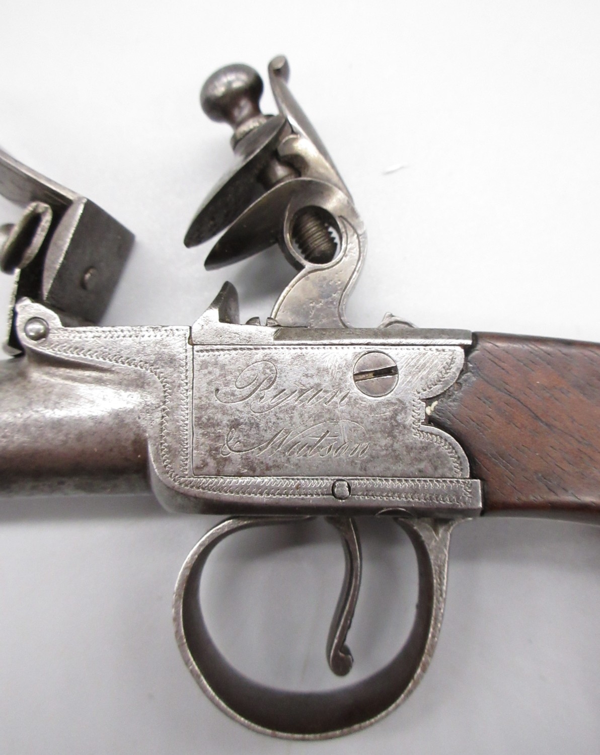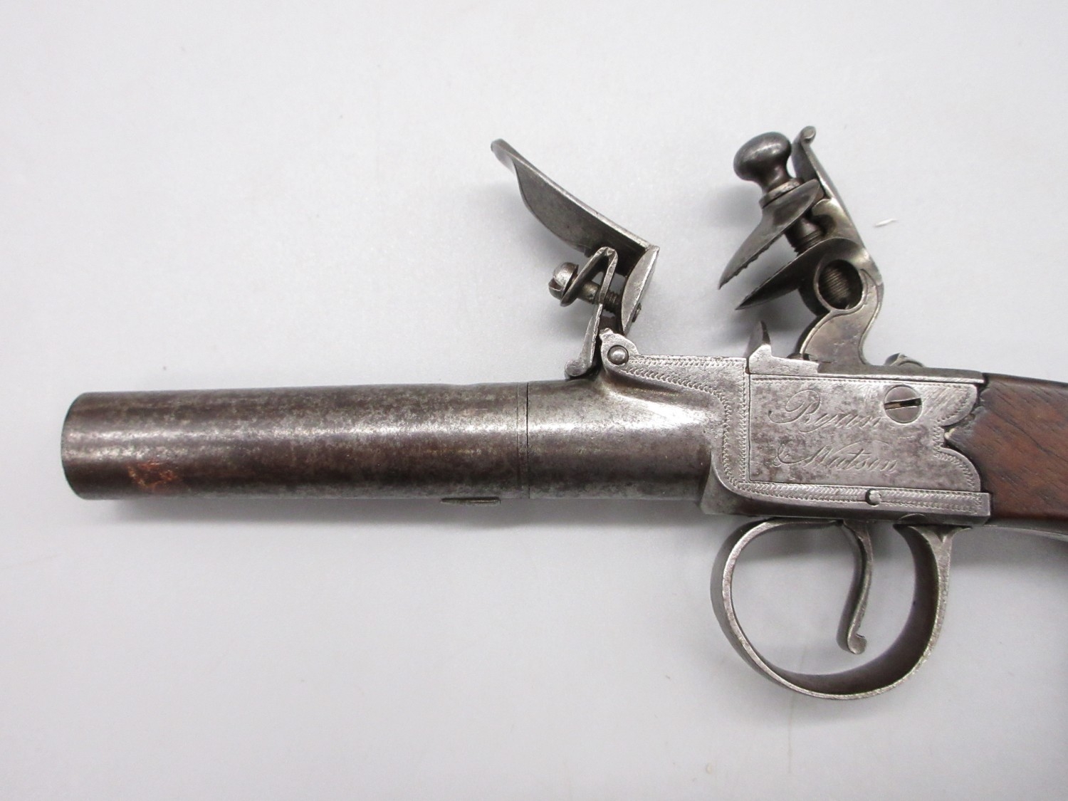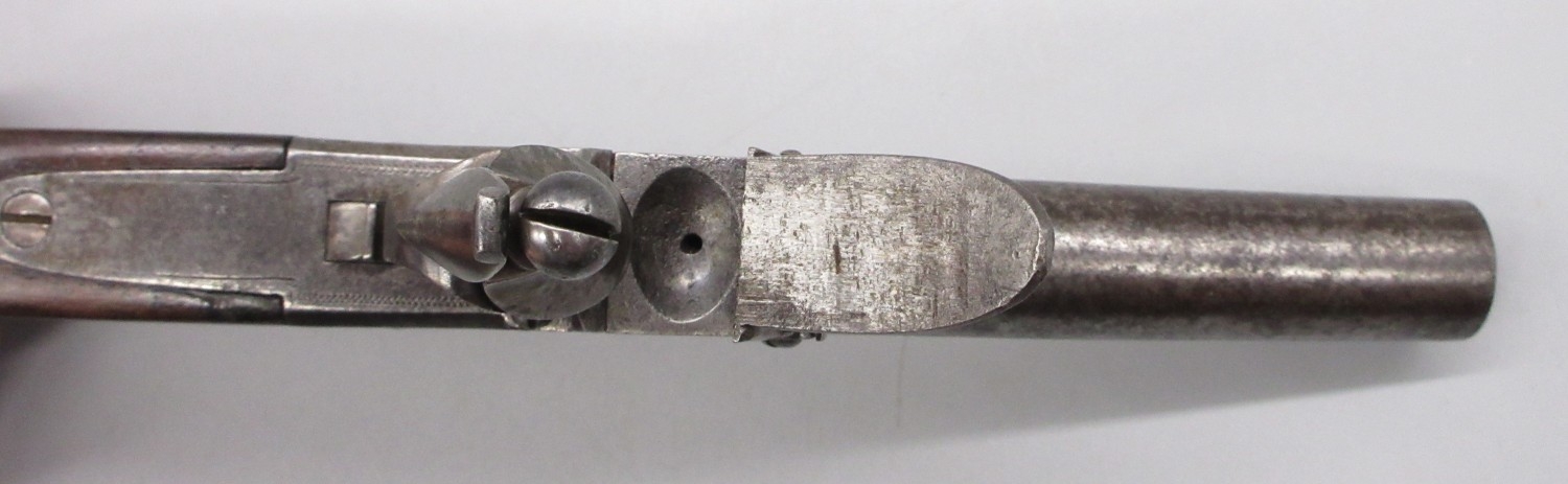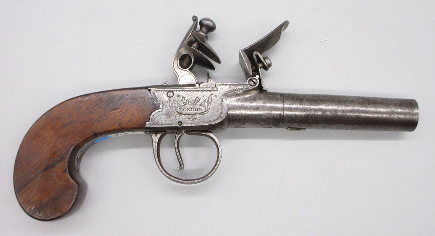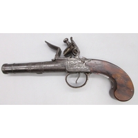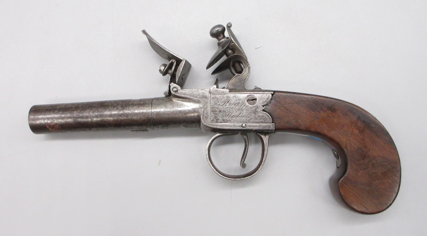 18th Century flintlock 54 bore pocket pistol by `Ryan & Watson London' 2.5" turn-off barrel, stamped proof marks, named lock, 18cm overall.