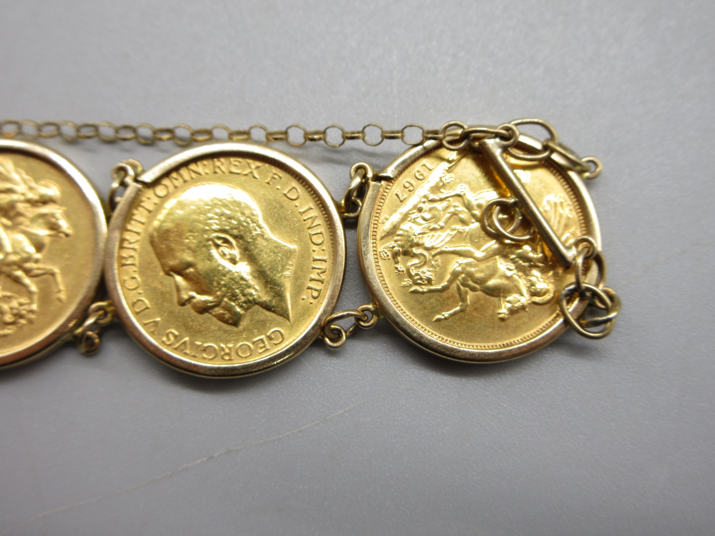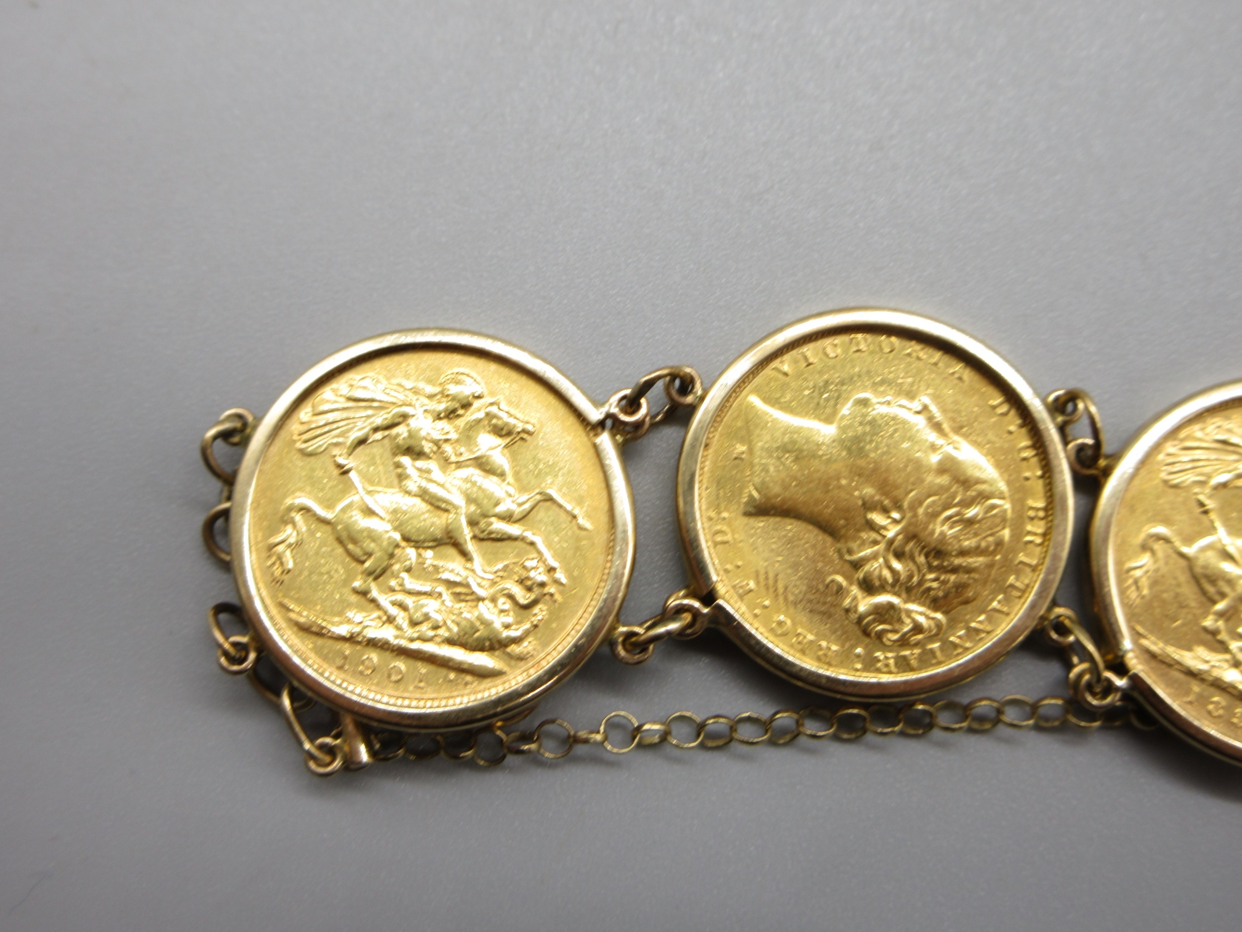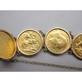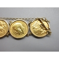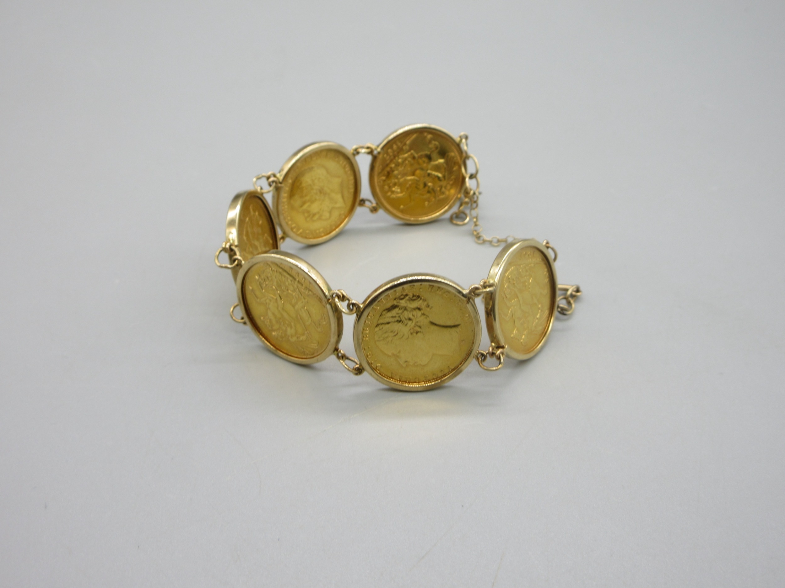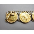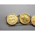 Six sovereigns in 9k/.375 stamped bracelet mounts comprising 1901 1880 1892 1906 1913 & 1967 (56.8g)