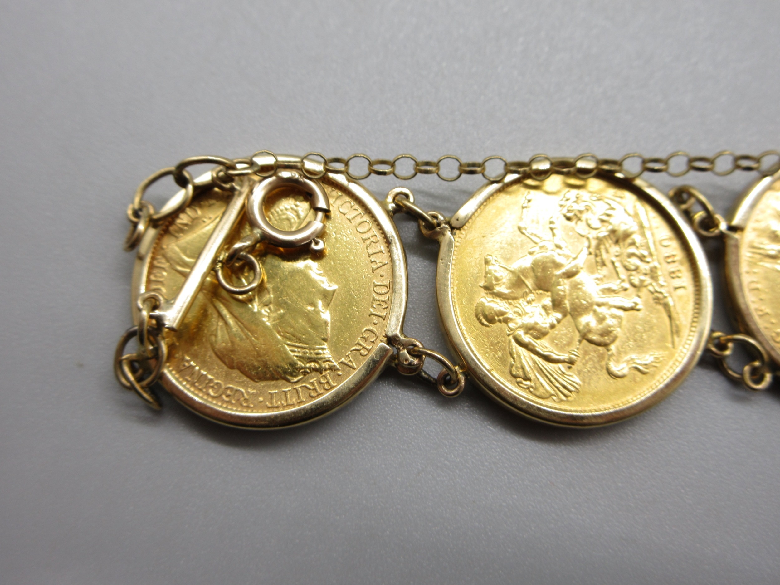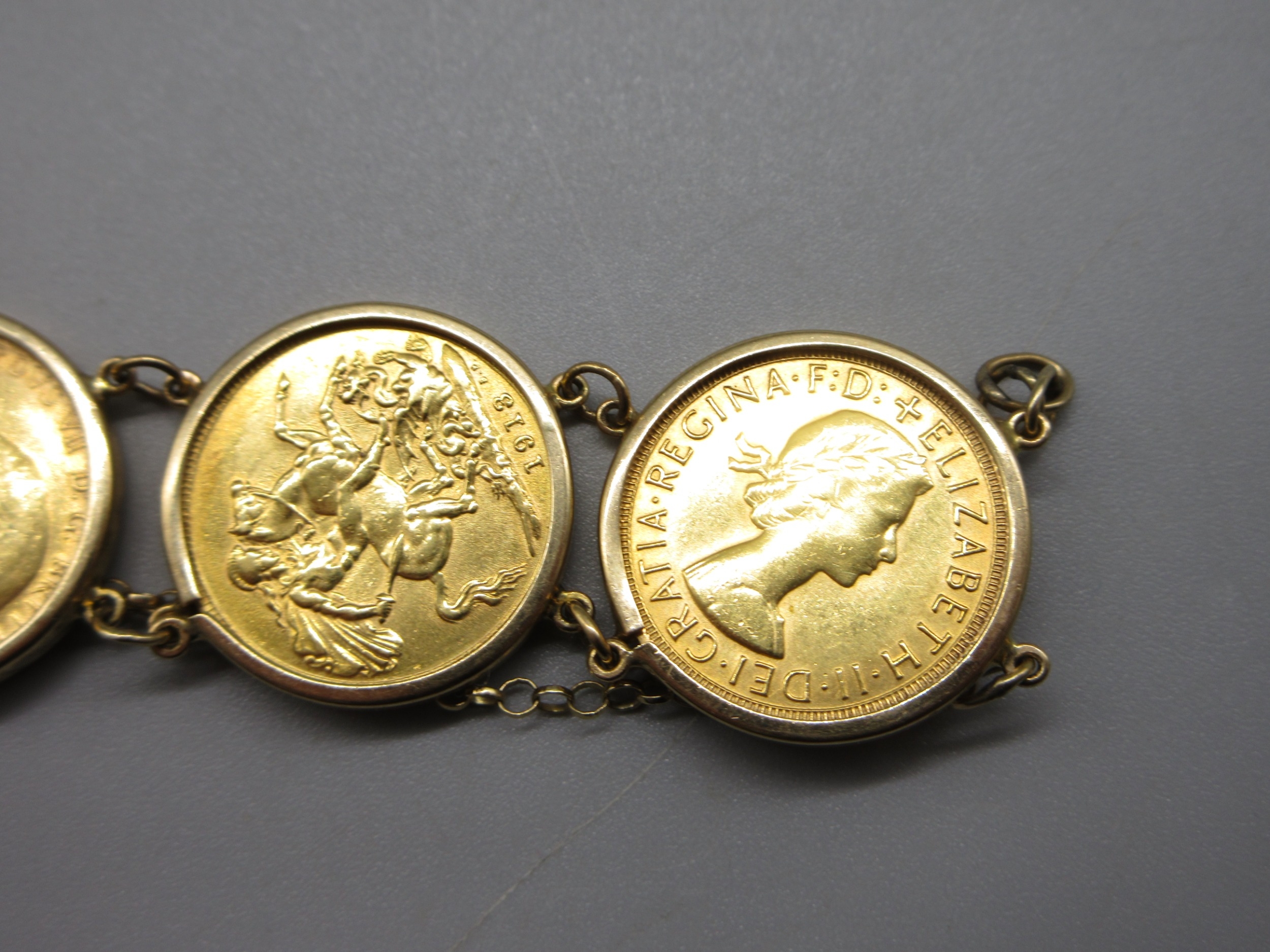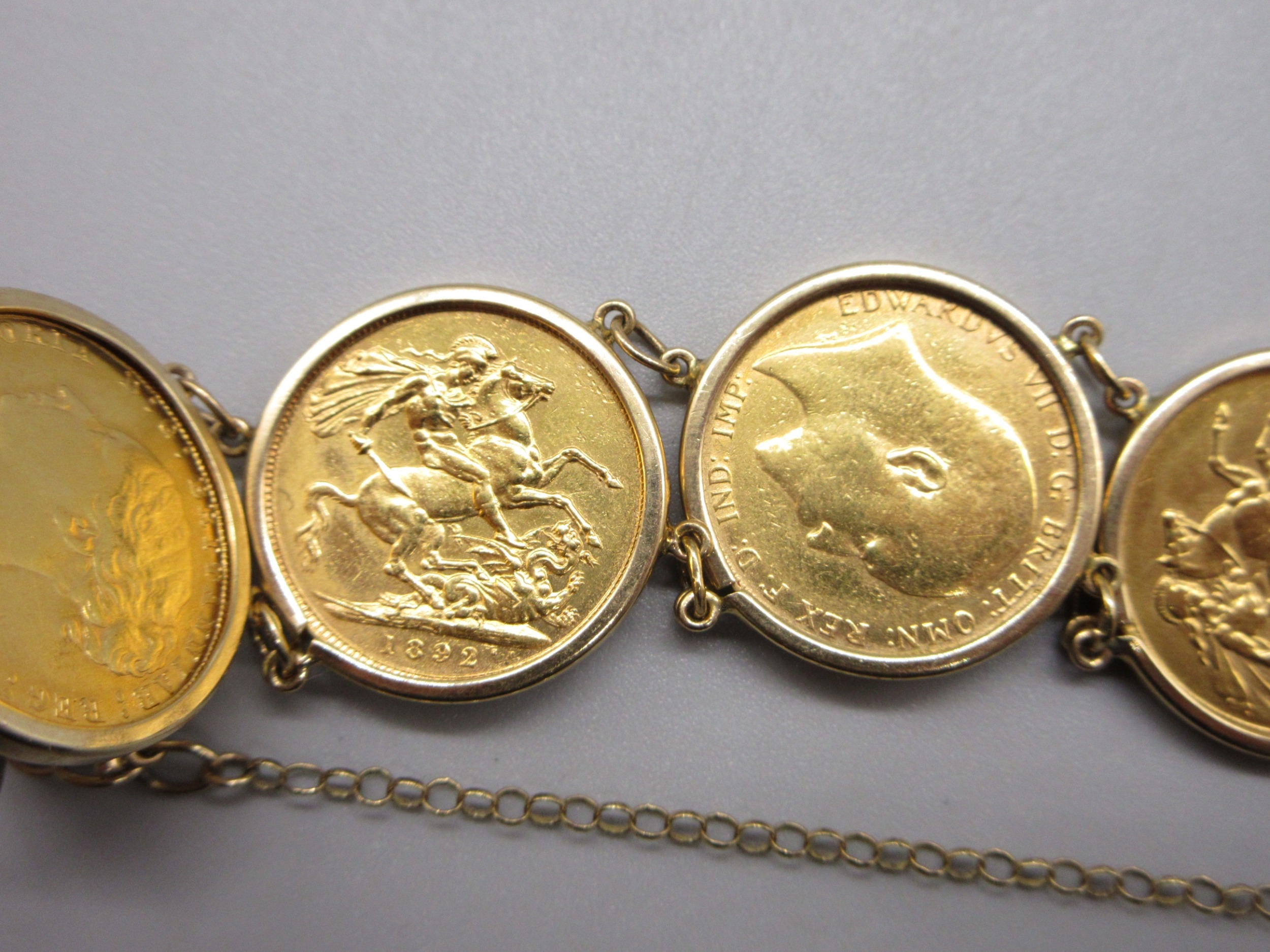 Six sovereigns in 9k/.375 stamped bracelet mounts comprising 1901 1880 1892 1906 1913 & 1967 (56.8g)